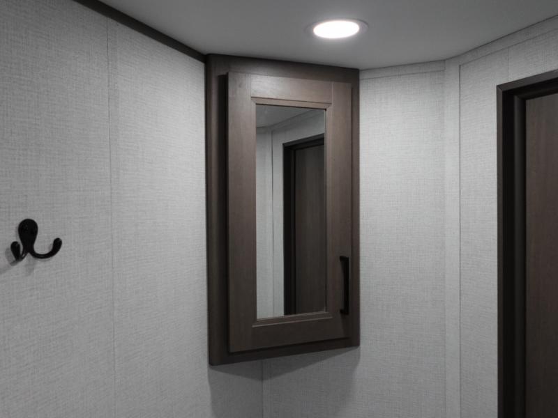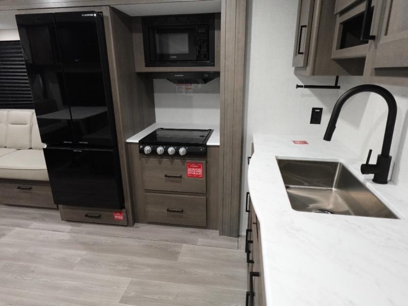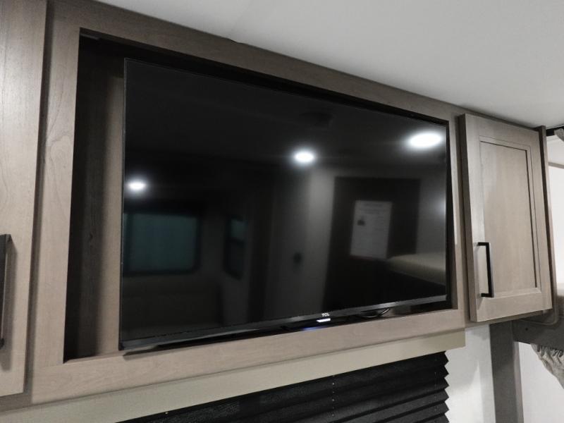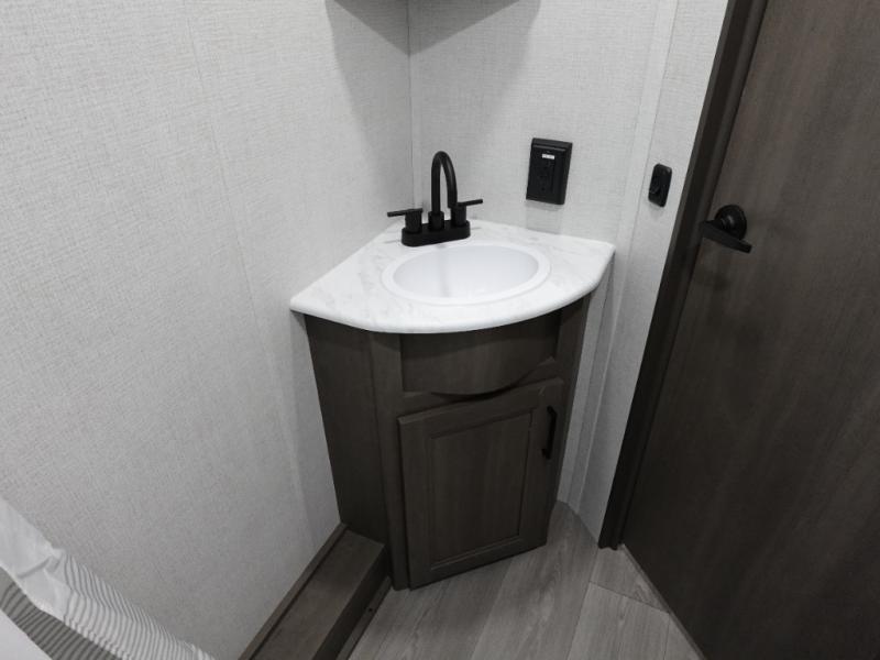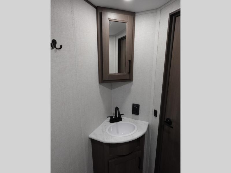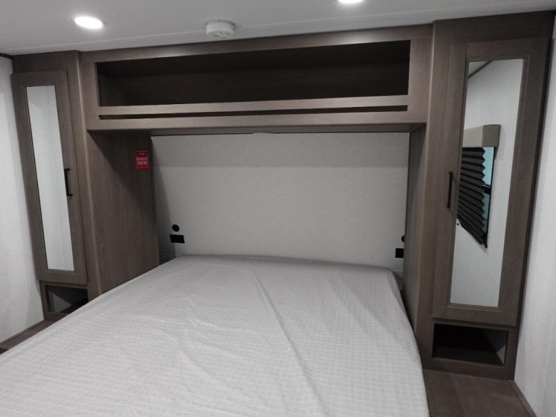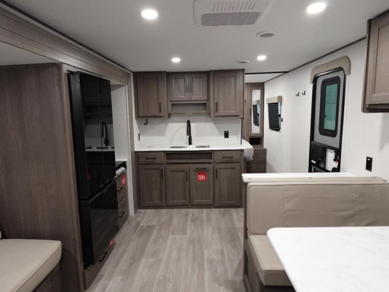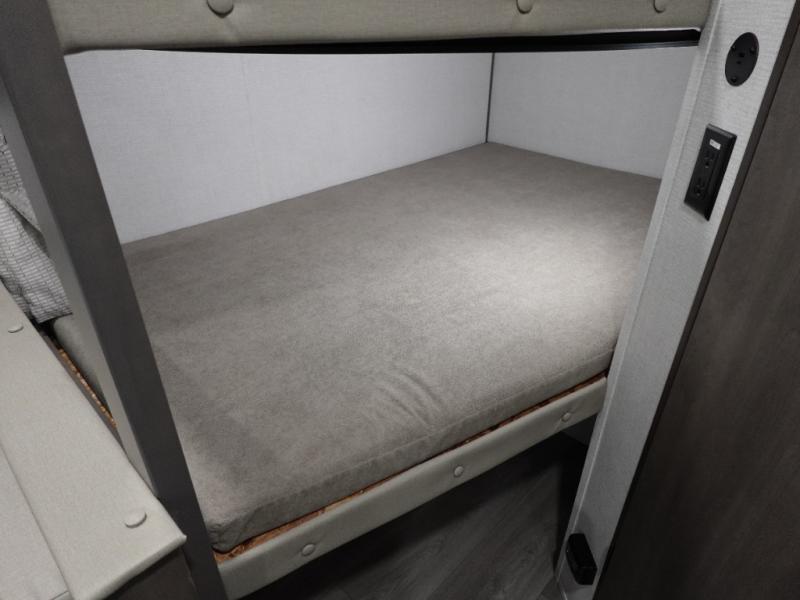 Camping with your larger family or when you want to take along a few extra friends is easy with this trailer. This unit sleeps nine with the double-size bunks in the rear corner, the 60" roll over sofa, and the queen bed in the front semi-private bedroom. The booth dinette can also be used to sleep a guest or two little ones at night once converted. Prepare your meals on the three-burner cooktop indoors, or out on the two-burner cooktop at the outside kitchen! You'll also find a handy exterior spray port and an outdoor refrigerator for cold drinks! It will be so easy to fill the dog's food bowl with the added pet dish under the refrigerator, and the full bath in this model means you don't have to use the camp's facilities. Having a 17' awning outside along with a large unobstructed pass-through compartment allows you extended living outdoors and plenty of space for all of your gear!