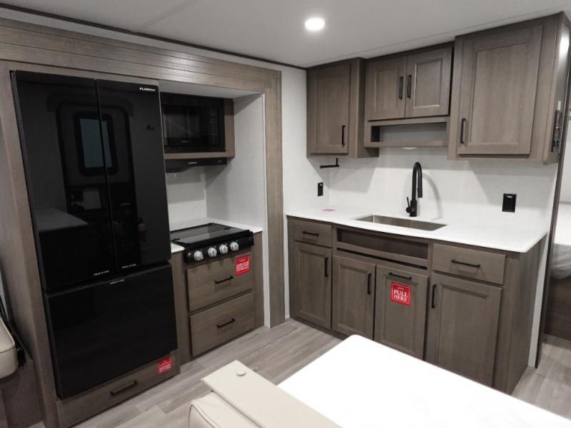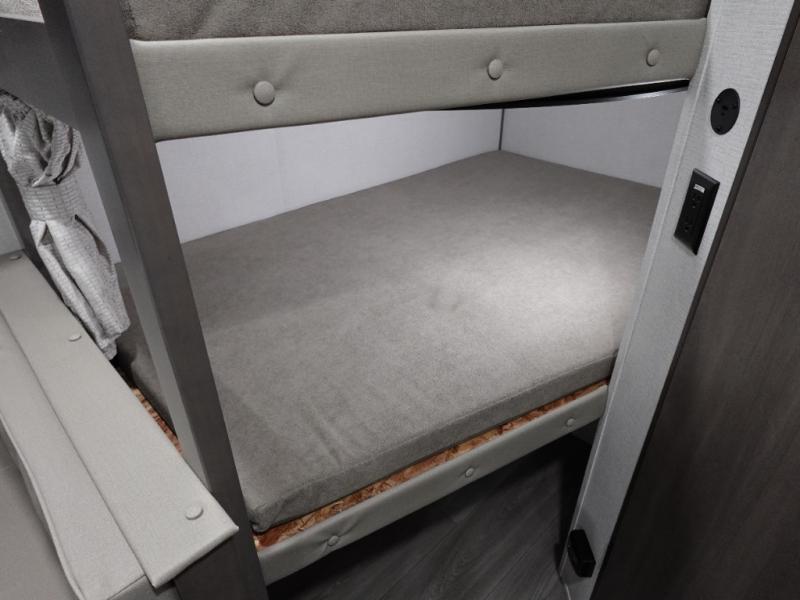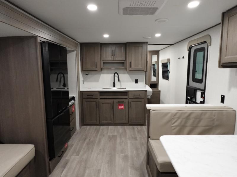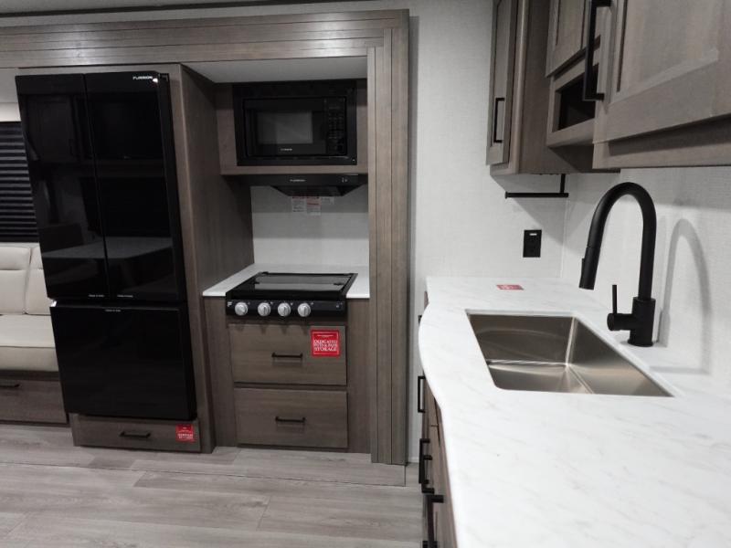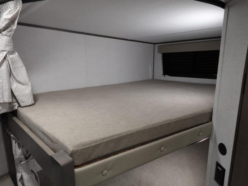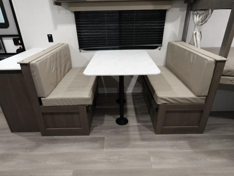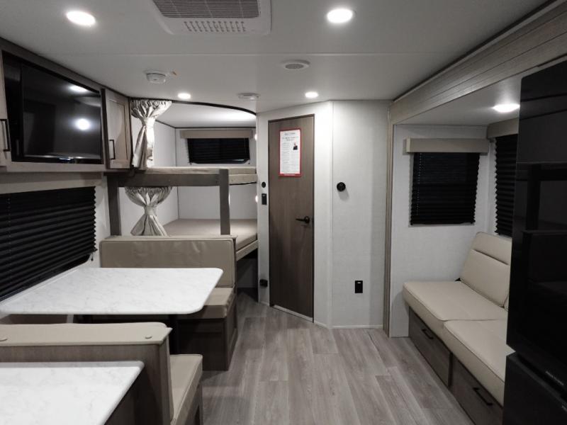 Camping with your larger family or when you want to take along a few extra friends is easy with this trailer. This unit sleeps nine with the double-size bunks in the rear corner, the 60" roll over sofa, and the queen bed in the front semi-private bedroom. The booth dinette can also be used to sleep a guest or two little ones at night once converted. Prepare your meals on the three-burner cooktop indoors, or out on the two-burner cooktop at the outside kitchen! You'll also find a handy exterior spray port and an outdoor refrigerator for cold drinks! It will be so easy to fill the dog's food bowl with the added pet dish under the refrigerator, and the full bath in this model means you don't have to use the camp's facilities. Having a 17' awning outside along with a large unobstructed pass-through compartment allows you extended living outdoors and plenty of space for all of your gear!