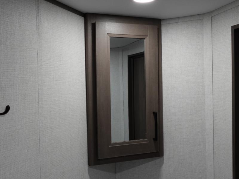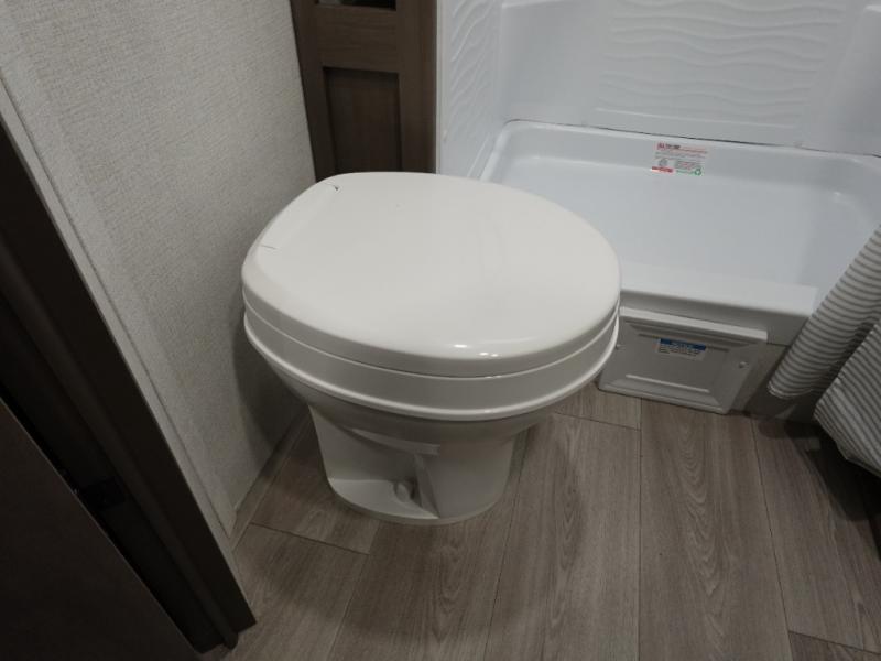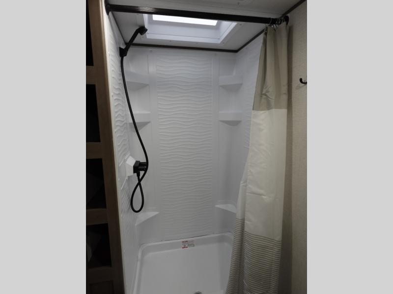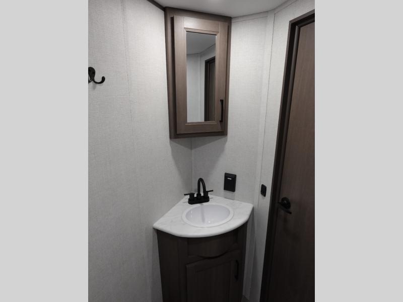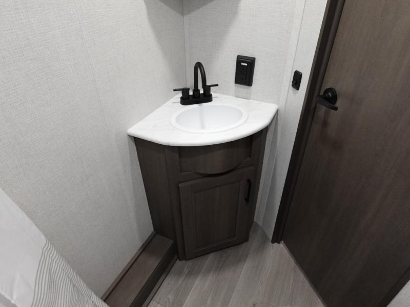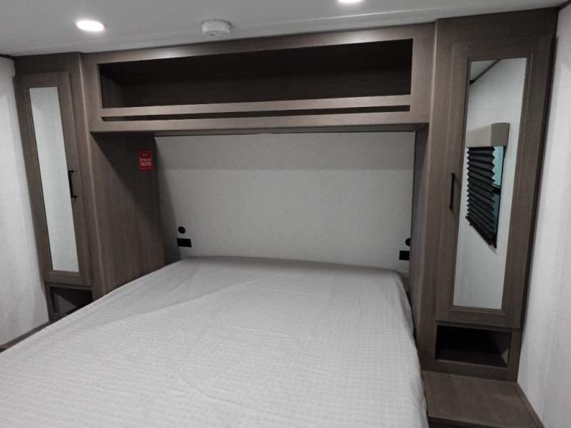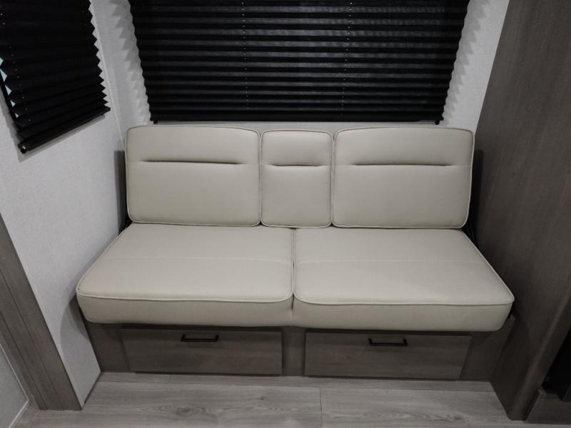 Camping with your larger family or when you want to take along a few extra friends is easy with this trailer. This unit sleeps nine with the double-size bunks in the rear corner, the 60" roll over sofa, and the queen bed in the front semi-private bedroom. The booth dinette can also be used to sleep a guest or two little ones at night once converted. Prepare your meals on the three-burner cooktop indoors, or out on the two-burner cooktop at the outside kitchen! You'll also find a handy exterior spray port and an outdoor refrigerator for cold drinks! It will be so easy to fill the dog's food bowl with the added pet dish under the refrigerator, and the full bath in this model means you don't have to use the camp's facilities. Having a 17' awning outside along with a large unobstructed pass-through compartment allows you extended living outdoors and plenty of space for all of your gear!