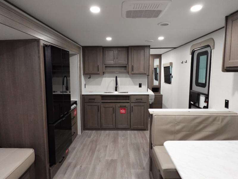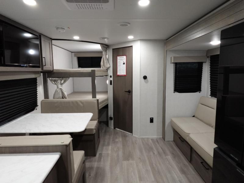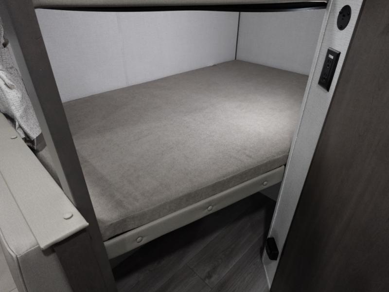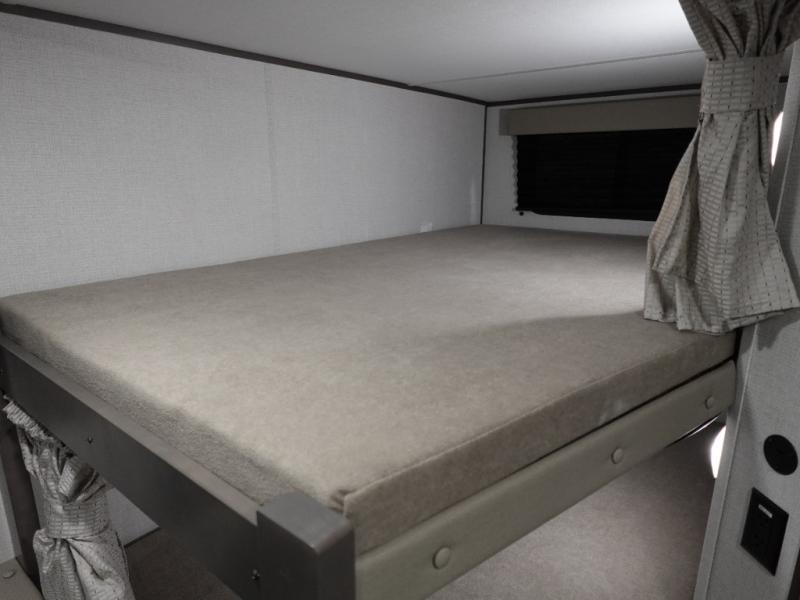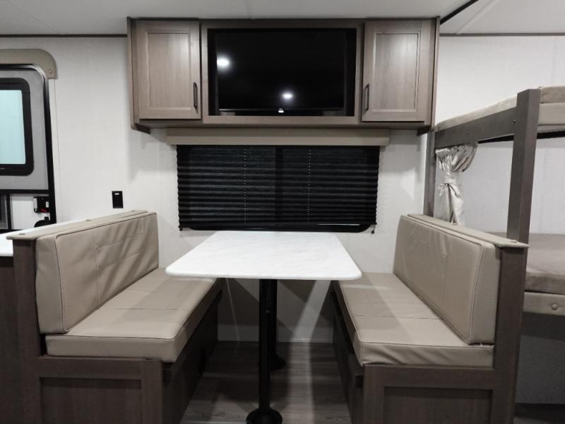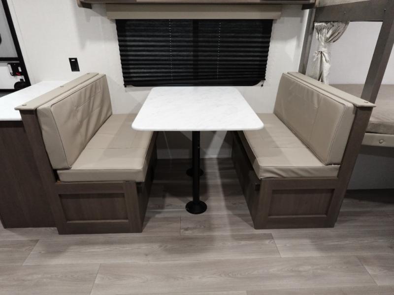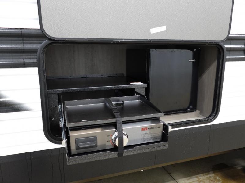 Camping with your larger family or when you want to take along a few extra friends is easy with this trailer. This unit sleeps nine with the double-size bunks in the rear corner, the 60" roll over sofa, and the queen bed in the front semi-private bedroom. The booth dinette can also be used to sleep a guest or two little ones at night once converted. Prepare your meals on the three-burner cooktop indoors, or out on the two-burner cooktop at the outside kitchen! You'll also find a handy exterior spray port and an outdoor refrigerator for cold drinks! It will be so easy to fill the dog's food bowl with the added pet dish under the refrigerator, and the full bath in this model means you don't have to use the camp's facilities. Having a 17' awning outside along with a large unobstructed pass-through compartment allows you extended living outdoors and plenty of space for all of your gear!
