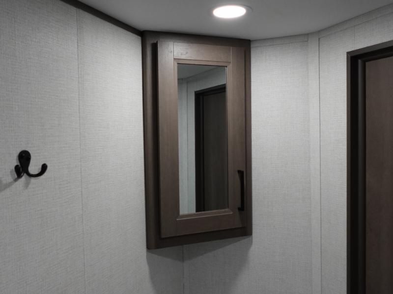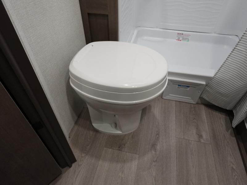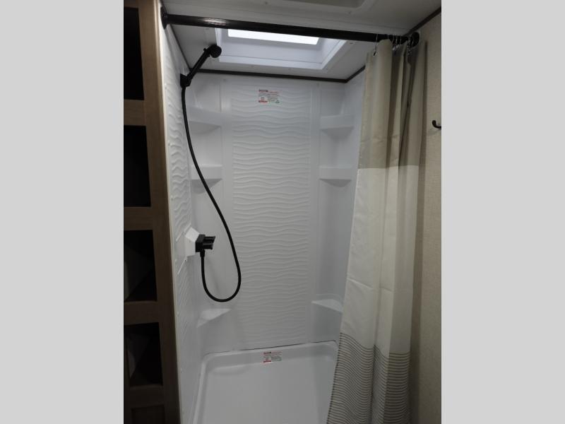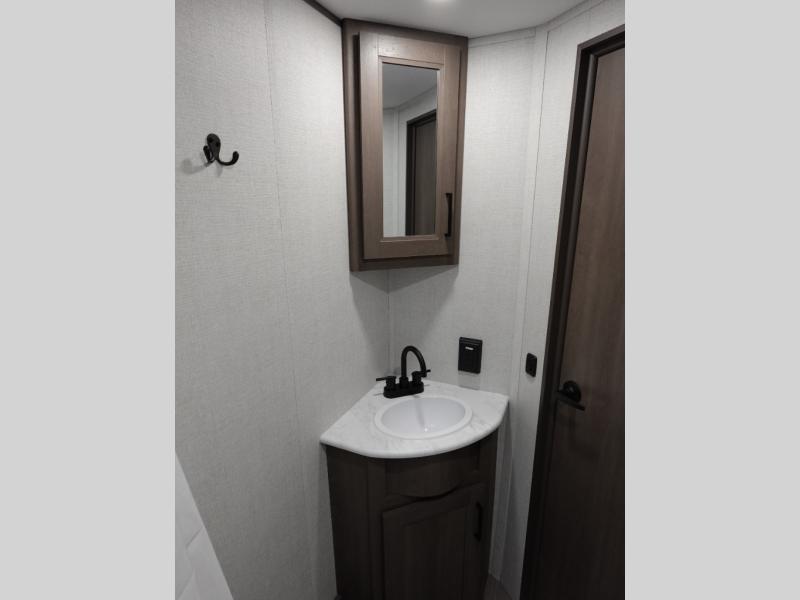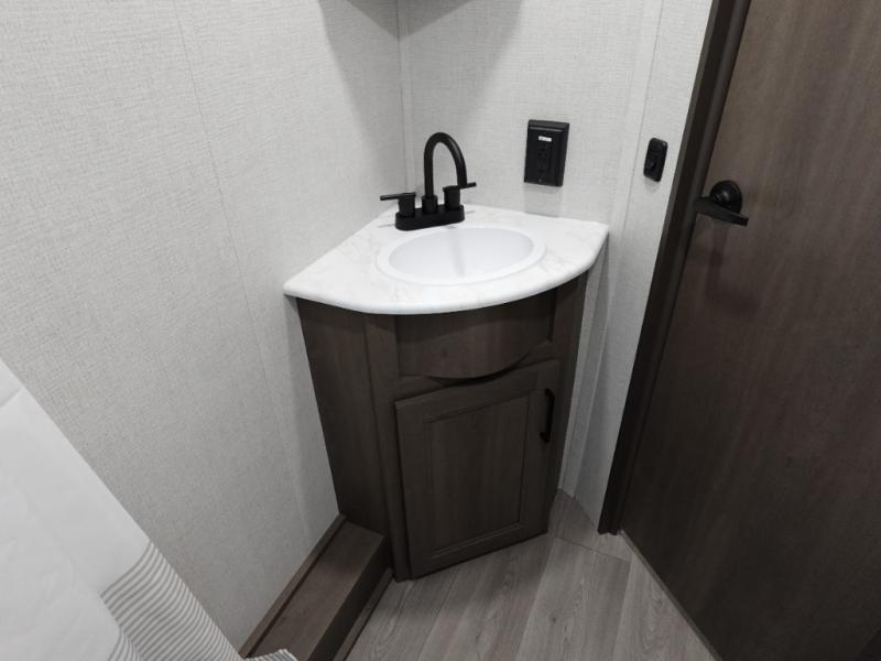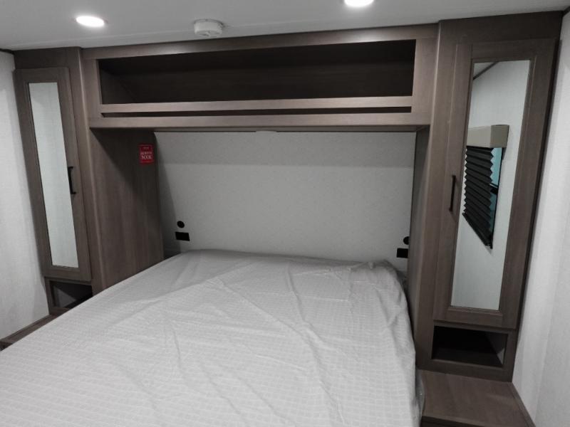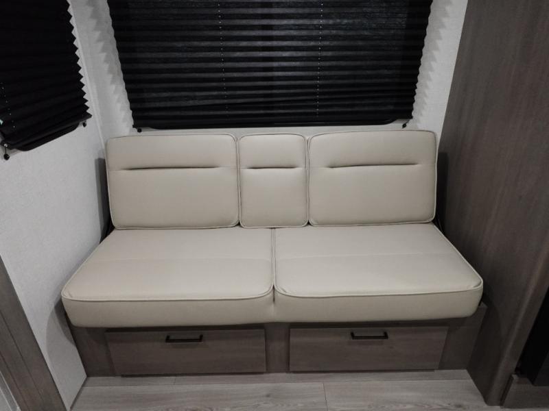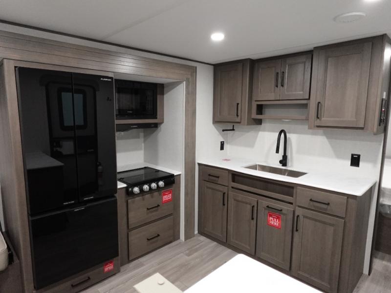 Camping with your larger family or when you want to take along a few extra friends is easy with this trailer. This unit sleeps nine with the double-size bunks in the rear corner, the 60" roll over sofa, and the queen bed in the front semi-private bedroom. The booth dinette can also be used to sleep a guest or two little ones at night once converted. Prepare your meals on the three-burner cooktop indoors, or out on the two-burner cooktop at the outside kitchen! You'll also find a handy exterior spray port and an outdoor refrigerator for cold drinks! It will be so easy to fill the dog's food bowl with the added pet dish under the refrigerator, and the full bath in this model means you don't have to use the camp's facilities. Having a 17' awning outside along with a large unobstructed pass-through compartment allows you extended living outdoors and plenty of space for all of your gear!