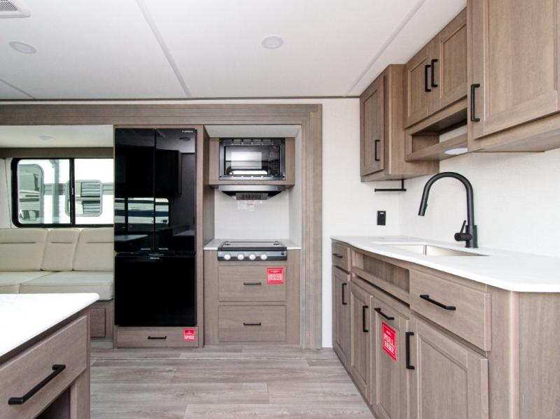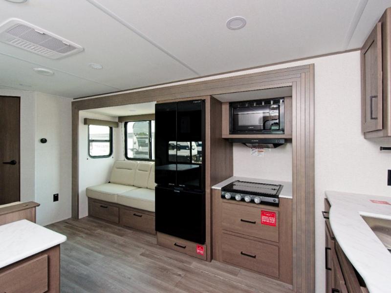 Keep your entryway tidy with the entry counter featuring built-in shoe storage, and enjoy cooking outdoors with the two-burner cooktop, exterior spray port, and outdoor refrigerator. The 17' power awning creates a shaded outdoor living space, while the large pass-through storage keeps all your gear organized and accessible.