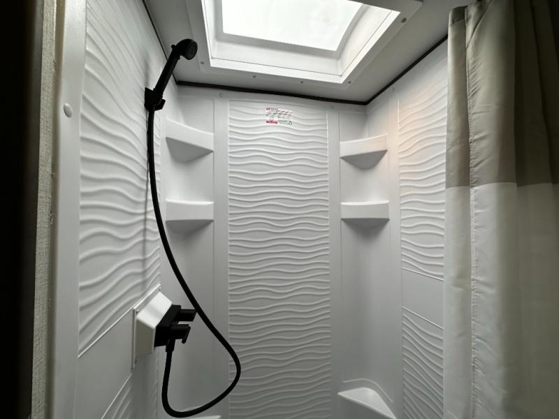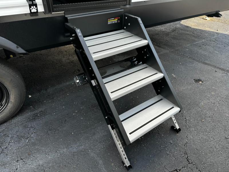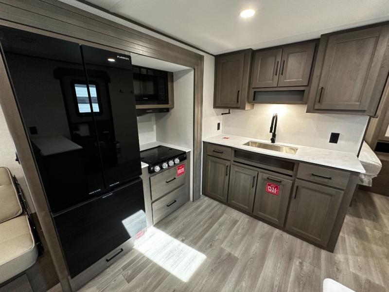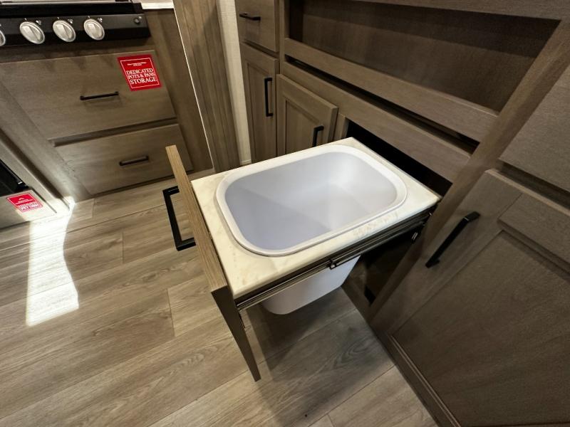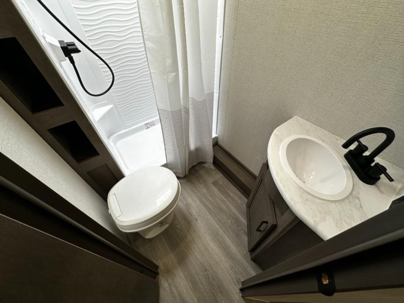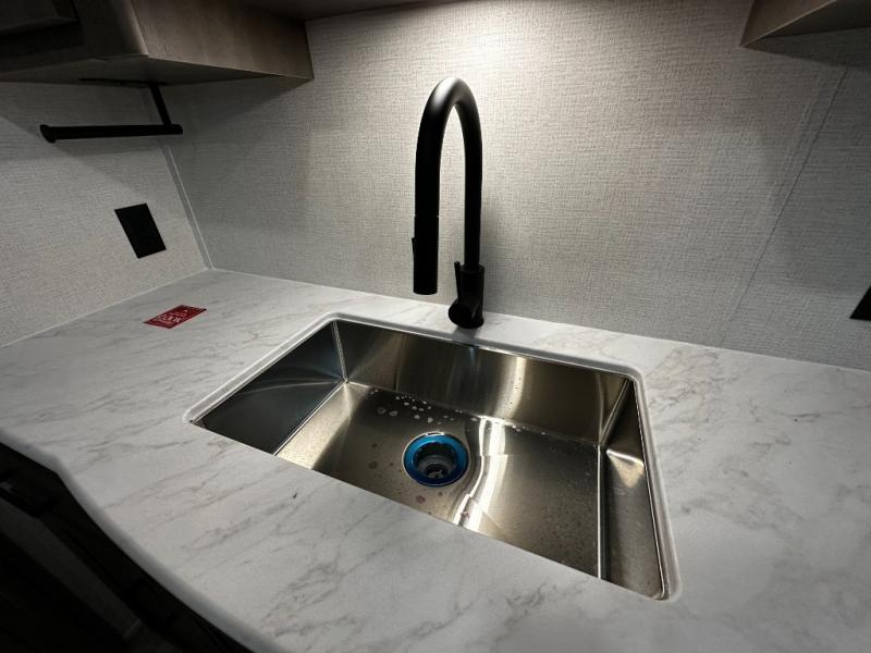 The fully equipped kitchen includes upgraded appliances, a deep stainless-steel sink, seamless countertops, and ample cabinet space to handle everything from quick snacks to full meals. The bathroom is conveniently located near the bunks and exterior door, making it easy to access whether you’re relaxing inside or coming in from a day outdoors.