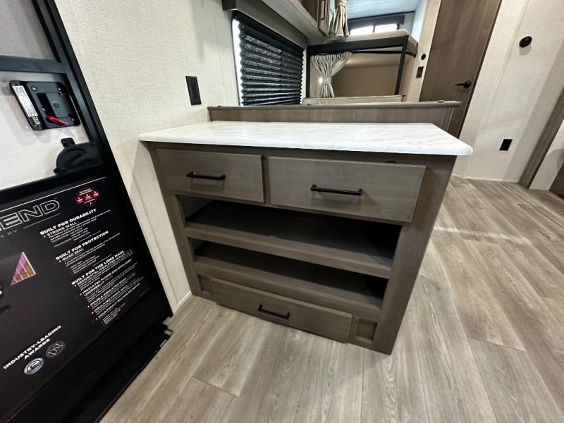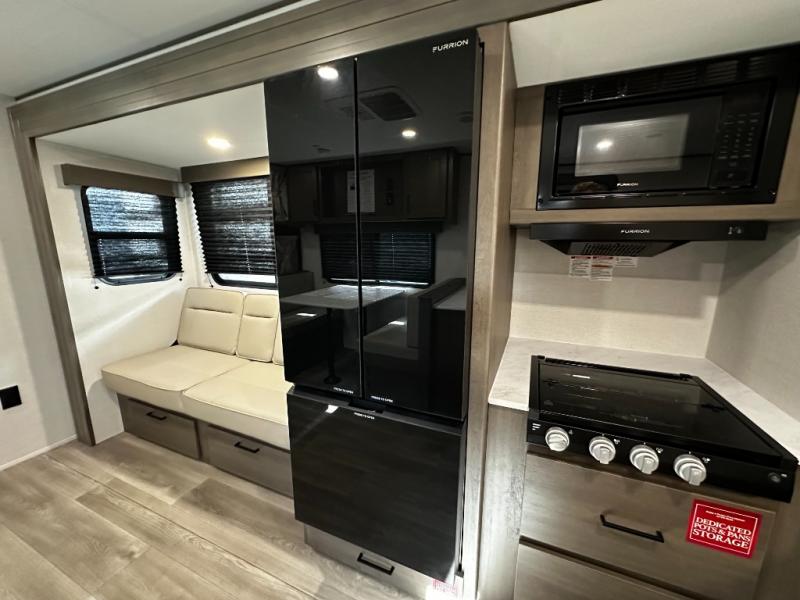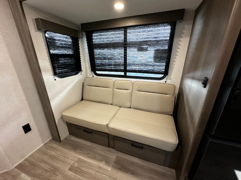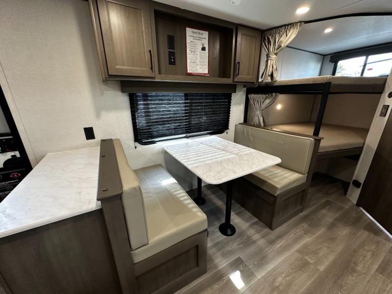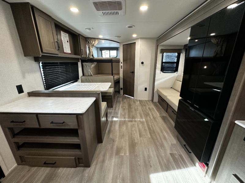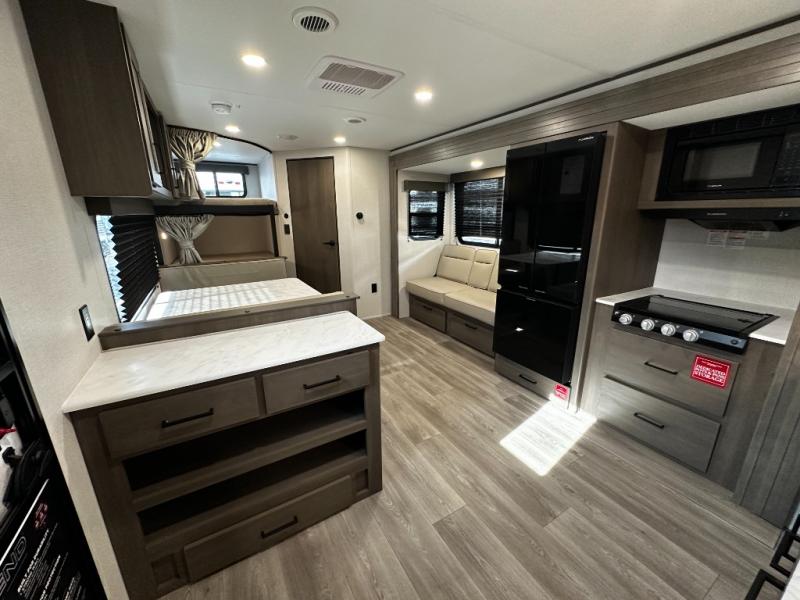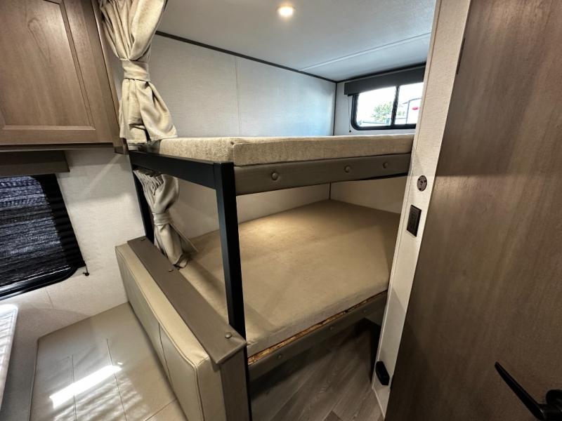 Inside, you’ll find a spacious and functional floorplan featuring a private front bedroom with a comfortable queen bed, overhead cabinets, and dual wardrobes for organized storage. The rear double-over-double bunks provide plenty of room for kids, guests, or extra gear, making this trailer ideal for family adventures. The central living area is warm and welcoming, with a large booth dinette, reclining seating, and a modern entertainment space that makes downtime just as enjoyable as the destination.