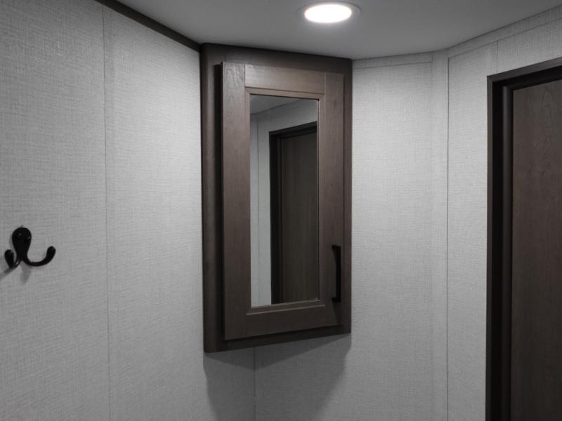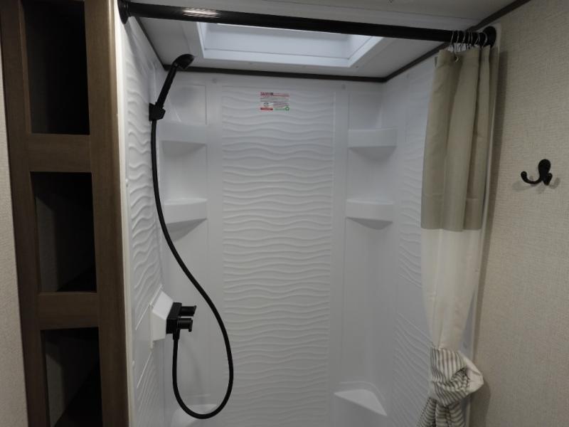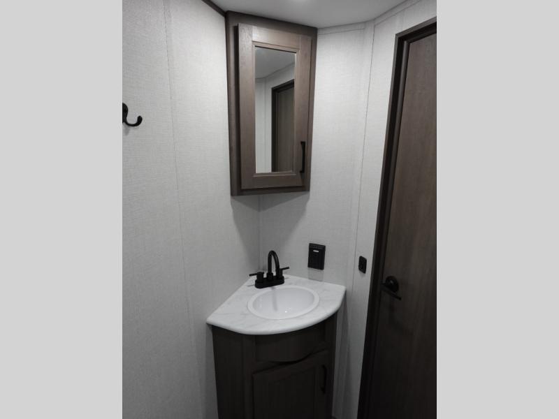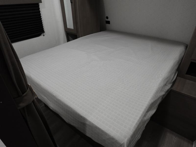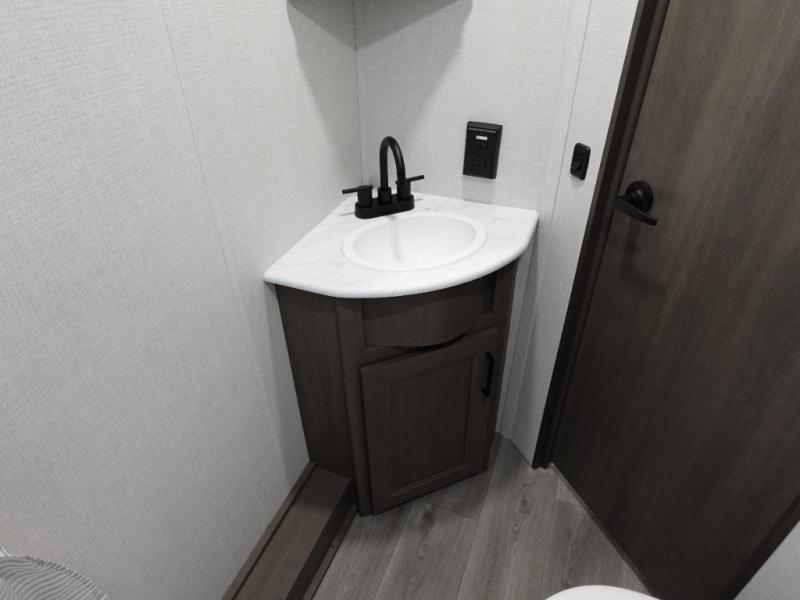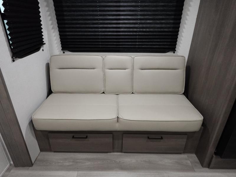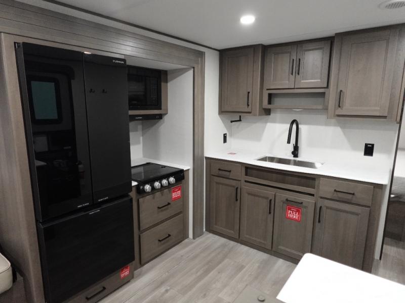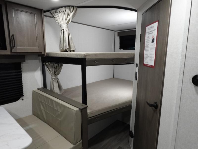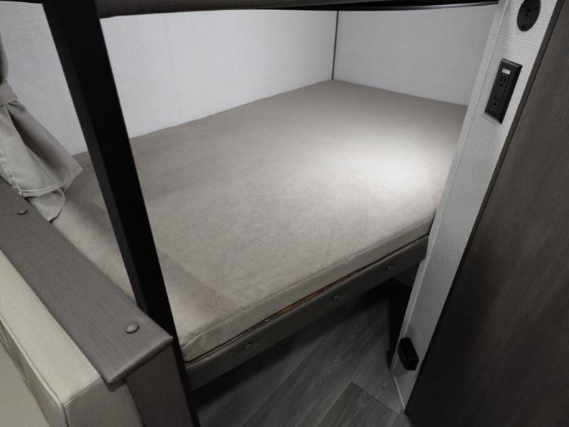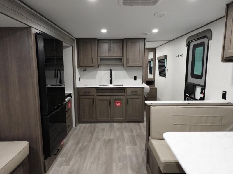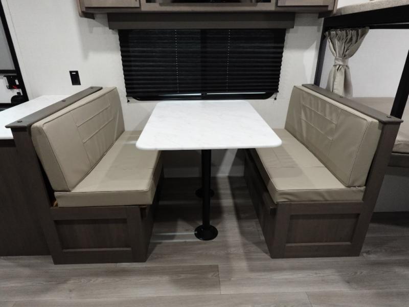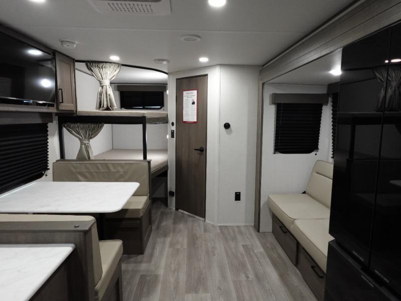 Camping with your larger family or when you want to take along a few extra friends is easy with this trailer. This unit sleeps nine with the double-size bunks in the rear corner, the 60" roll over sofa, and the queen bed in the front semi-private bedroom. The booth dinette can also be used to sleep a guest or two little ones at night once converted. Prepare your meals on the three-burner cooktop indoors, or out on the two-burner cooktop at the outside kitchen! You'll also find a handy exterior spray port and an outdoor refrigerator for cold drinks! It will be so easy to fill the dog's food bowl with the added pet dish under the refrigerator, and the full bath in this model means you don't have to use the camp's facilities. Having a 17' awning outside along with a large unobstructed pass-through compartment allows you extended living outdoors and plenty of space for all of your gear!