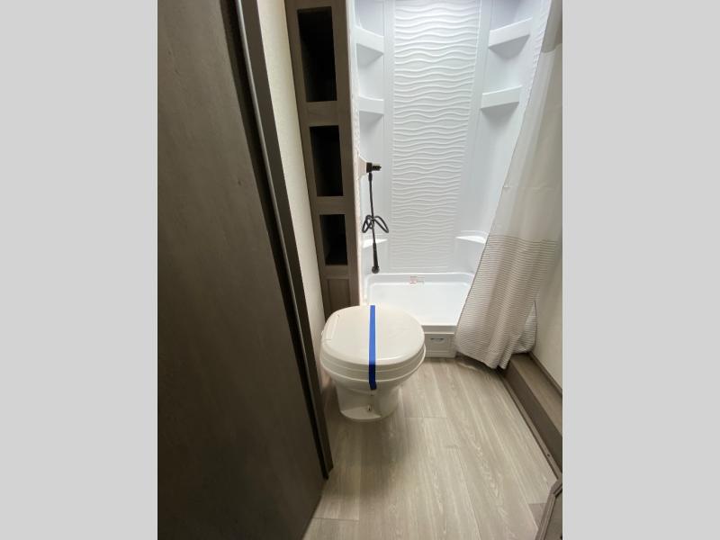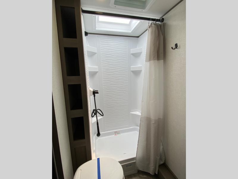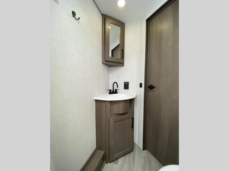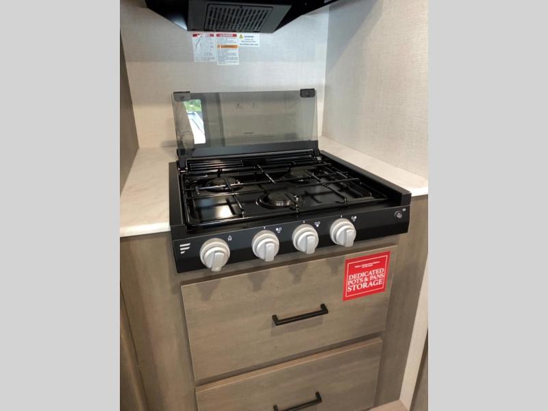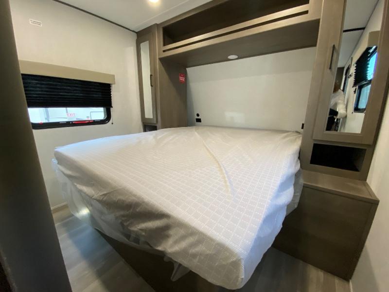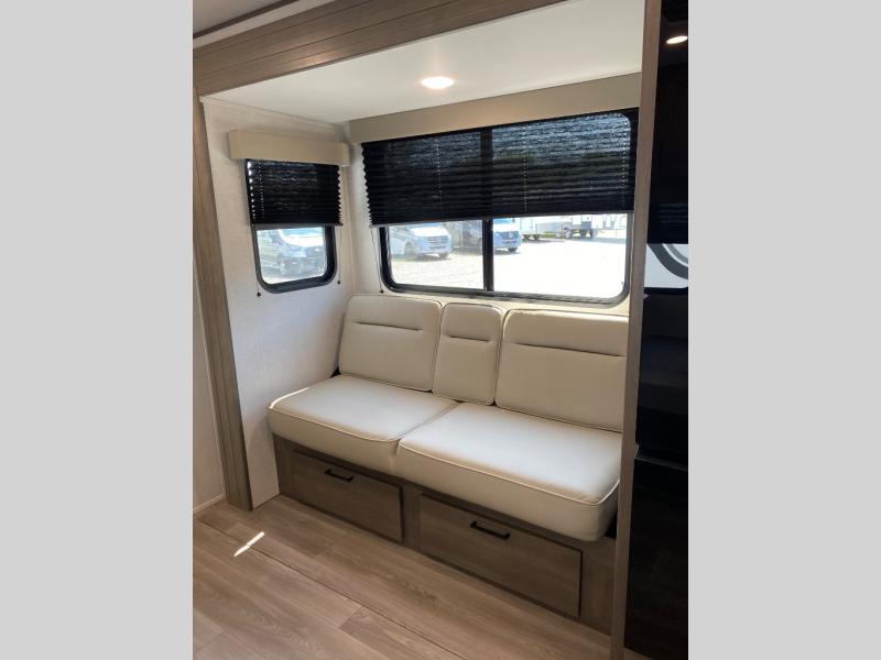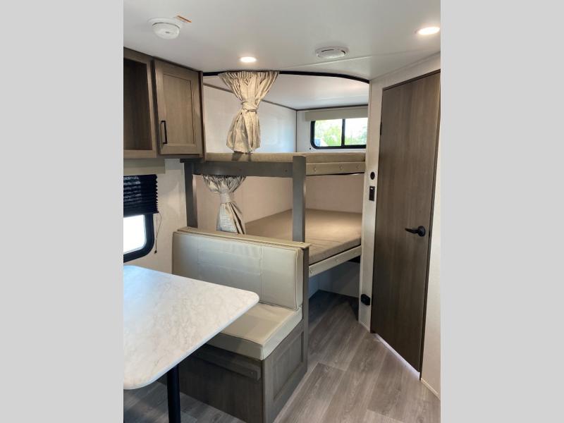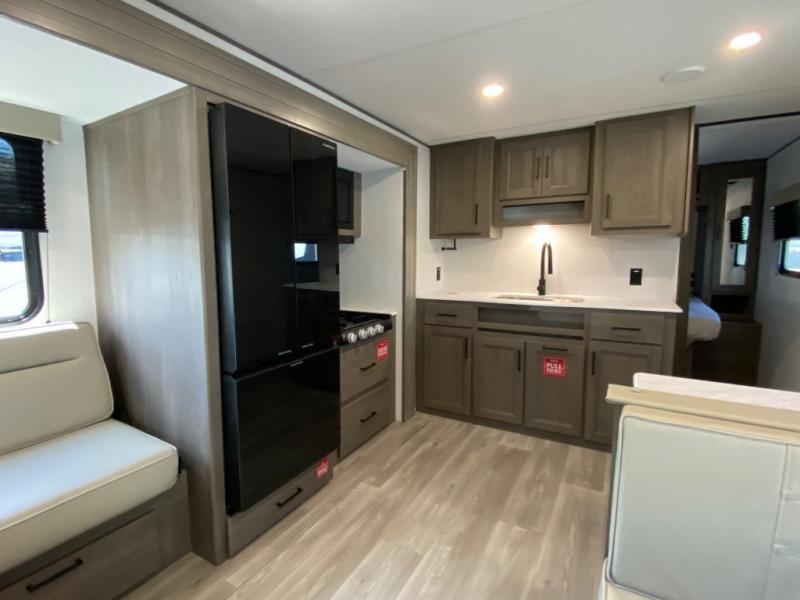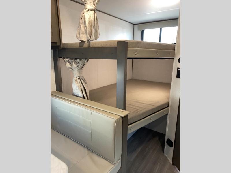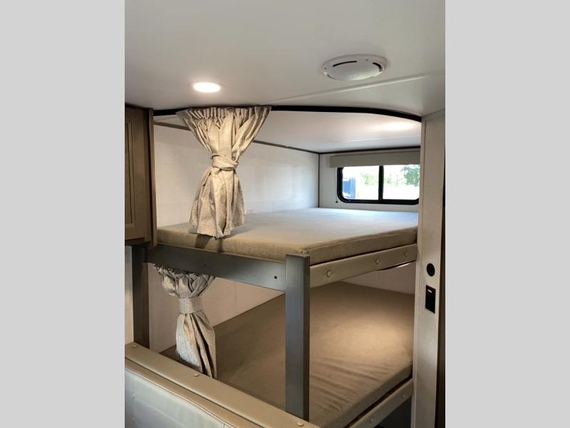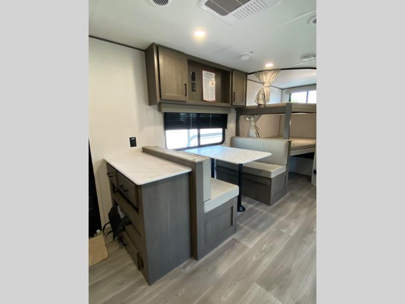 Camping with your larger family or when you want to take along a few extra friends is easy with this trailer. This unit sleeps nine with the double-size bunks in the rear corner, the 60" roll over sofa, and the queen bed in the front semi-private bedroom. The booth dinette can also be used to sleep a guest or two little ones at night once converted. Prepare your meals on the three-burner cooktop indoors, or out on the two-burner cooktop at the outside kitchen! You'll also find a handy exterior spray port and an outdoor refrigerator for cold drinks! It will be so easy to fill the dog's food bowl with the added pet dish under the refrigerator, and the full bath in this model means you don't have to use the camp's facilities. Having a 17' awning outside along with a large unobstructed pass-through compartment allows you extended living outdoors and plenty of space for all of your gear!