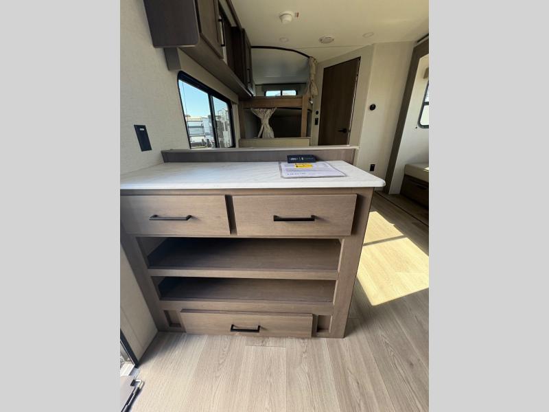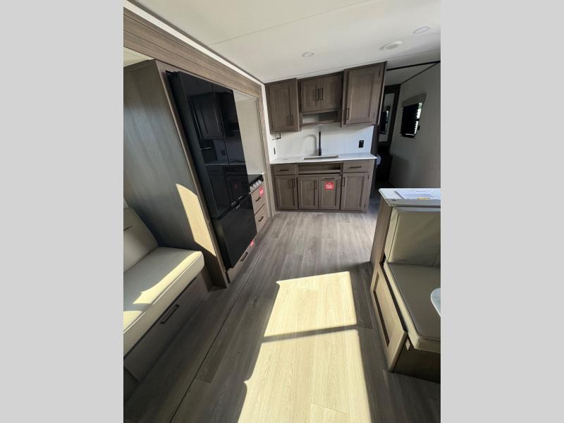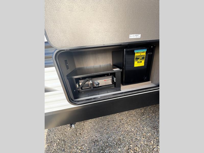 Camping with your larger family or when you want to take along a few extra friends is easy with this trailer. This unit sleeps nine with the double-size bunks in the rear corner, the 60" roll over sofa, and the queen bed in the front semi-private bedroom. The booth dinette can also be used to sleep a guest or two little ones at night once converted. Prepare your meals on the three-burner cooktop indoors, or out on the two-burner cooktop at the outside kitchen! You'll also find a handy exterior spray port and an outdoor refrigerator for cold drinks! It will be so easy to fill the dog's food bowl with the added pet dish under the refrigerator, and the full bath in this model means you don't have to use the camp's facilities. Having a 17' awning outside along with a large unobstructed pass-through compartment allows you extended living outdoors and plenty of space for all of your gear!
