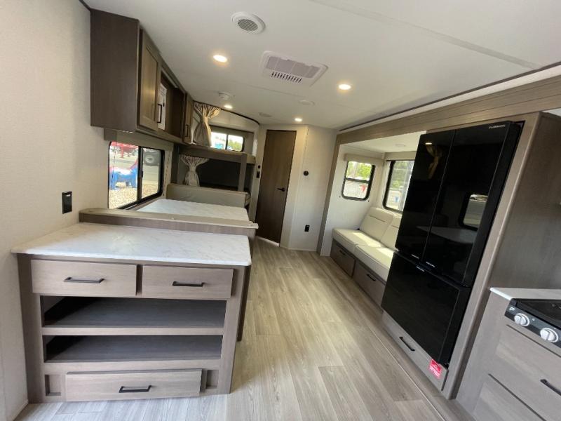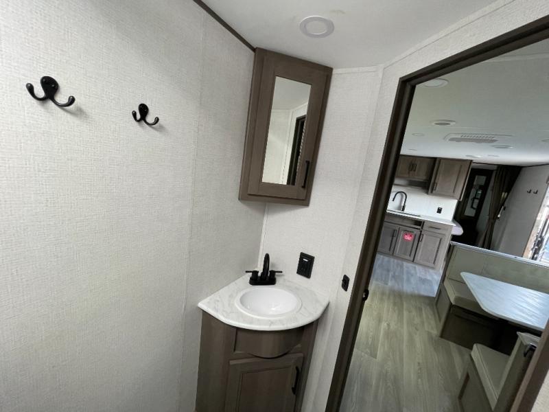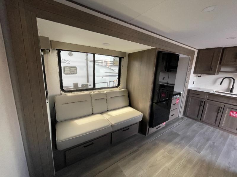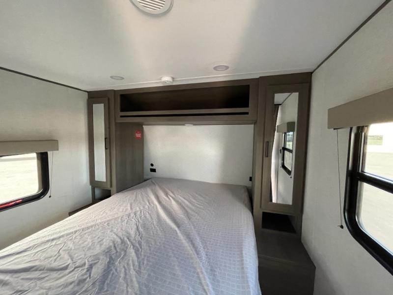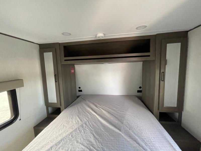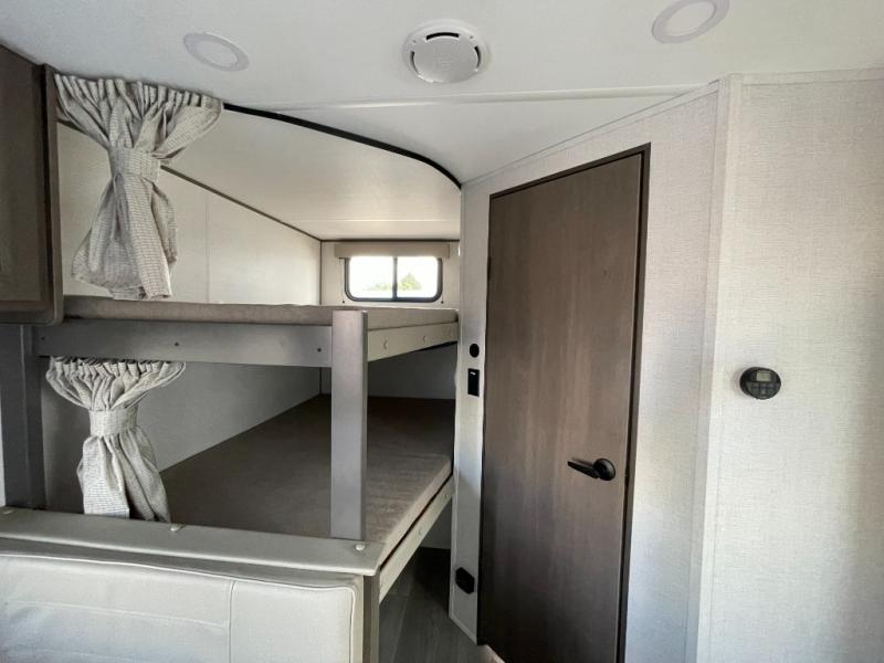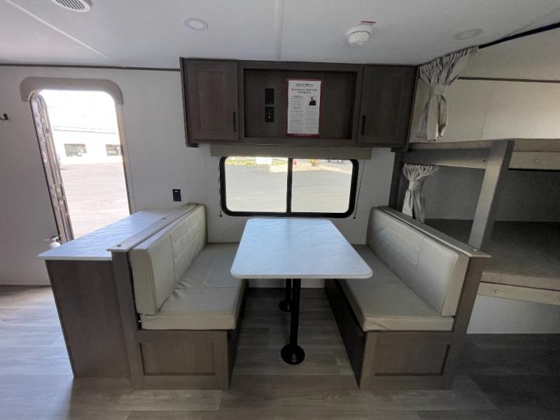 Camping with your larger family or when you want to take along a few extra friends is easy with this trailer. This unit sleeps eight with the double-size bunks in the rear corner, the 60" roll over sofa, and the queen bed in the front semi-private bedroom. The booth dinette can also be used to sleep a guest or two little ones at night once converted. Prepare your meals on the three-burner cooktop indoors, or out on the two-burner cooktop at the outside kitchen! You'll also find a handy exterior spray port and an outdoor refrigerator for cold drinks! It will be so easy to fill the dog's food bowl with the added pet dish under the refrigerator, and the full bath in this model means you don't have to use the camp's facilities. Having a 17' awning outside along with a large unobstructed pass-through compartment allows you extended living outdoors and plenty of space for all of your gear!