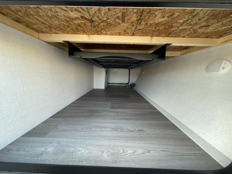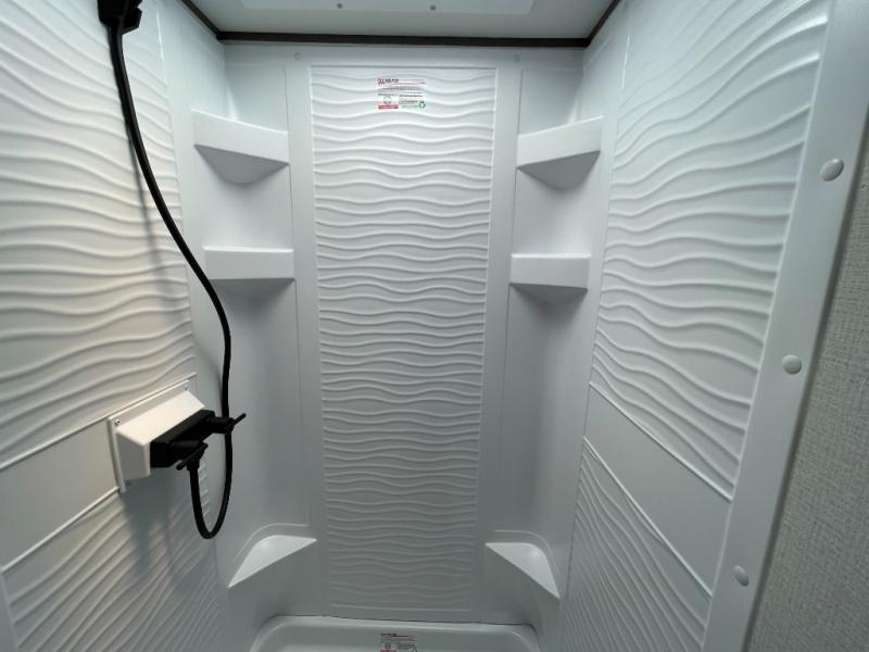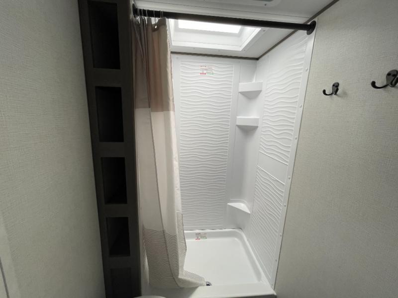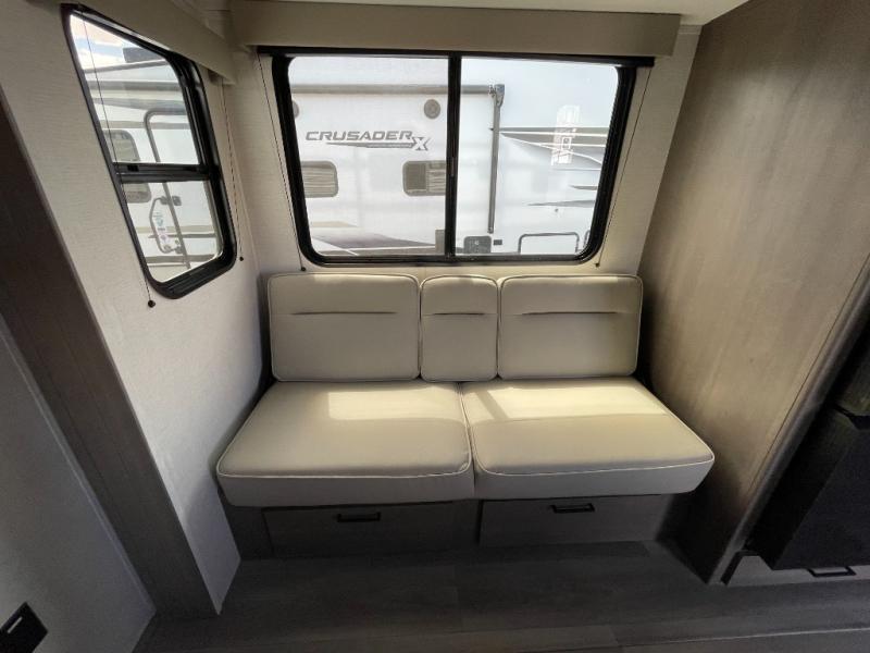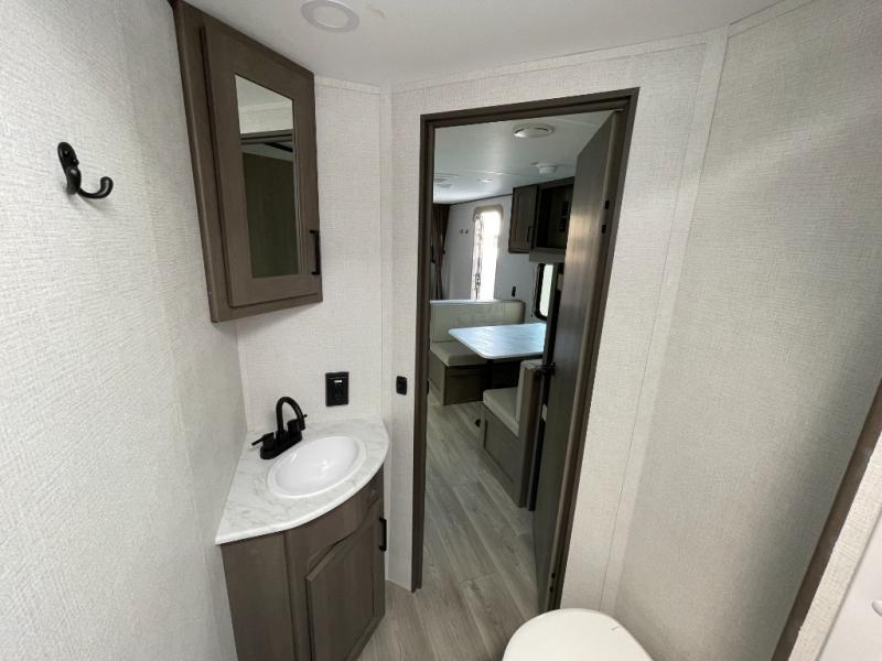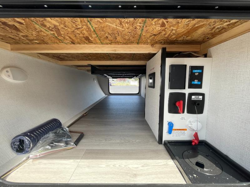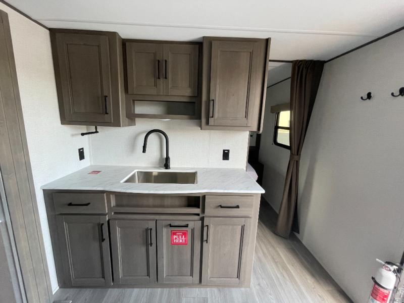 Camping with your larger family or when you want to take along a few extra friends is easy with this trailer. This unit sleeps eight with the double-size bunks in the rear corner, the 60" roll over sofa, and the queen bed in the front semi-private bedroom. The booth dinette can also be used to sleep a guest or two little ones at night once converted. Prepare your meals on the three-burner cooktop indoors, or out on the two-burner cooktop at the outside kitchen! You'll also find a handy exterior spray port and an outdoor refrigerator for cold drinks! It will be so easy to fill the dog's food bowl with the added pet dish under the refrigerator, and the full bath in this model means you don't have to use the camp's facilities. Having a 17' awning outside along with a large unobstructed pass-through compartment allows you extended living outdoors and plenty of space for all of your gear!