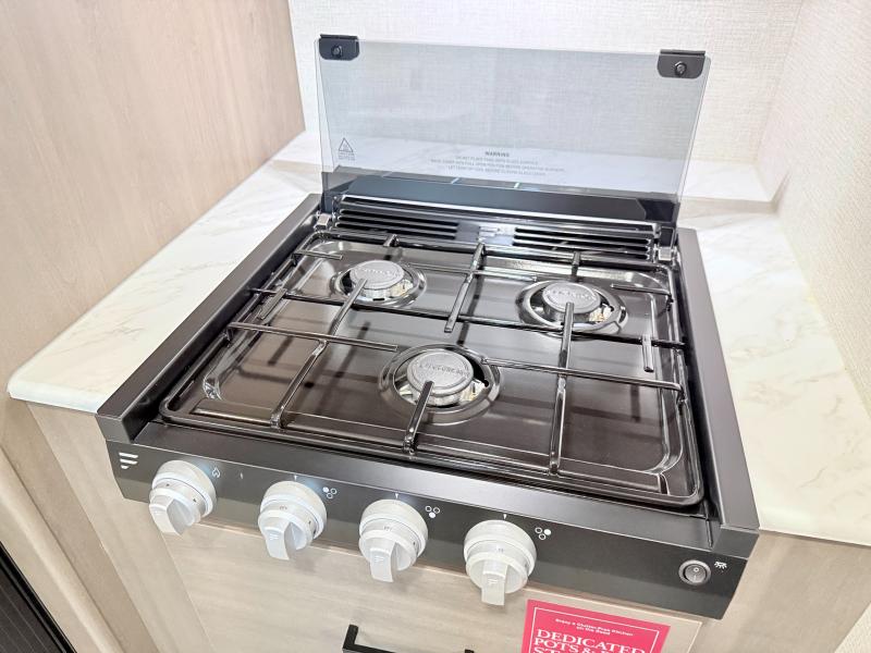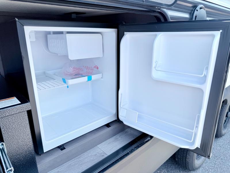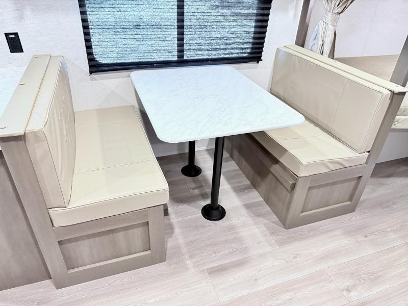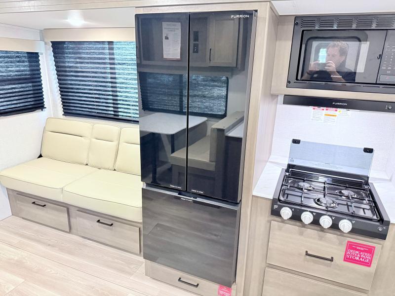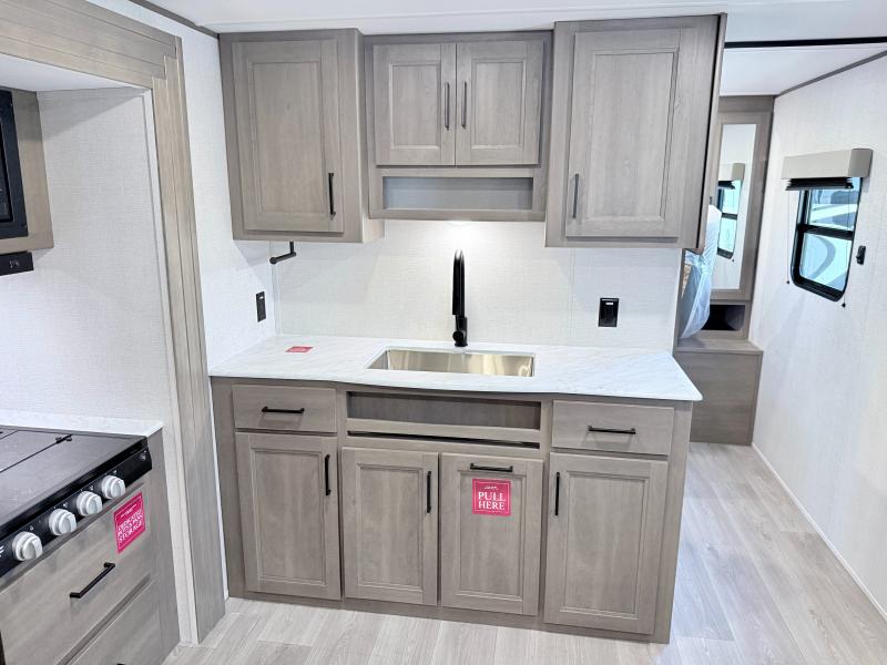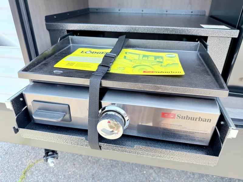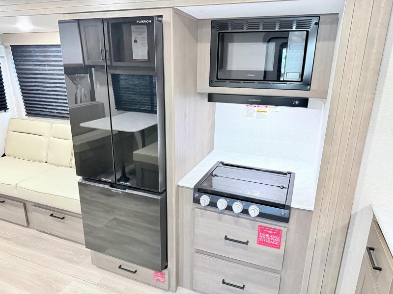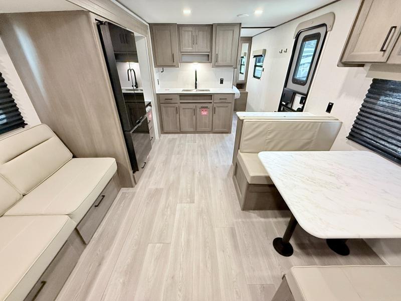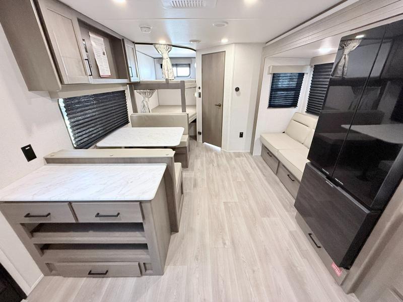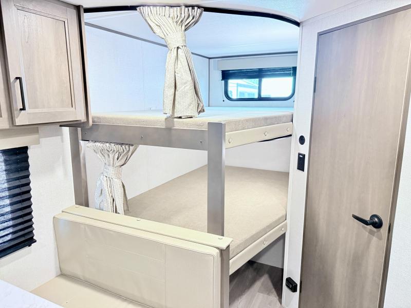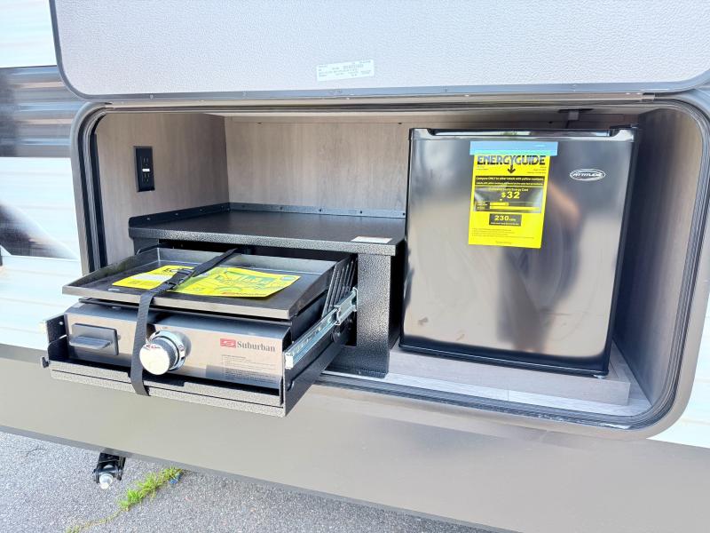 Camping with your larger family or when you want to take along a few extra friends is easy with this trailer. This unit sleeps nine with the double-size bunks in the rear corner, the 60" roll over sofa, and the queen bed in the front semi-private bedroom. The booth dinette can also be used to sleep a guest or two little ones at night once converted. Prepare your meals on the three-burner cooktop indoors, or out on the two-burner cooktop at the outside kitchen! You'll also find a handy exterior spray port and an outdoor refrigerator for cold drinks! It will be so easy to fill the dog's food bowl with the added pet dish under the refrigerator, and the full bath in this model means you don't have to use the camp's facilities. Having a 17' awning outside along with a large unobstructed pass-through compartment allows you extended living outdoors and plenty of space for all of your gear!