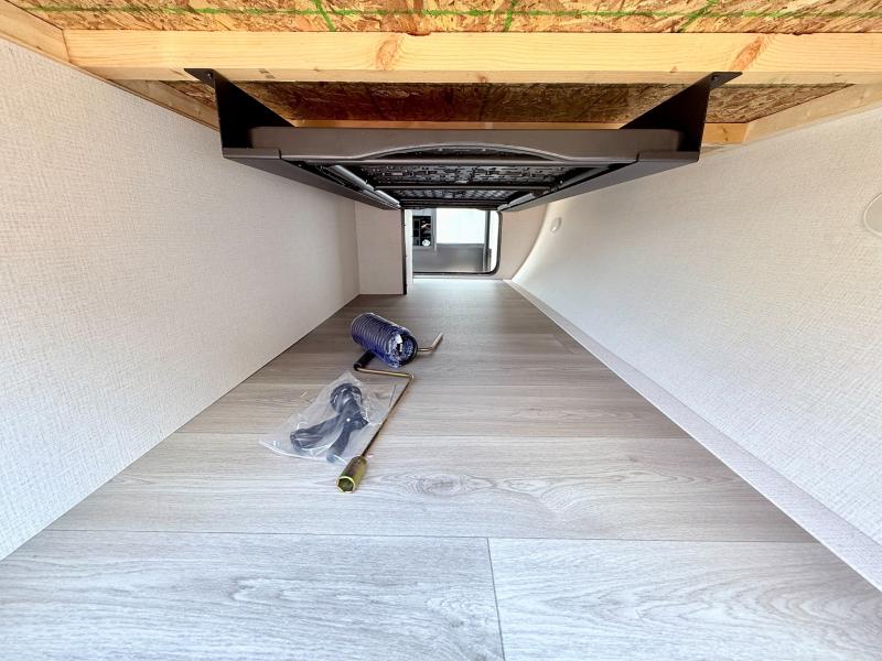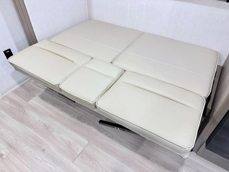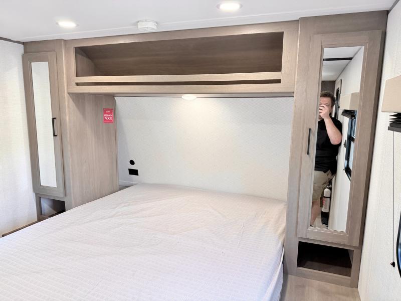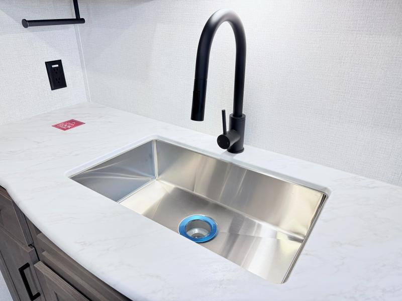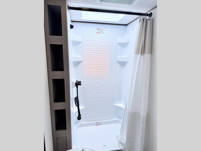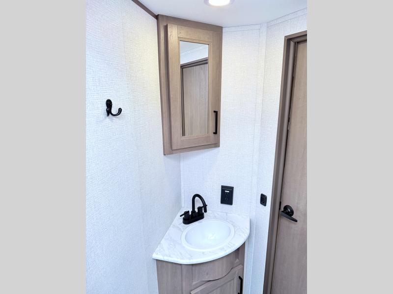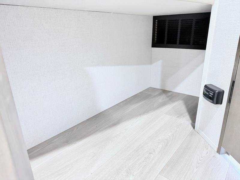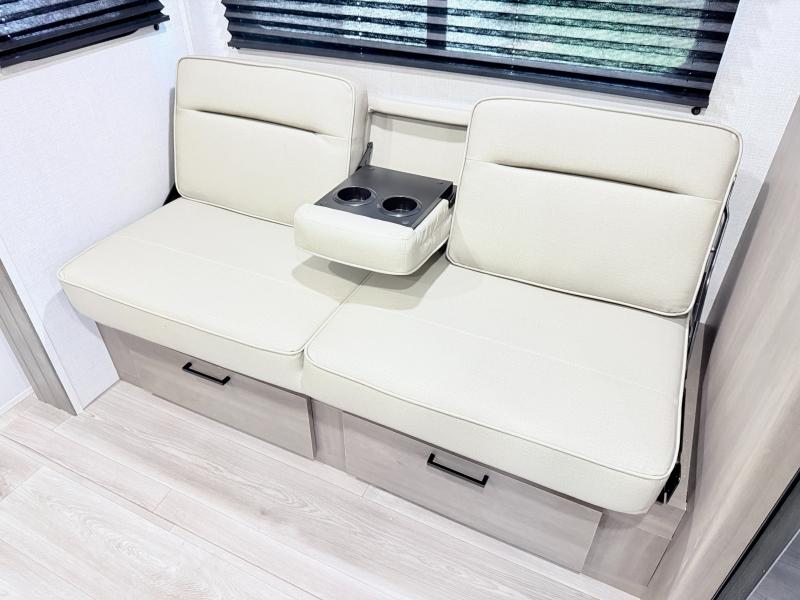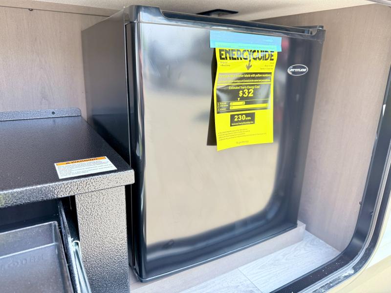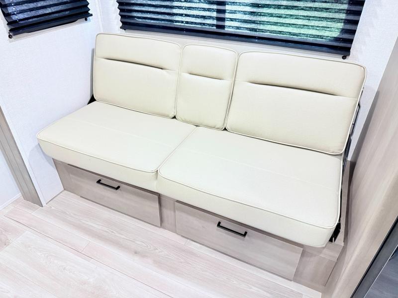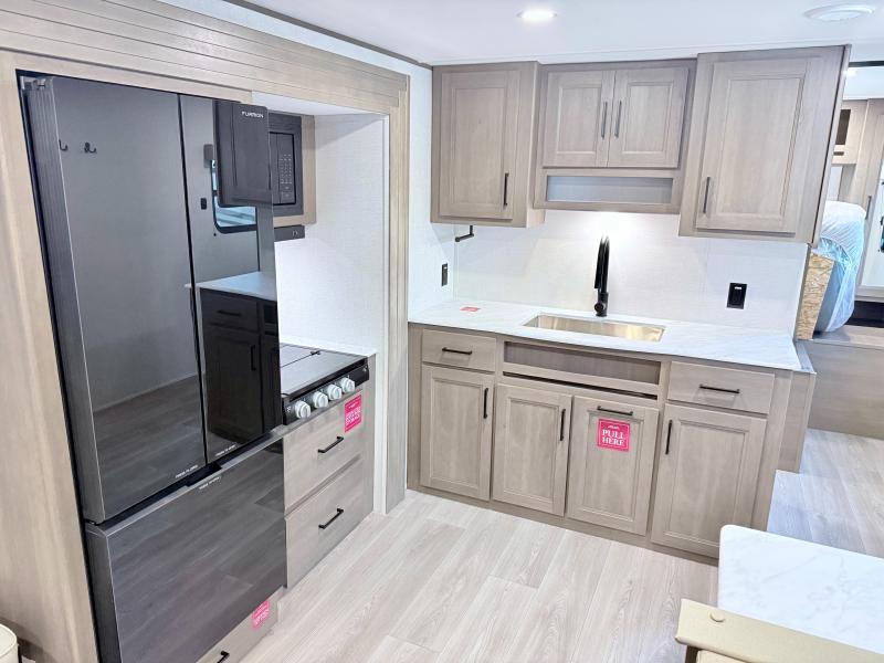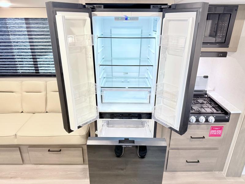 Camping with your larger family or when you want to take along a few extra friends is easy with this trailer. This unit sleeps nine with the double-size bunks in the rear corner, the 60" roll over sofa, and the queen bed in the front semi-private bedroom. The booth dinette can also be used to sleep a guest or two little ones at night once converted. Prepare your meals on the three-burner cooktop indoors, or out on the two-burner cooktop at the outside kitchen! You'll also find a handy exterior spray port and an outdoor refrigerator for cold drinks! It will be so easy to fill the dog's food bowl with the added pet dish under the refrigerator, and the full bath in this model means you don't have to use the camp's facilities. Having a 17' awning outside along with a large unobstructed pass-through compartment allows you extended living outdoors and plenty of space for all of your gear!