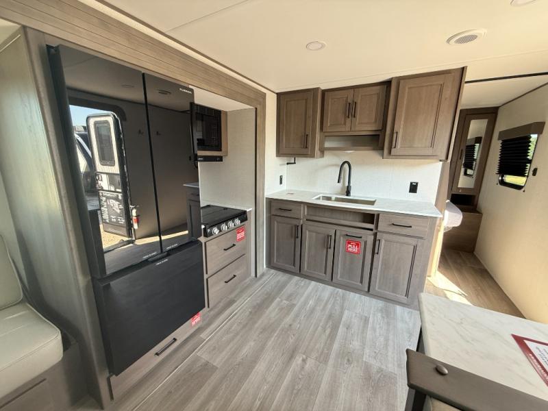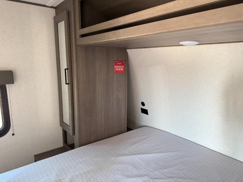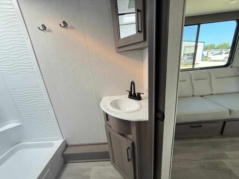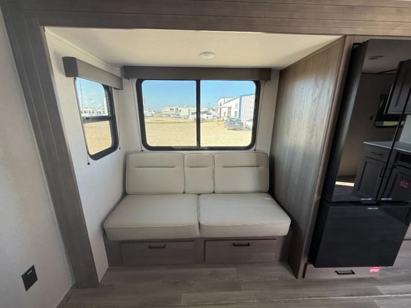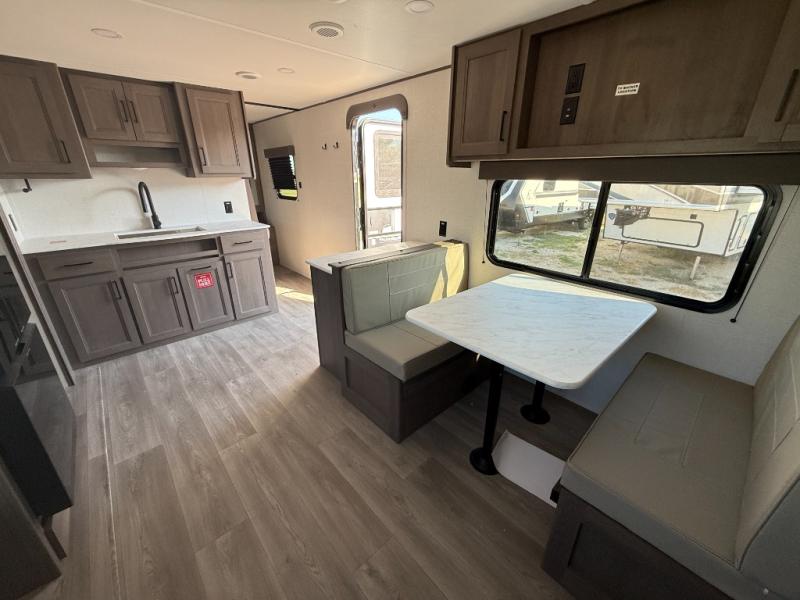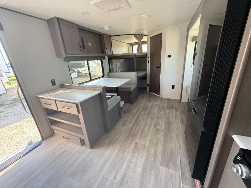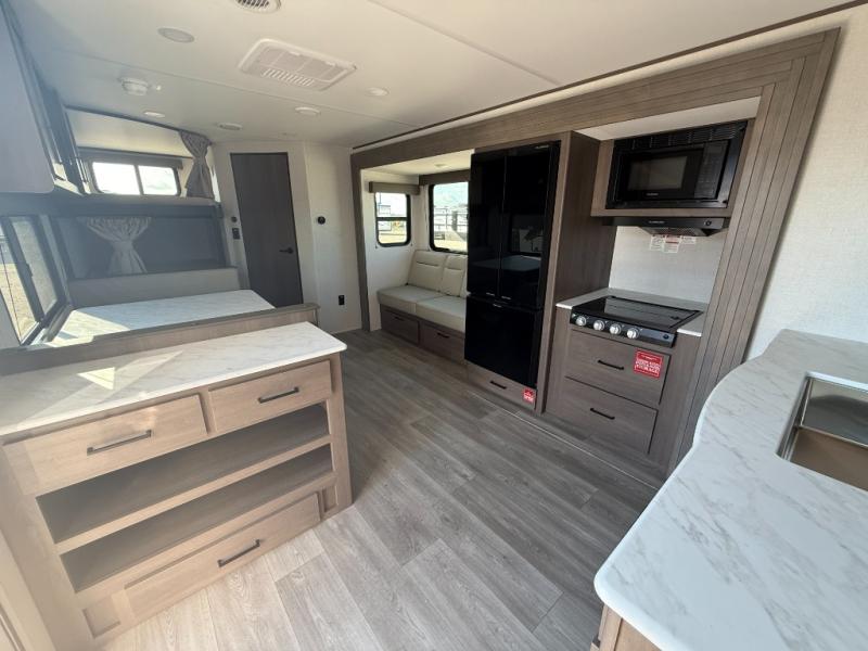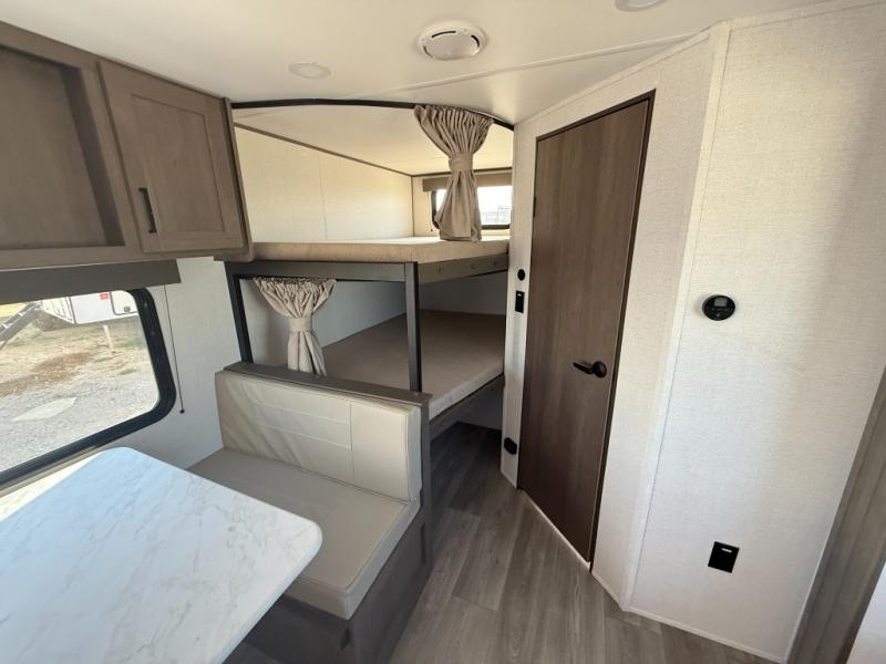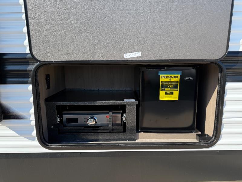 Camping with your larger family or when you want to take along a few extra friends is easy with this trailer. This unit sleeps nine with the double-size bunks in the rear corner, the 60" roll over sofa, and the queen bed in the front semi-private bedroom. The booth dinette can also be used to sleep a guest or two little ones at night once converted. Prepare your meals on the three-burner cooktop indoors, or out on the two-burner cooktop at the outside kitchen! You'll also find a handy exterior spray port and an outdoor refrigerator for cold drinks! It will be so easy to fill the dog's food bowl with the added pet dish under the refrigerator, and the full bath in this model means you don't have to use the camp's facilities. Having a 17' awning outside along with a large unobstructed pass-through compartment allows you extended living outdoors and plenty of space for all of your gear!