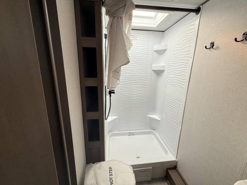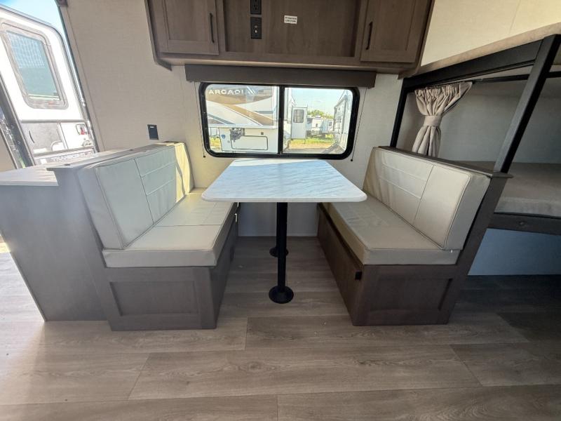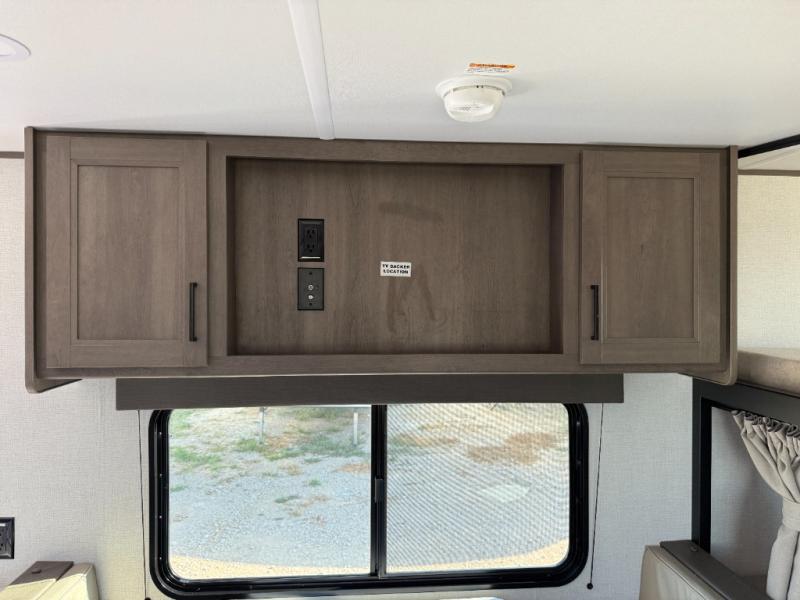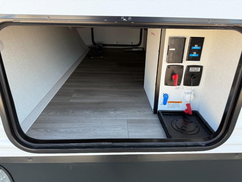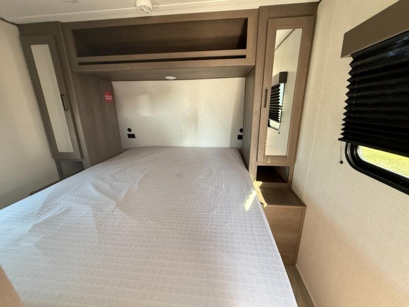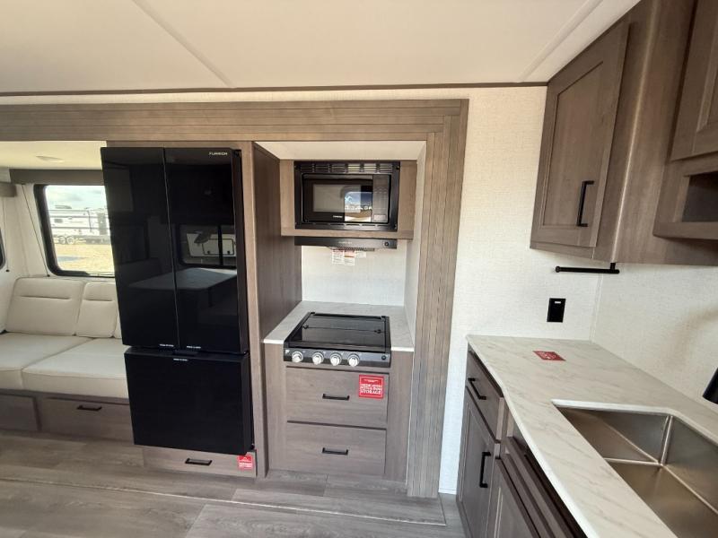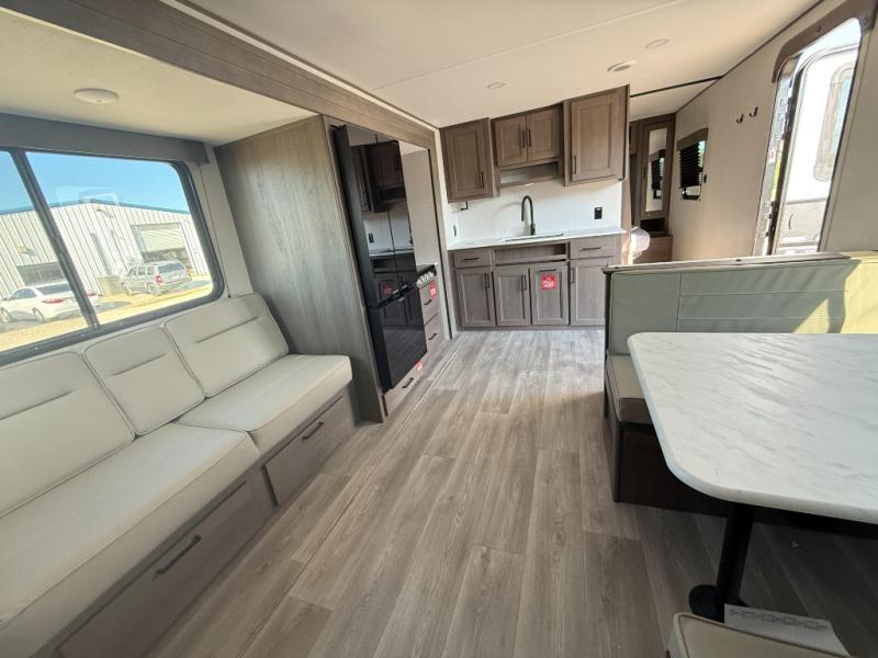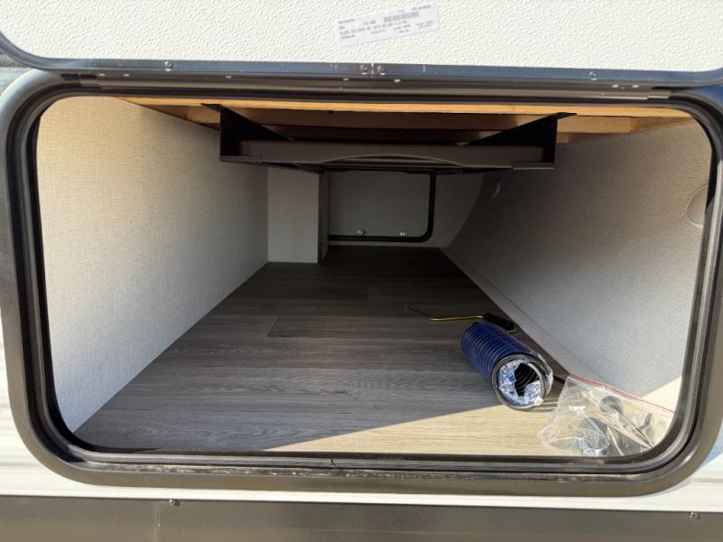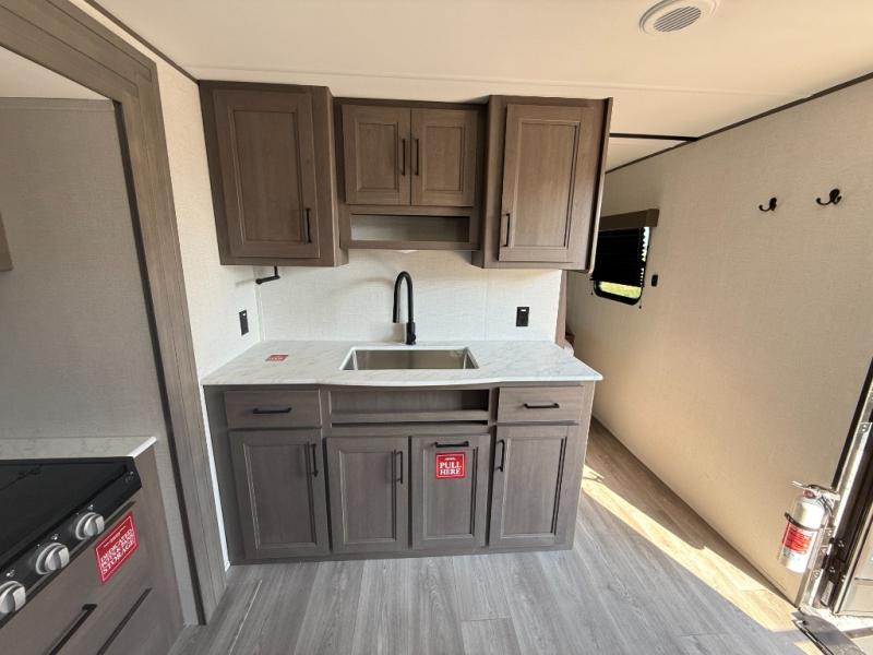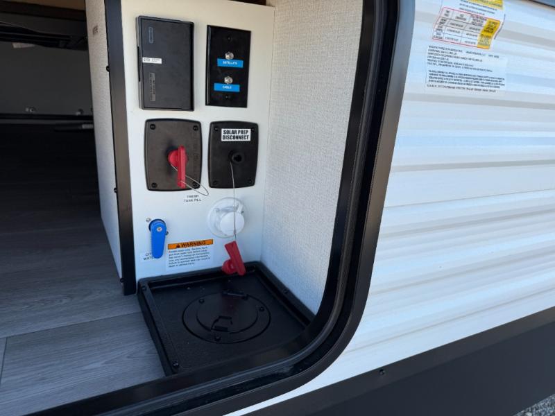 Camping with your larger family or when you want to take along a few extra friends is easy with this trailer. This unit sleeps nine with the double-size bunks in the rear corner, the 60" roll over sofa, and the queen bed in the front semi-private bedroom. The booth dinette can also be used to sleep a guest or two little ones at night once converted. Prepare your meals on the three-burner cooktop indoors, or out on the two-burner cooktop at the outside kitchen! You'll also find a handy exterior spray port and an outdoor refrigerator for cold drinks! It will be so easy to fill the dog's food bowl with the added pet dish under the refrigerator, and the full bath in this model means you don't have to use the camp's facilities. Having a 17' awning outside along with a large unobstructed pass-through compartment allows you extended living outdoors and plenty of space for all of your gear!