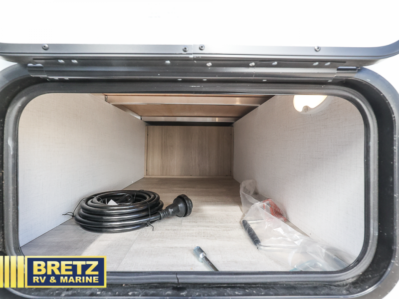 Camping with your larger family or when you want to take along a few extra friends is easy with this trailer. This unit sleeps nine with the double-size bunks in the rear corner, the 60" roll over sofa, and the queen bed in the front semi-private bedroom. The booth dinette can also be used to sleep a guest or two little ones at night once converted. Prepare your meals on the three-burner cooktop indoors, or out on the two-burner cooktop at the outside kitchen! You'll also find a handy exterior spray port and an outdoor refrigerator for cold drinks! It will be so easy to fill the dog's food bowl with the added pet dish under the refrigerator, and the full bath in this model means you don't have to use the camp's facilities. Having a 17' awning outside along with a large unobstructed pass-through compartment allows you extended living outdoors and plenty of space for all of your gear!