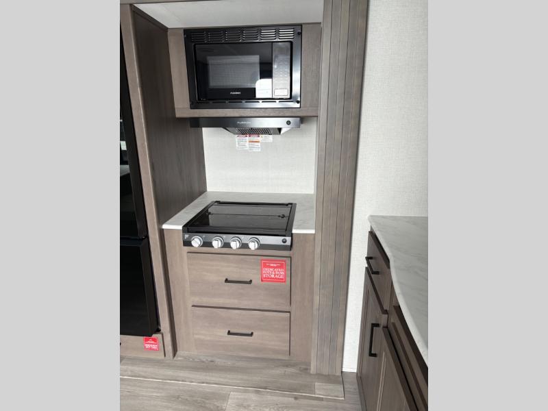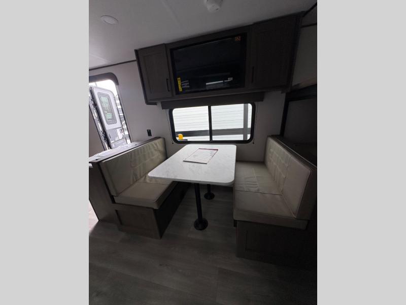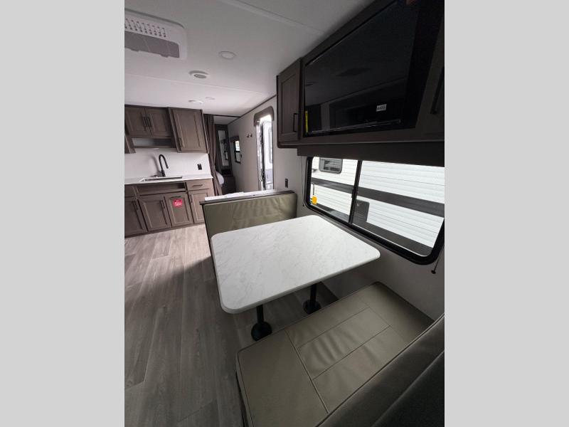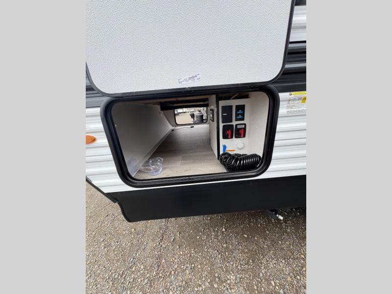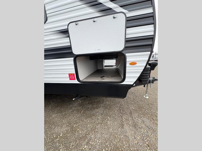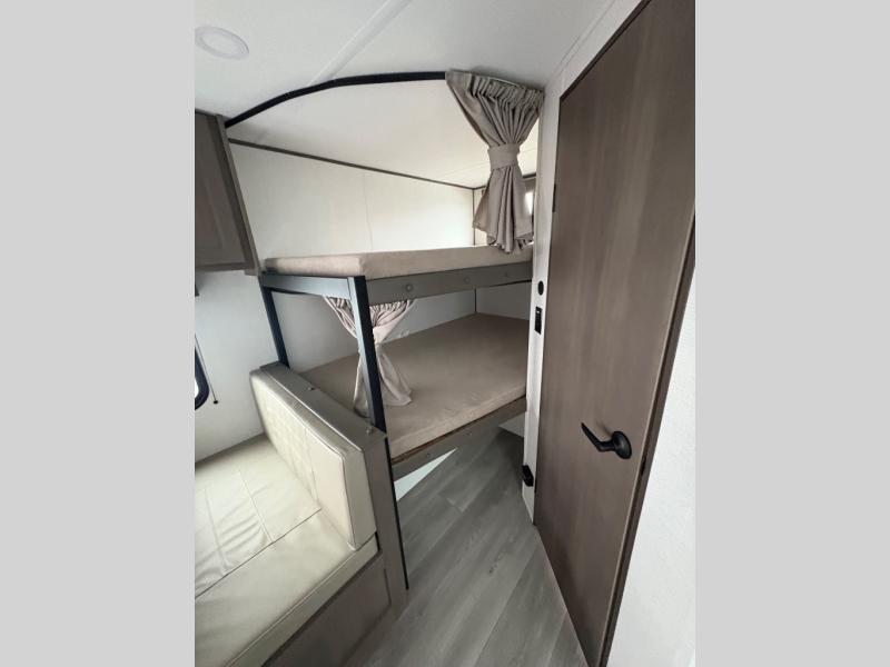 Camping with your larger family or when you want to take along a few extra friends is easy with this trailer. This unit sleeps nine with the double-size bunks in the rear corner, the 60" roll over sofa, and the queen bed in the front semi-private bedroom. The booth dinette can also be used to sleep a guest or two little ones at night once converted. Prepare your meals on the three-burner cooktop indoors, or out on the two-burner cooktop at the outside kitchen! You'll also find a handy exterior spray port and an outdoor refrigerator for cold drinks! It will be so easy to fill the dog's food bowl with the added pet dish under the refrigerator, and the full bath in this model means you don't have to use the camp's facilities. Having a 17' awning outside along with a large unobstructed pass-through compartment allows you extended living outdoors and plenty of space for all of your gear!