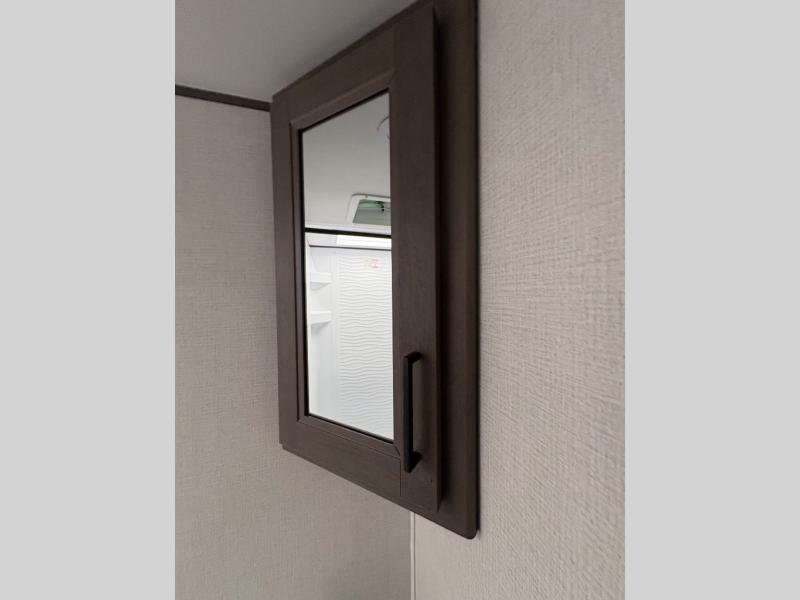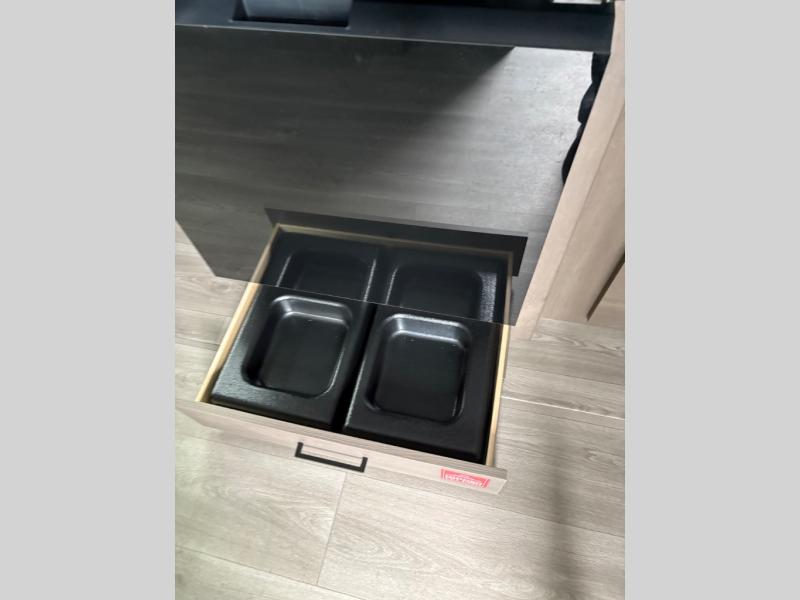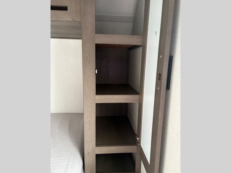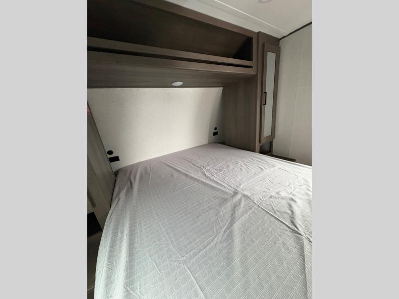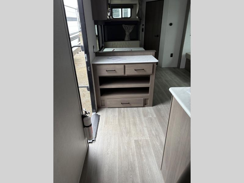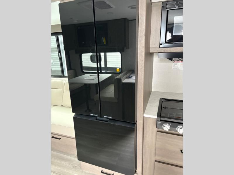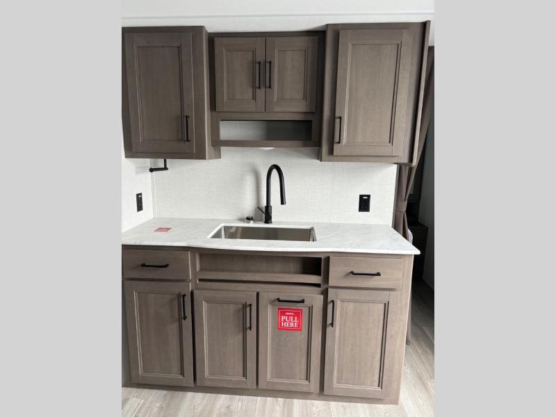 Camping with your larger family or when you want to take along a few extra friends is easy with this trailer. This unit sleeps nine with the double-size bunks in the rear corner, the 60" roll over sofa, and the queen bed in the front semi-private bedroom. The booth dinette can also be used to sleep a guest or two little ones at night once converted. Prepare your meals on the three-burner cooktop indoors, or out on the two-burner cooktop at the outside kitchen! You'll also find a handy exterior spray port and an outdoor refrigerator for cold drinks! It will be so easy to fill the dog's food bowl with the added pet dish under the refrigerator, and the full bath in this model means you don't have to use the camp's facilities. Having a 17' awning outside along with a large unobstructed pass-through compartment allows you extended living outdoors and plenty of space for all of your gear!