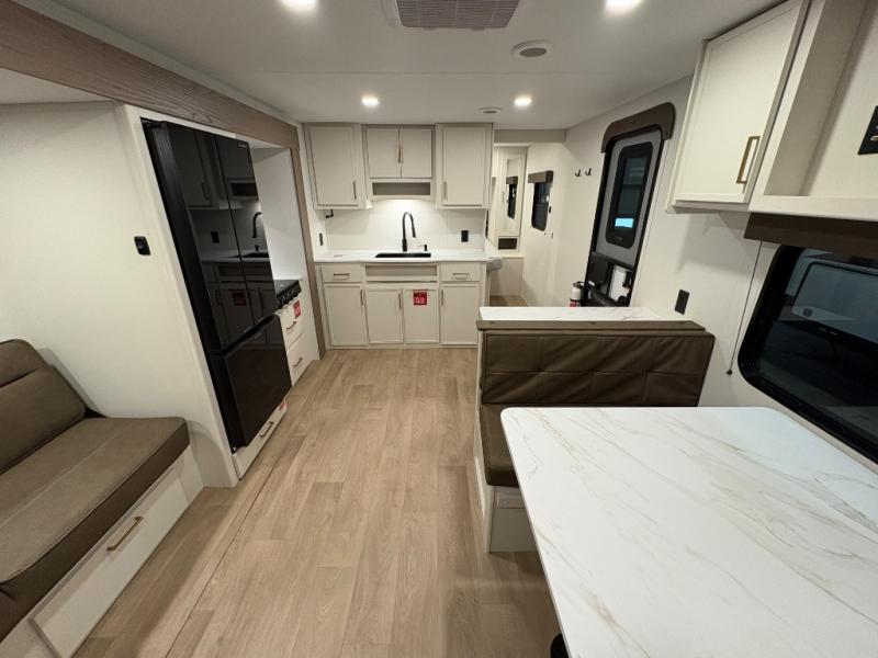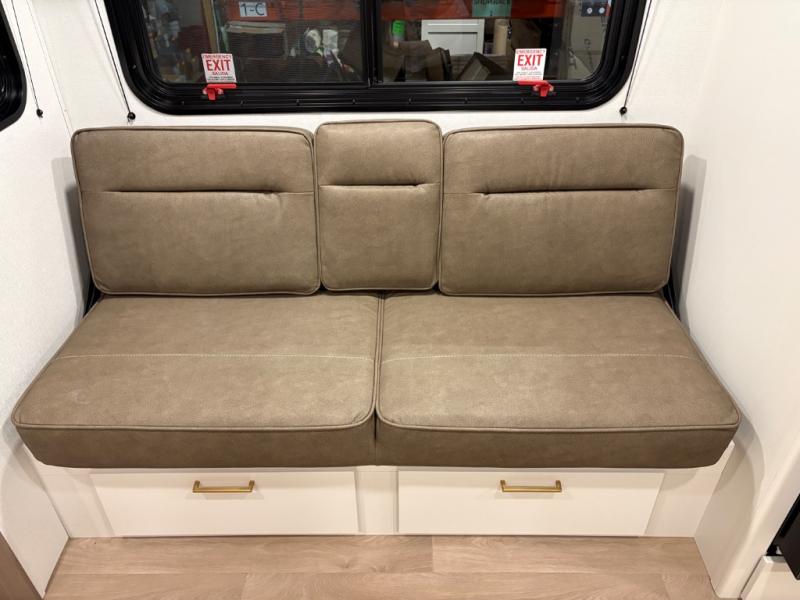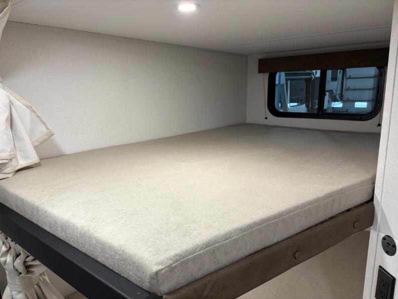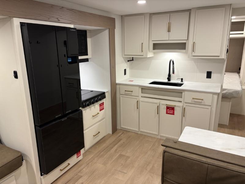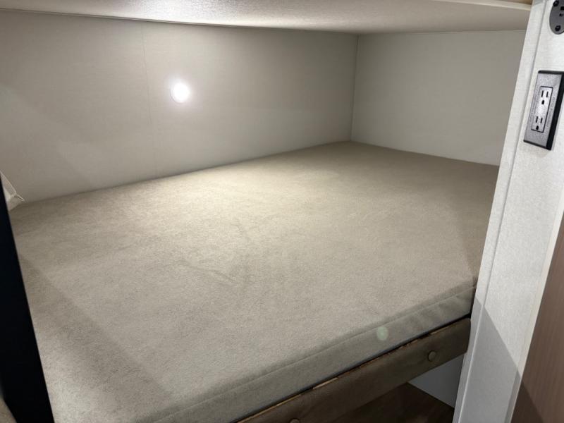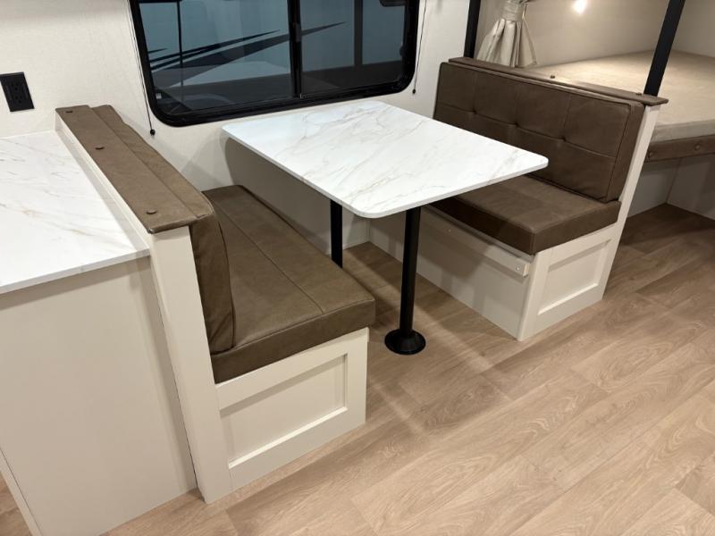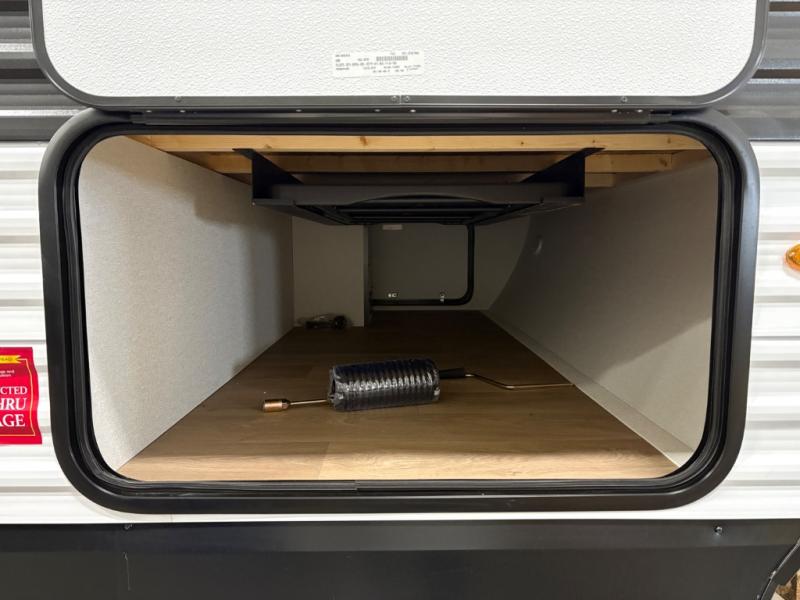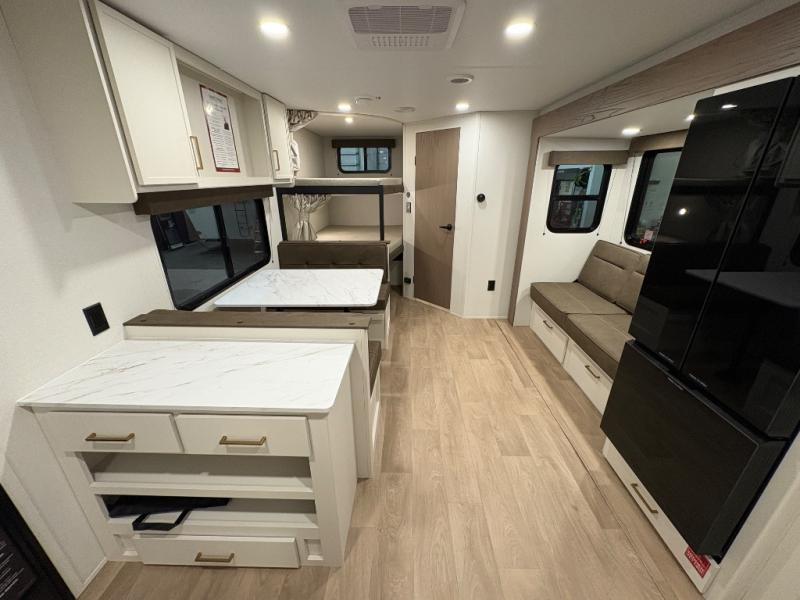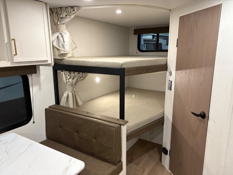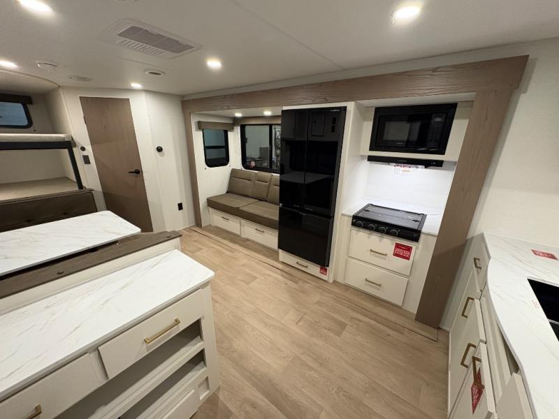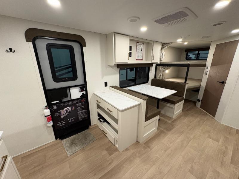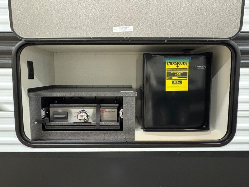 Camping with your larger family or when you want to take along a few extra friends is easy with this trailer. This unit sleeps nine with the double-size bunks in the rear corner, the 60" roll over sofa, and the queen bed in the front semi-private bedroom. The booth dinette can also be used to sleep a guest or two little ones at night once converted. Prepare your meals on the three-burner cooktop indoors, or out on the two-burner cooktop at the outside kitchen! You'll also find a handy exterior spray port and an outdoor refrigerator for cold drinks! It will be so easy to fill the dog's food bowl with the added pet dish under the refrigerator, and the full bath in this model means you don't have to use the camp's facilities. Having a 17' awning outside along with a large unobstructed pass-through compartment allows you extended living outdoors and plenty of space for all of your gear!