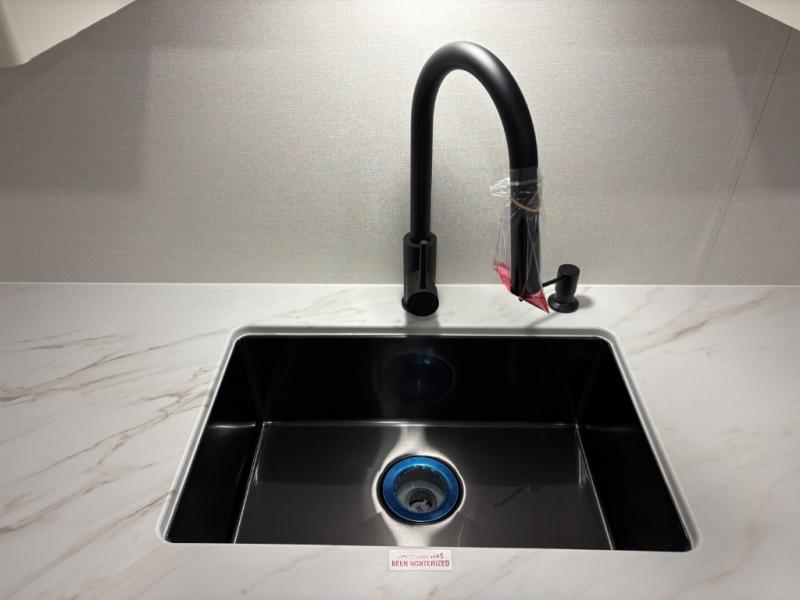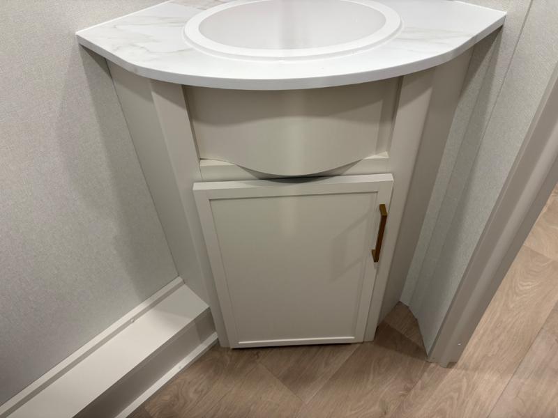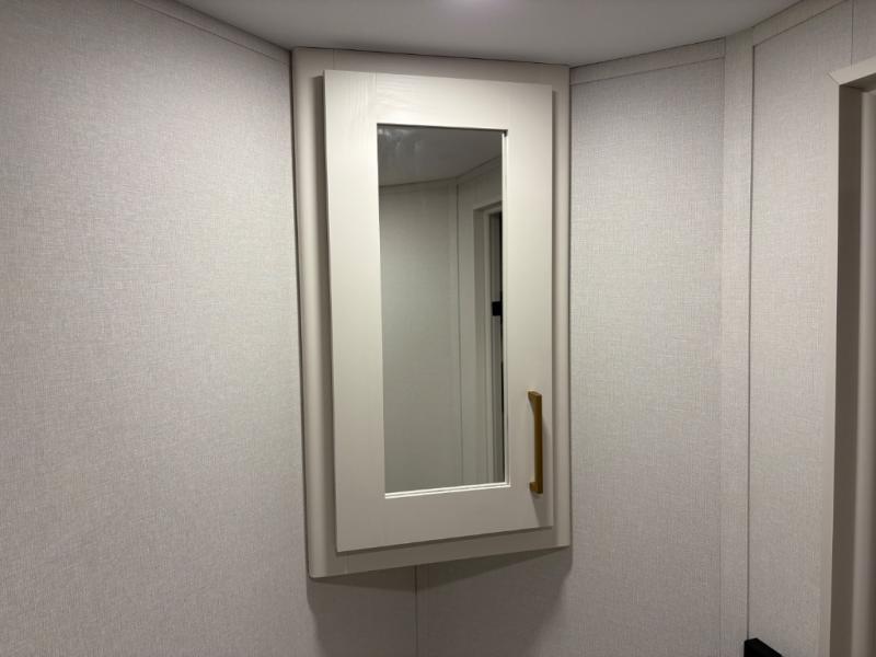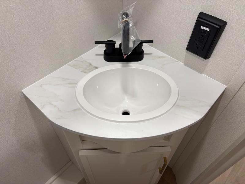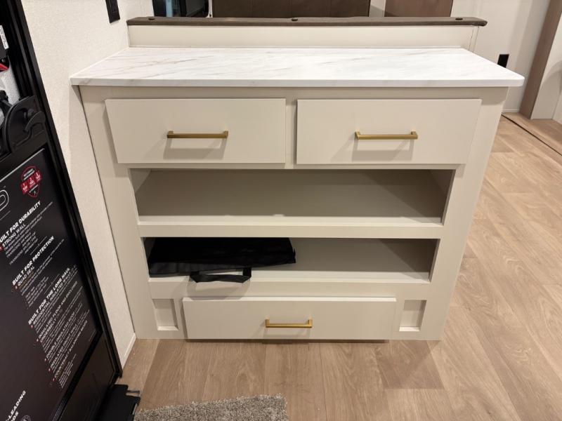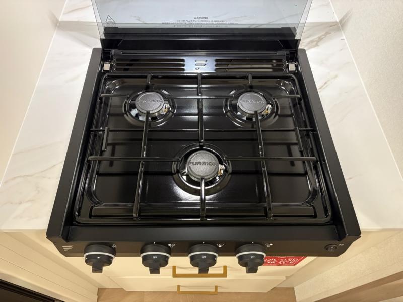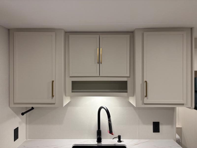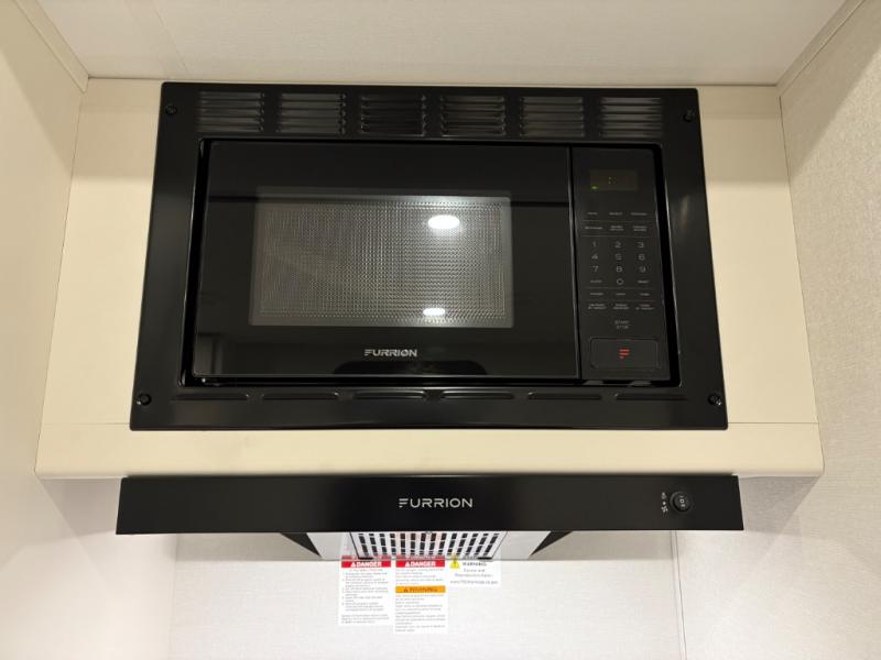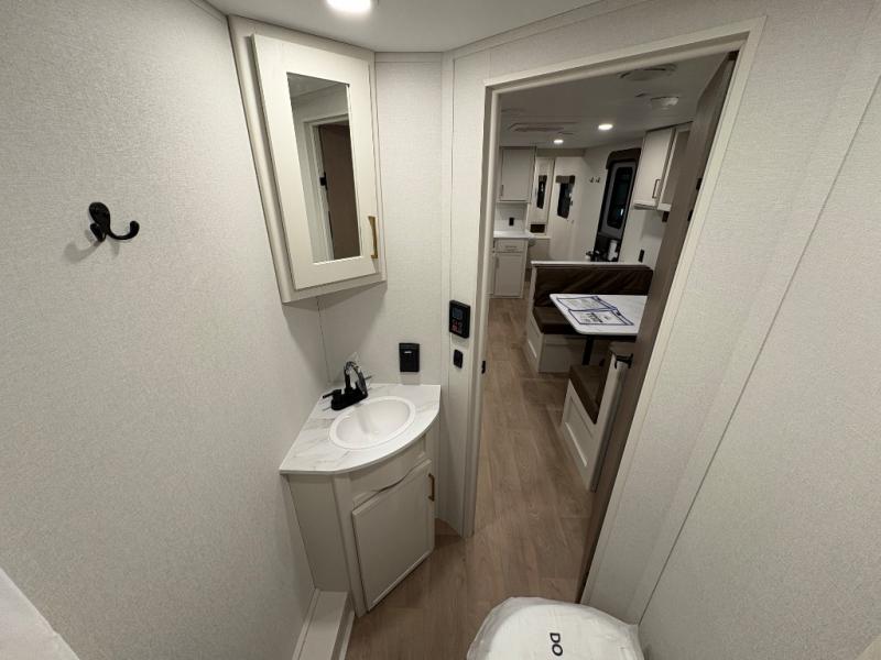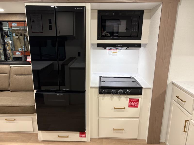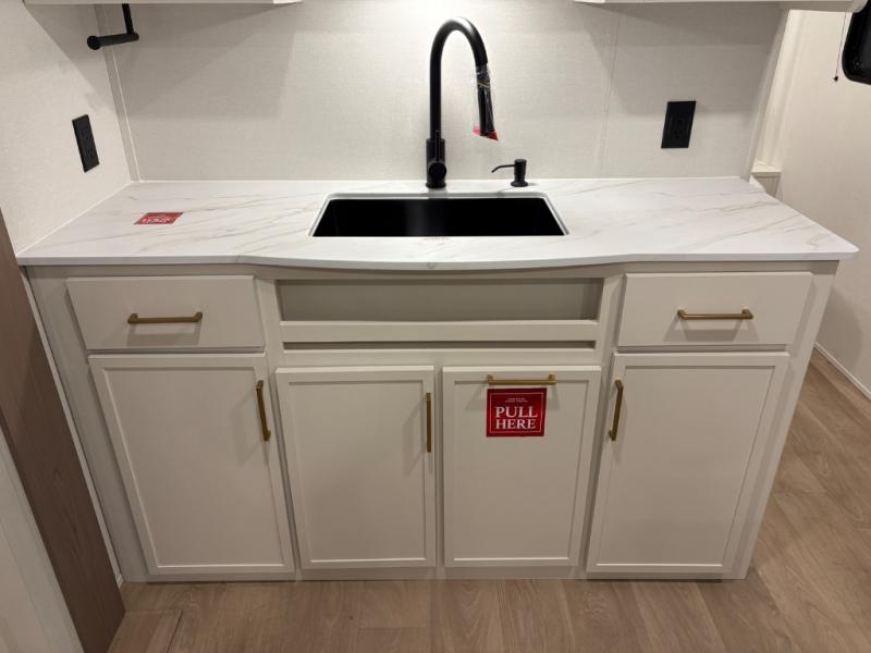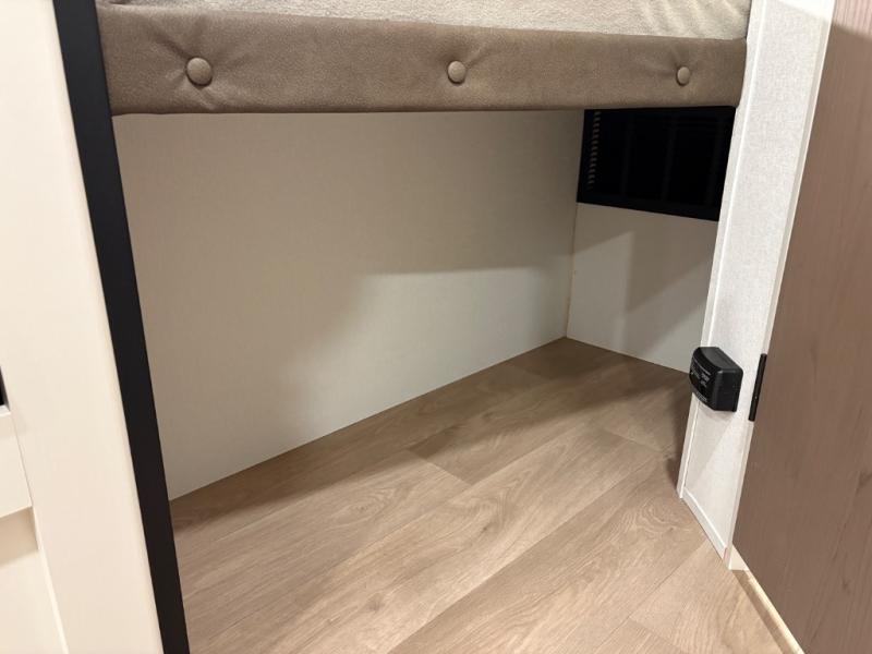 Camping with your larger family or when you want to take along a few extra friends is easy with this trailer. This unit sleeps nine with the double-size bunks in the rear corner, the 60" roll over sofa, and the queen bed in the front semi-private bedroom. The booth dinette can also be used to sleep a guest or two little ones at night once converted. Prepare your meals on the three-burner cooktop indoors, or out on the two-burner cooktop at the outside kitchen! You'll also find a handy exterior spray port and an outdoor refrigerator for cold drinks! It will be so easy to fill the dog's food bowl with the added pet dish under the refrigerator, and the full bath in this model means you don't have to use the camp's facilities. Having a 17' awning outside along with a large unobstructed pass-through compartment allows you extended living outdoors and plenty of space for all of your gear!