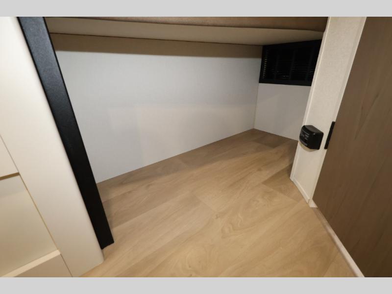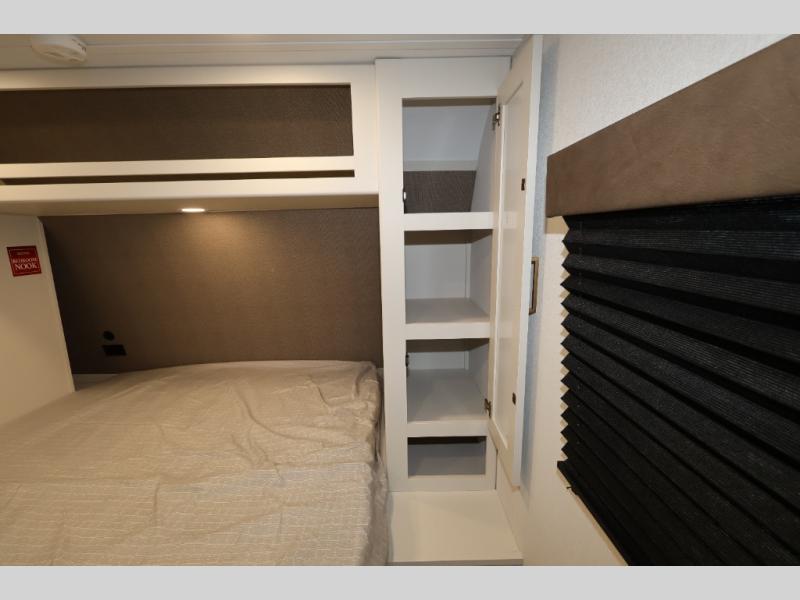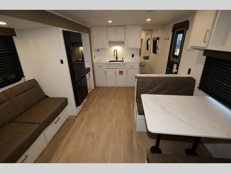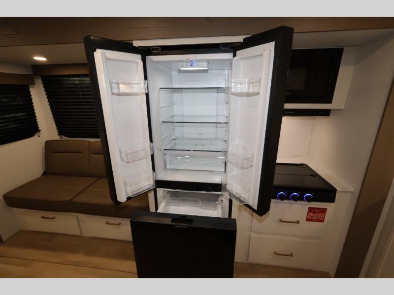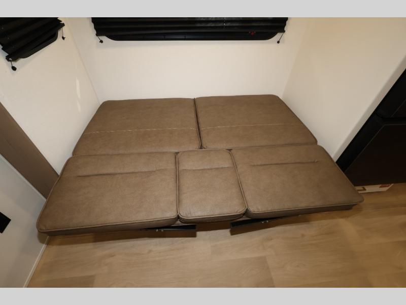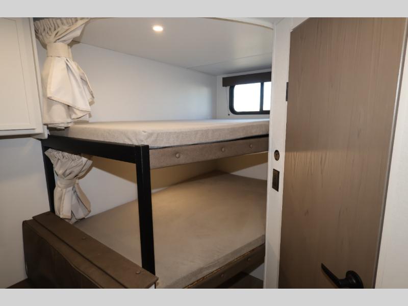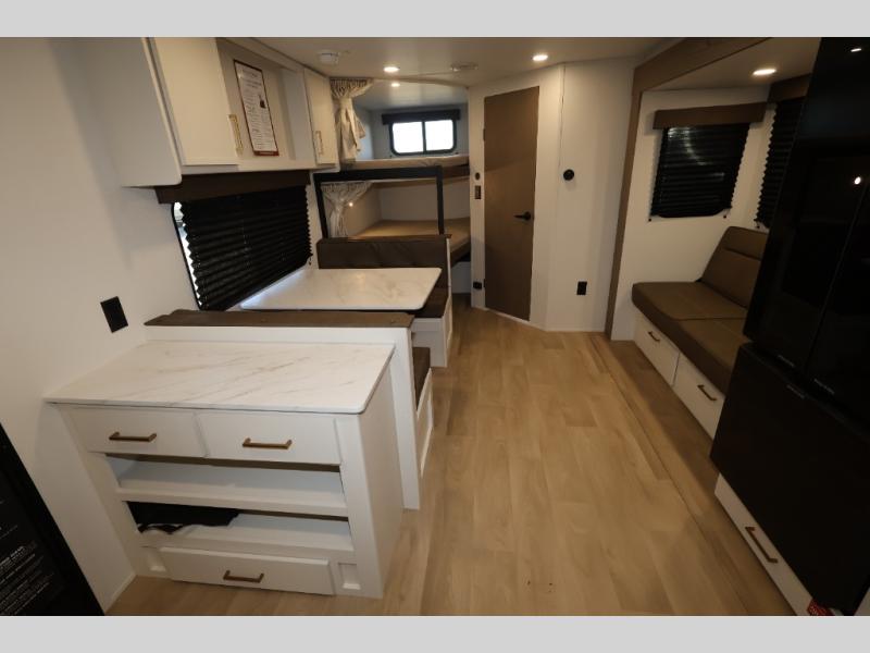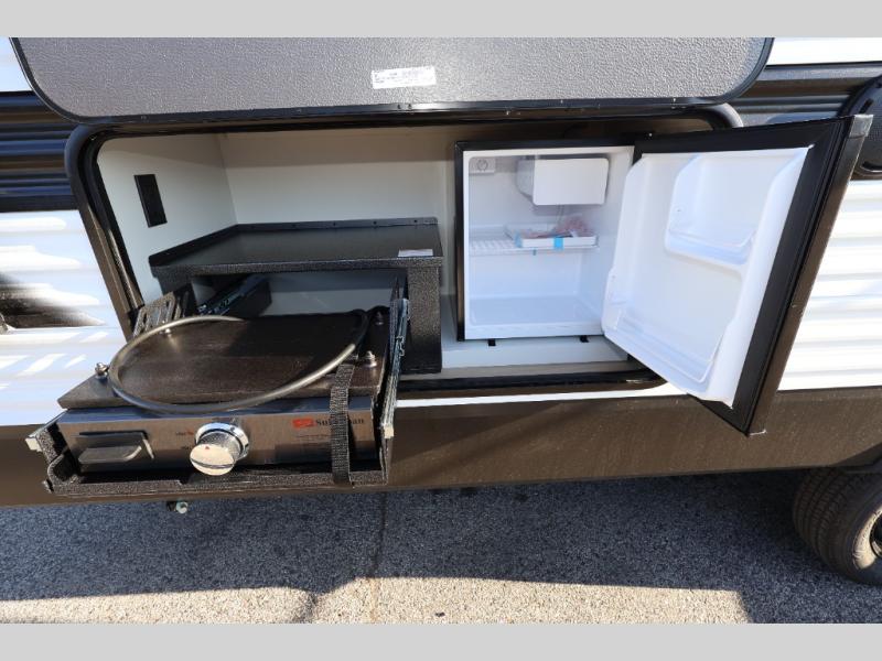 Camping with your larger family or when you want to take along a few extra friends is easy with this trailer. This unit sleeps nine with the double-size bunks in the rear corner, the 60" roll over sofa, and the queen bed in the front semi-private bedroom. The booth dinette can also be used to sleep a guest or two little ones at night once converted. Prepare your meals on the three-burner cooktop indoors, or out on the two-burner cooktop at the outside kitchen! You'll also find a handy exterior spray port and an outdoor refrigerator for cold drinks! It will be so easy to fill the dog's food bowl with the added pet dish under the refrigerator, and the full bath in this model means you don't have to use the camp's facilities. Having a 17' awning outside along with a large unobstructed pass-through compartment allows you extended living outdoors and plenty of space for all of your gear!