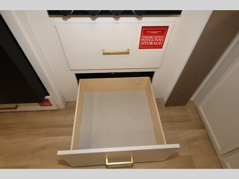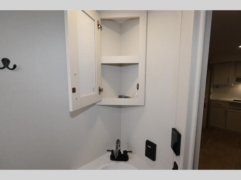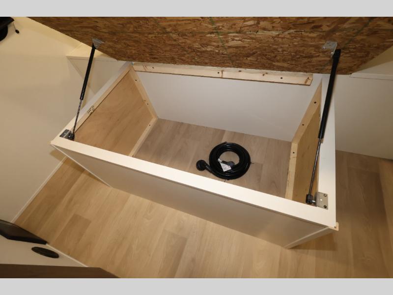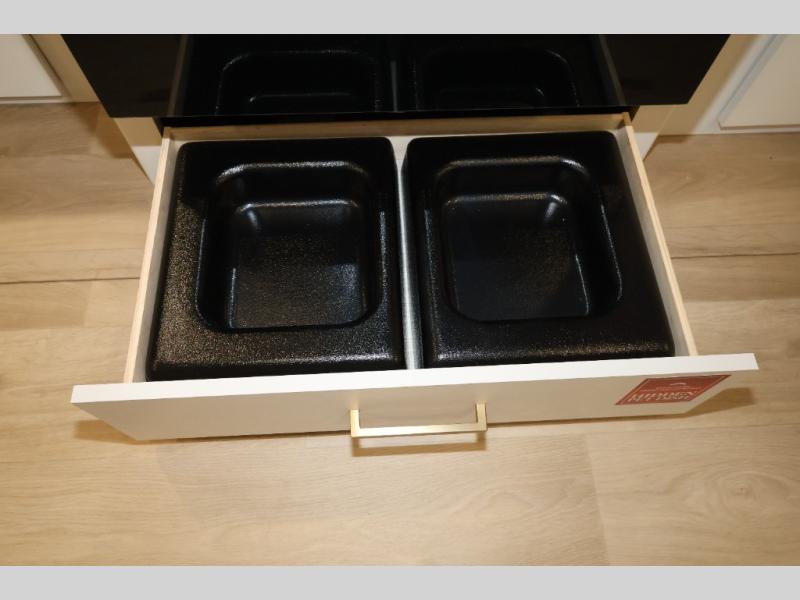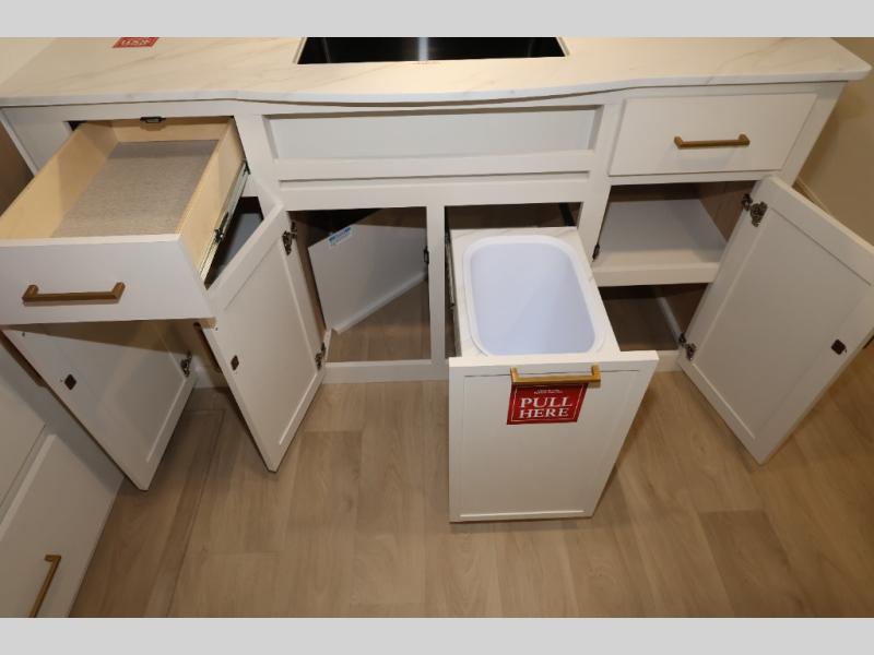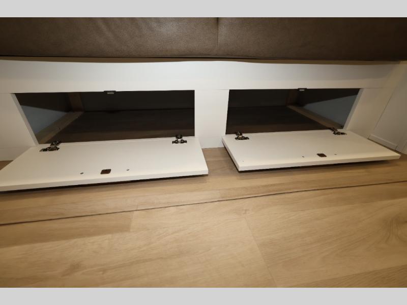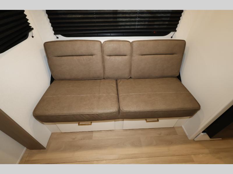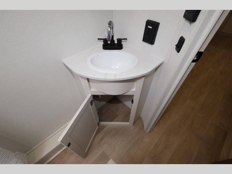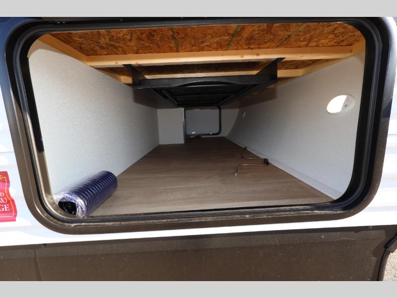 Camping with your larger family or when you want to take along a few extra friends is easy with this trailer. This unit sleeps nine with the double-size bunks in the rear corner, the 60" roll over sofa, and the queen bed in the front semi-private bedroom. The booth dinette can also be used to sleep a guest or two little ones at night once converted. Prepare your meals on the three-burner cooktop indoors, or out on the two-burner cooktop at the outside kitchen! You'll also find a handy exterior spray port and an outdoor refrigerator for cold drinks! It will be so easy to fill the dog's food bowl with the added pet dish under the refrigerator, and the full bath in this model means you don't have to use the camp's facilities. Having a 17' awning outside along with a large unobstructed pass-through compartment allows you extended living outdoors and plenty of space for all of your gear!