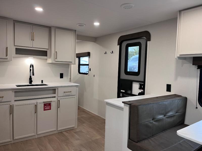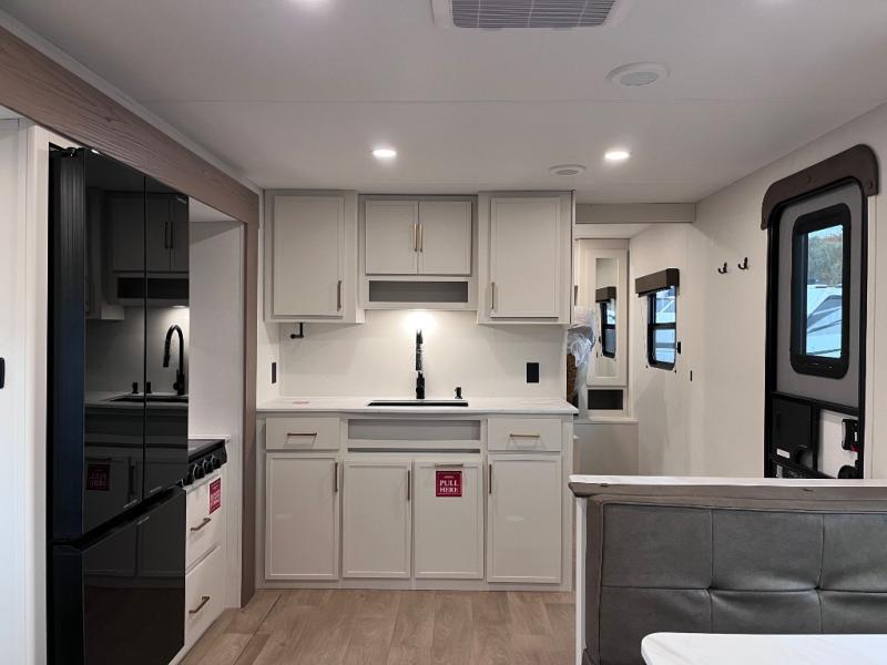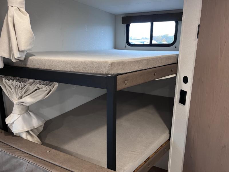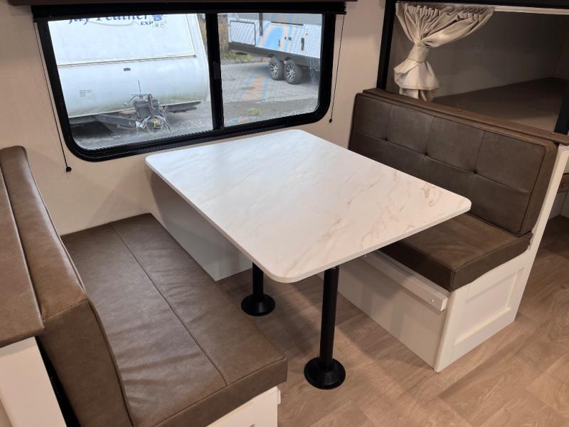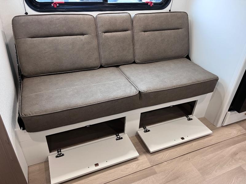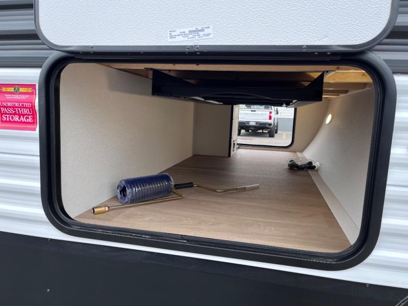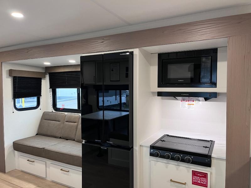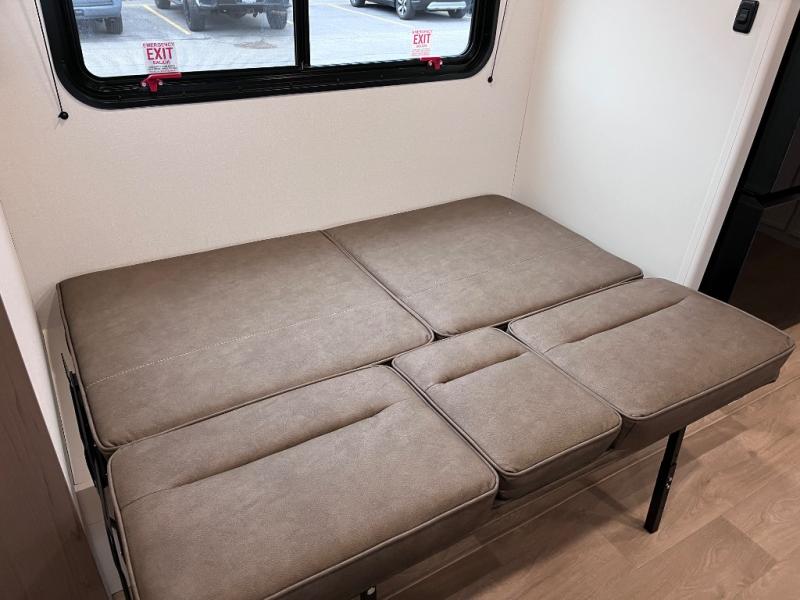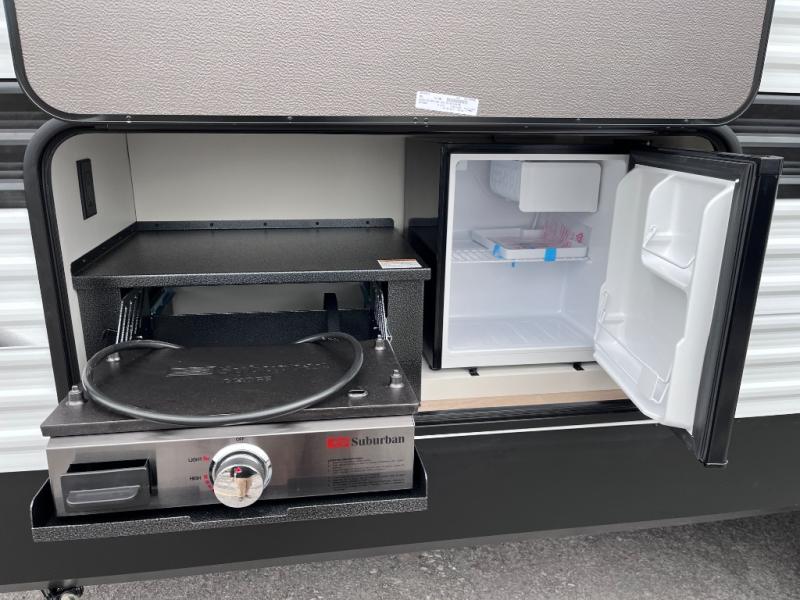 Camping with your larger family or when you want to take along a few extra friends is easy with this trailer. This unit sleeps nine with the double-size bunks in the rear corner, the 60" roll over sofa, and the queen bed in the front semi-private bedroom. The booth dinette can also be used to sleep a guest or two little ones at night once converted. Prepare your meals on the three-burner cooktop indoors, or out on the two-burner cooktop at the outside kitchen! You'll also find a handy exterior spray port and an outdoor refrigerator for cold drinks! It will be so easy to fill the dog's food bowl with the added pet dish under the refrigerator, and the full bath in this model means you don't have to use the camp's facilities. Having a 17' awning outside along with a large unobstructed pass-through compartment allows you extended living outdoors and plenty of space for all of your gear!
