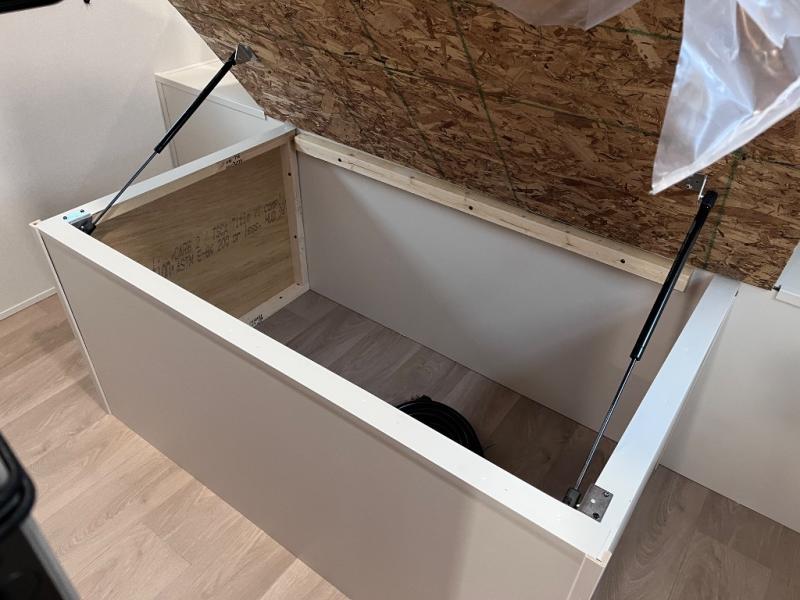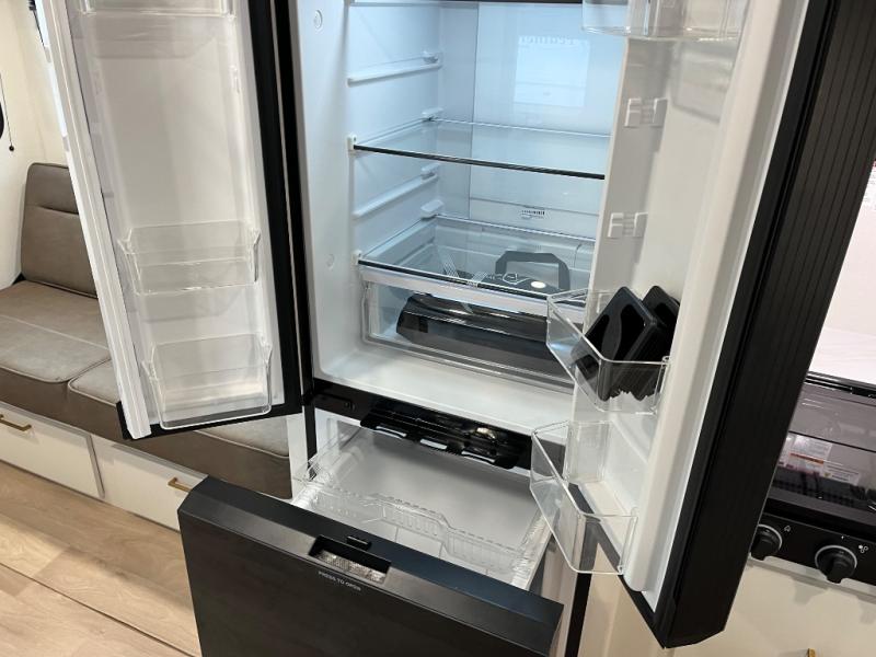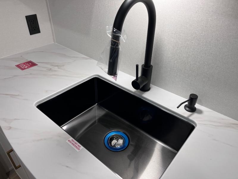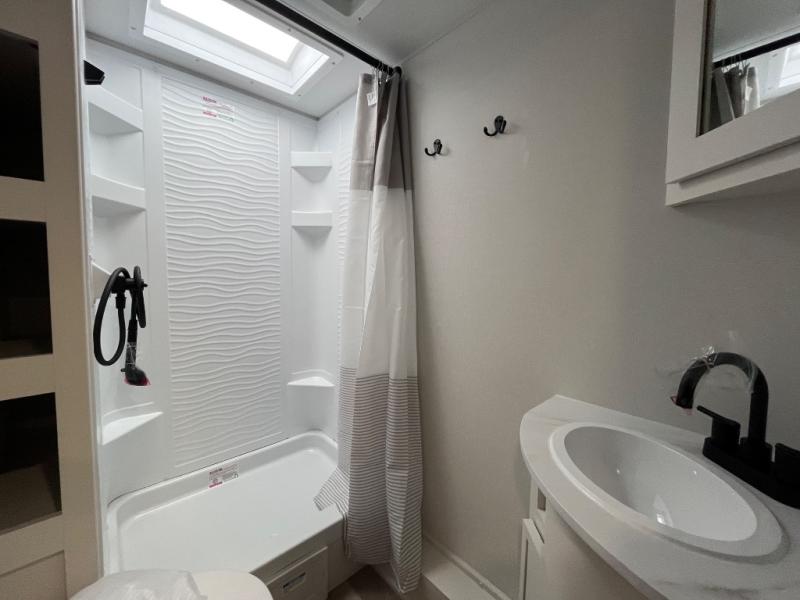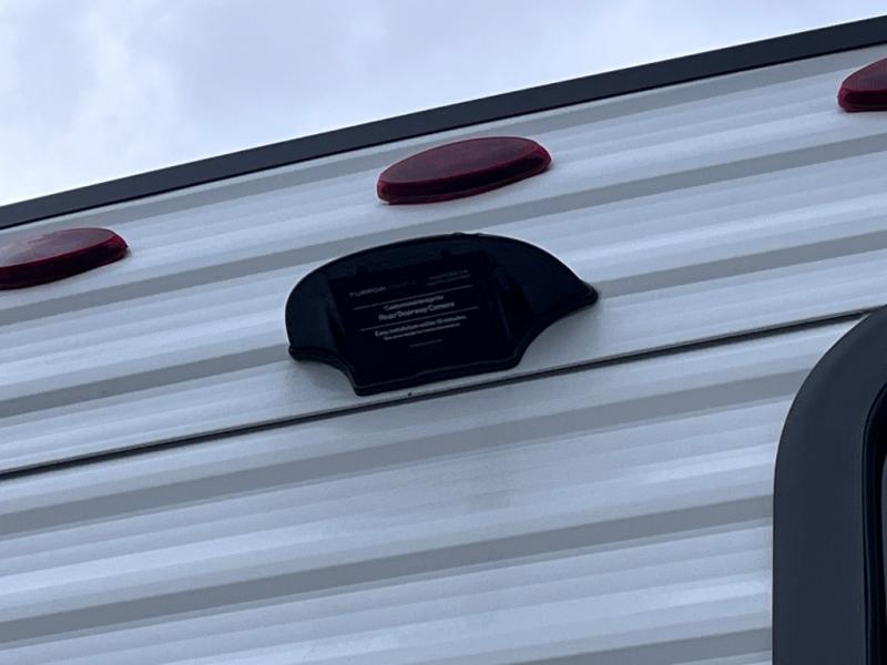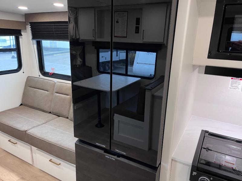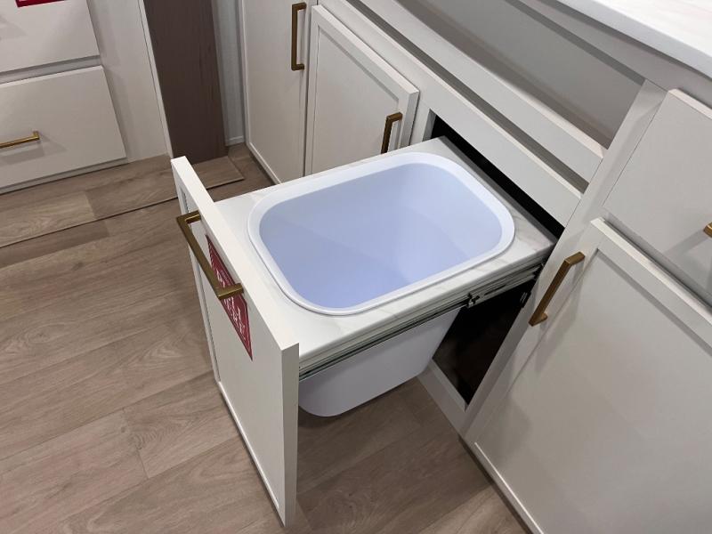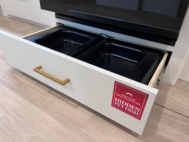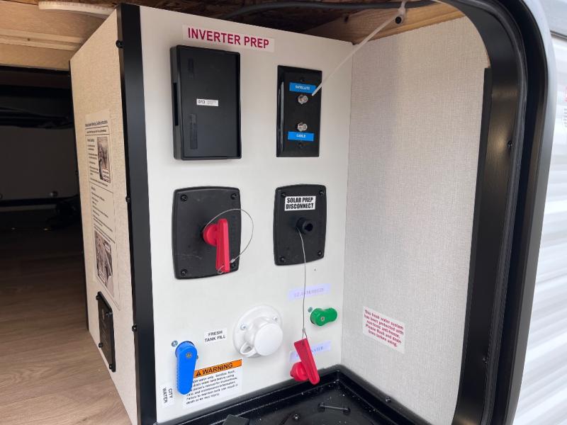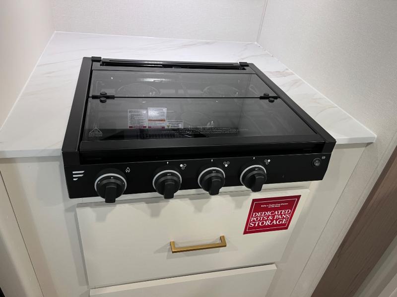 Camping with your larger family or when you want to take along a few extra friends is easy with this trailer. This unit sleeps nine with the double-size bunks in the rear corner, the 60" roll over sofa, and the queen bed in the front semi-private bedroom. The booth dinette can also be used to sleep a guest or two little ones at night once converted. Prepare your meals on the three-burner cooktop indoors, or out on the two-burner cooktop at the outside kitchen! You'll also find a handy exterior spray port and an outdoor refrigerator for cold drinks! It will be so easy to fill the dog's food bowl with the added pet dish under the refrigerator, and the full bath in this model means you don't have to use the camp's facilities. Having a 17' awning outside along with a large unobstructed pass-through compartment allows you extended living outdoors and plenty of space for all of your gear!
