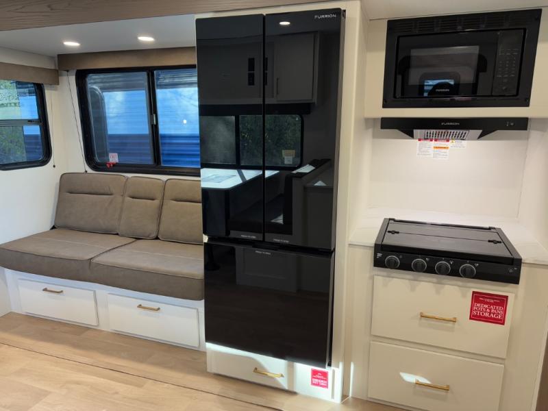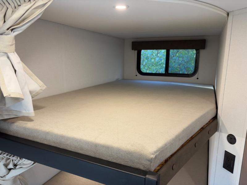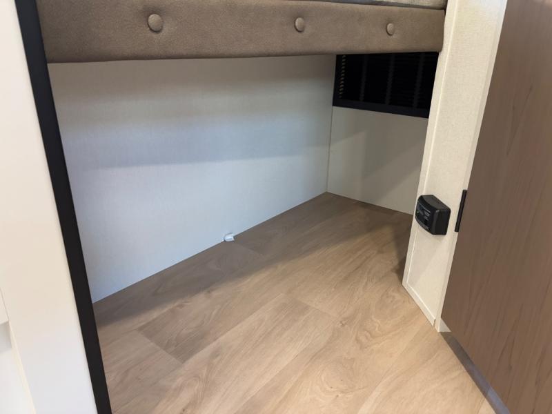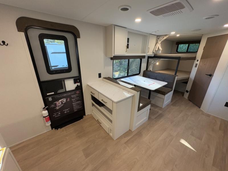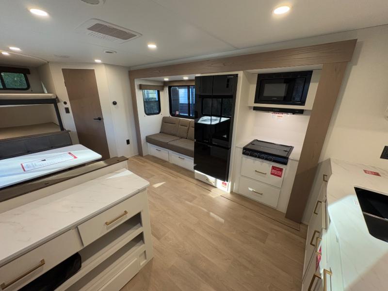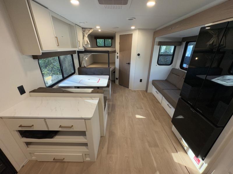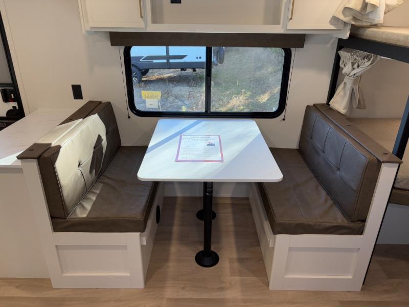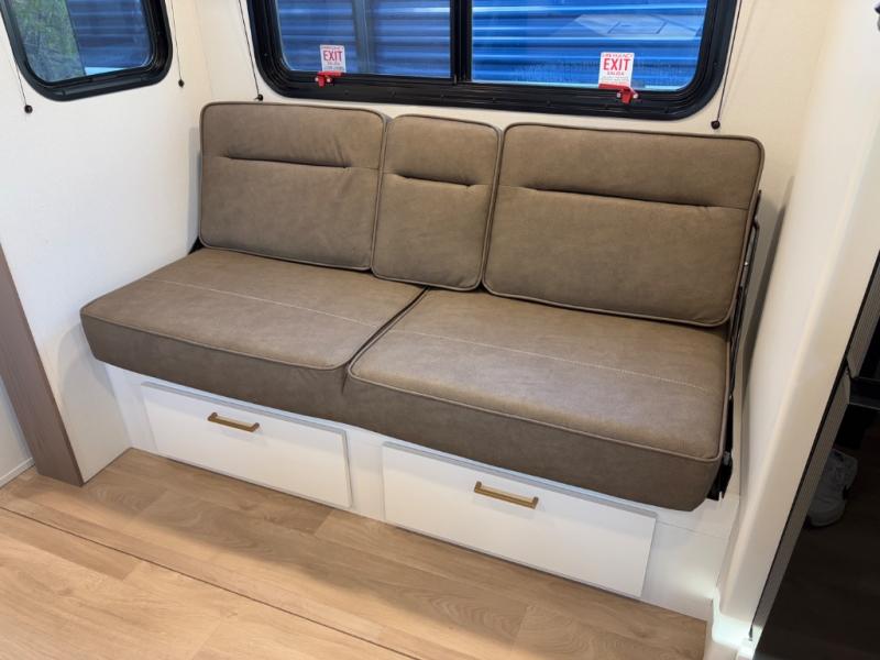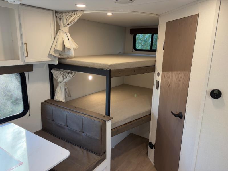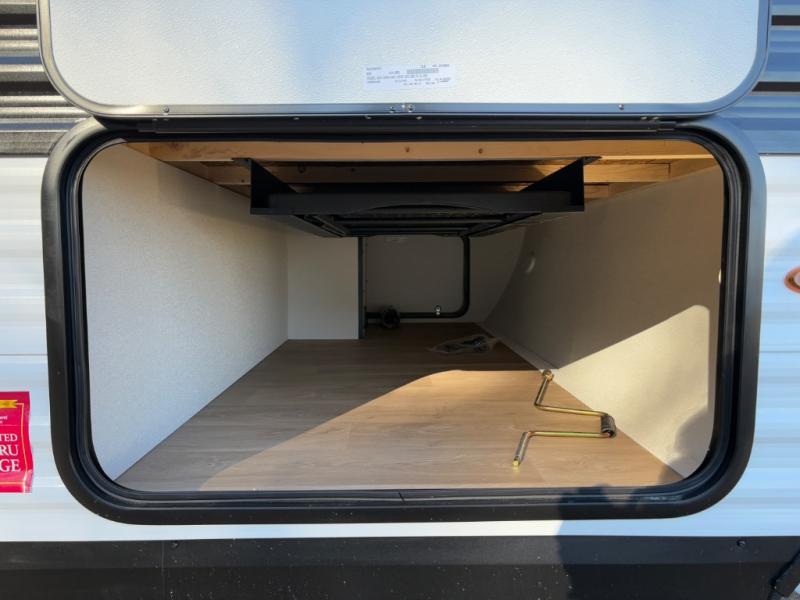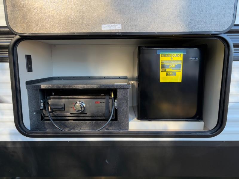 Camping with your larger family or when you want to take along a few extra friends is easy with this trailer. This unit sleeps nine with the double-size bunks in the rear corner, the 60" roll over sofa, and the queen bed in the front semi-private bedroom. The booth dinette can also be used to sleep a guest or two little ones at night once converted. Prepare your meals on the three-burner cooktop indoors, or out on the two-burner cooktop at the outside kitchen! You'll also find a handy exterior spray port and an outdoor refrigerator for cold drinks! It will be so easy to fill the dog's food bowl with the added pet dish under the refrigerator, and the full bath in this model means you don't have to use the camp's facilities. Having a 17' awning outside along with a large unobstructed pass-through compartment allows you extended living outdoors and plenty of space for all of your gear!
