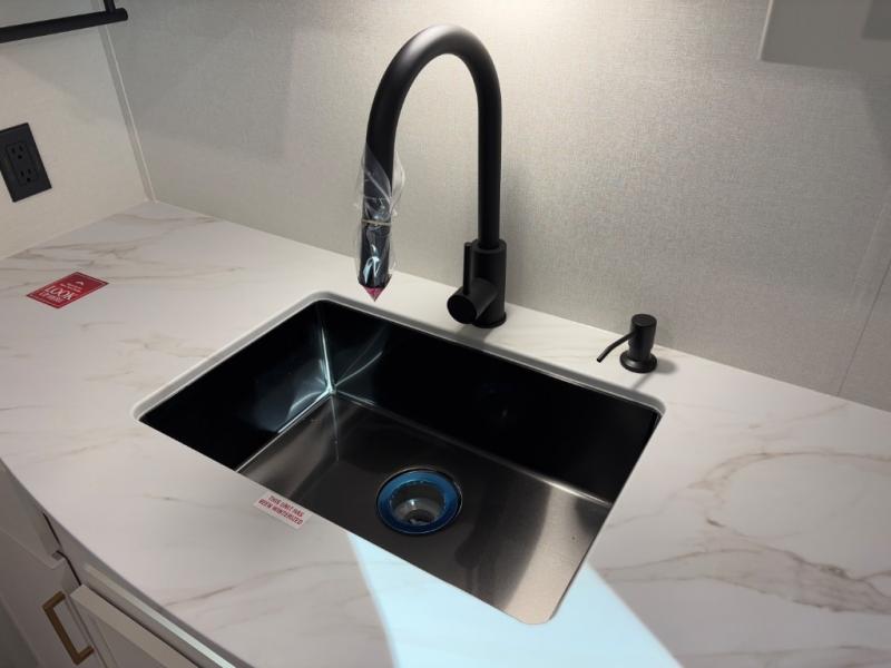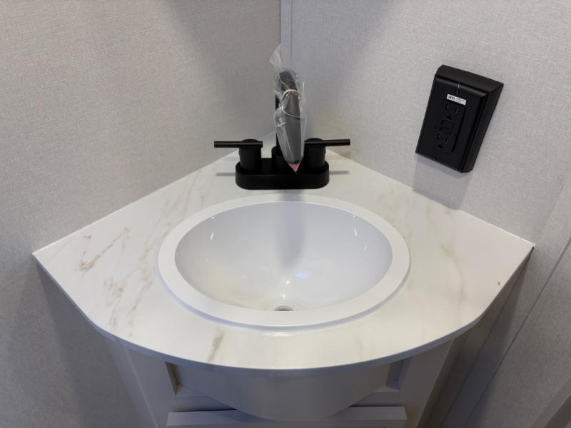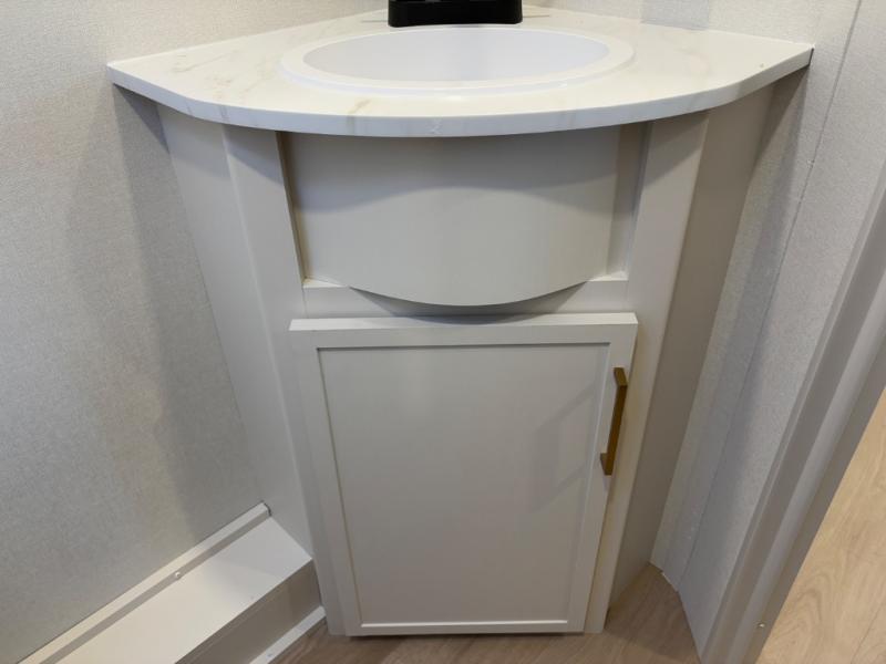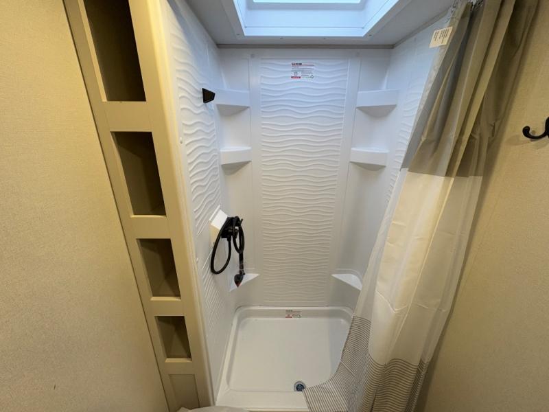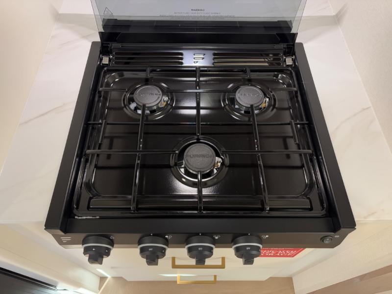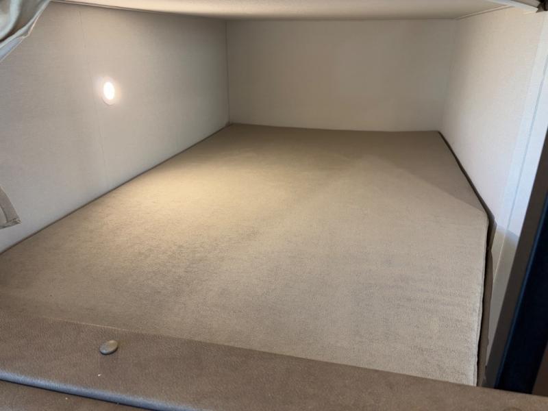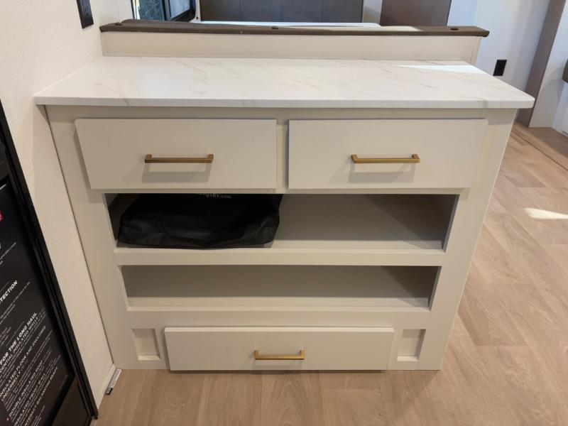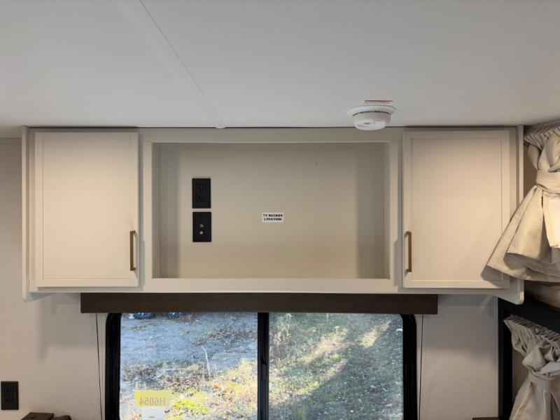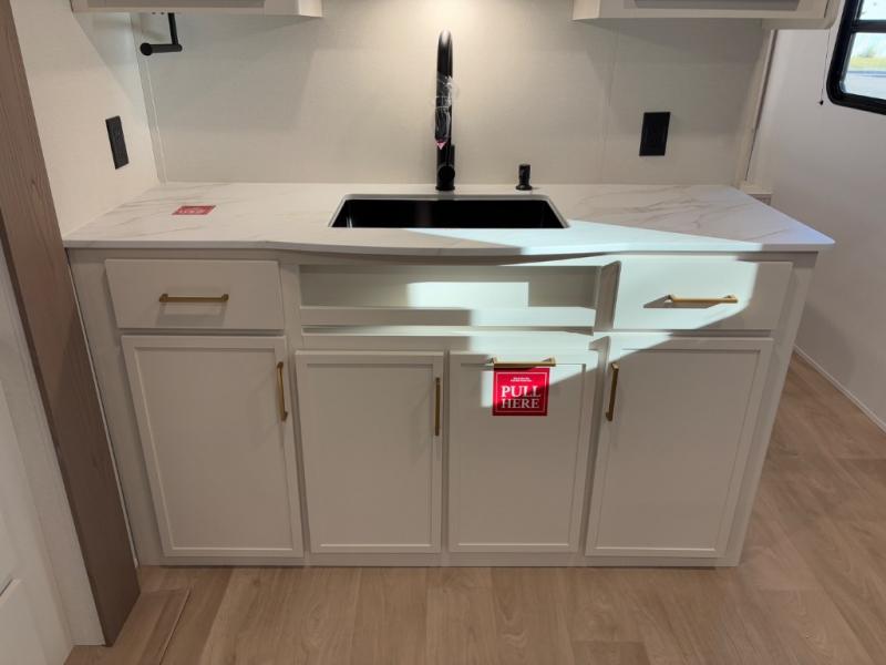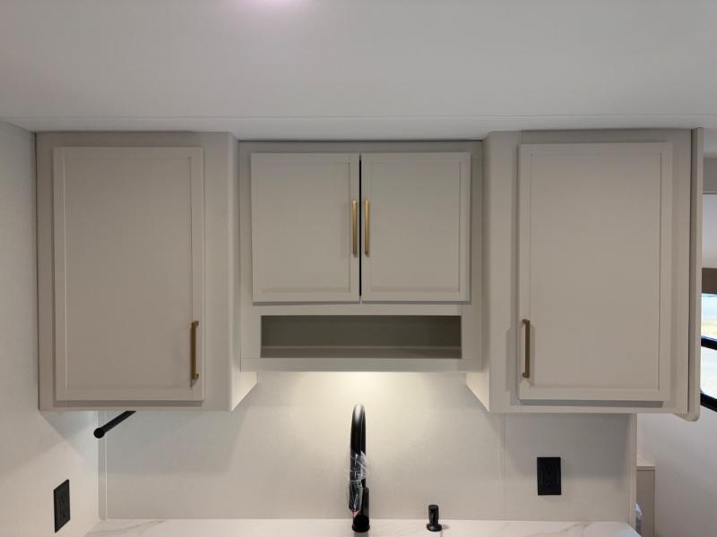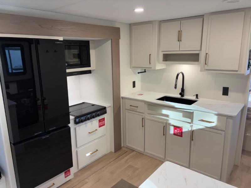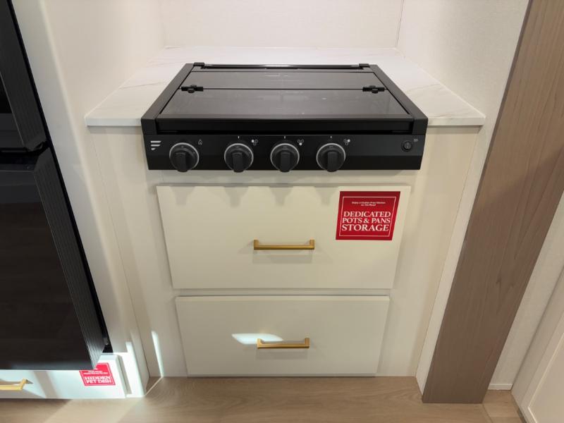 Camping with your larger family or when you want to take along a few extra friends is easy with this trailer. This unit sleeps nine with the double-size bunks in the rear corner, the 60" roll over sofa, and the queen bed in the front semi-private bedroom. The booth dinette can also be used to sleep a guest or two little ones at night once converted. Prepare your meals on the three-burner cooktop indoors, or out on the two-burner cooktop at the outside kitchen! You'll also find a handy exterior spray port and an outdoor refrigerator for cold drinks! It will be so easy to fill the dog's food bowl with the added pet dish under the refrigerator, and the full bath in this model means you don't have to use the camp's facilities. Having a 17' awning outside along with a large unobstructed pass-through compartment allows you extended living outdoors and plenty of space for all of your gear!