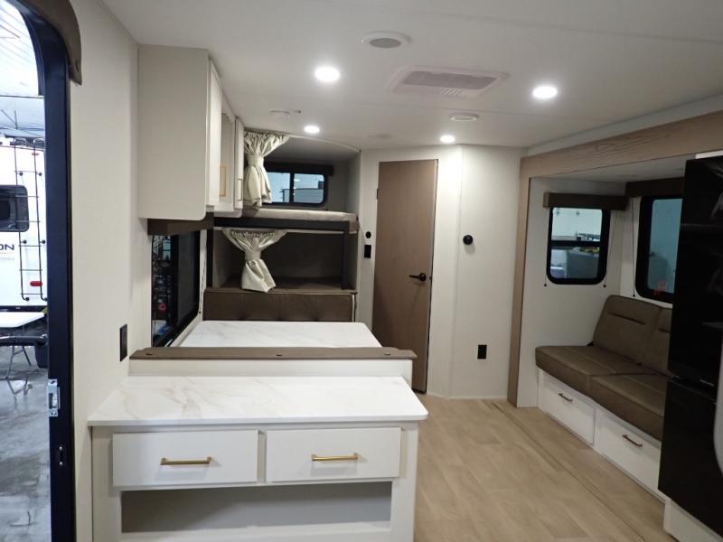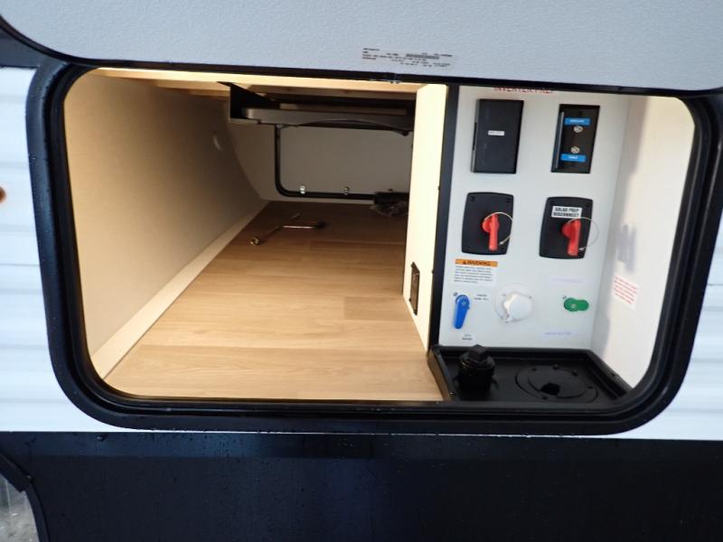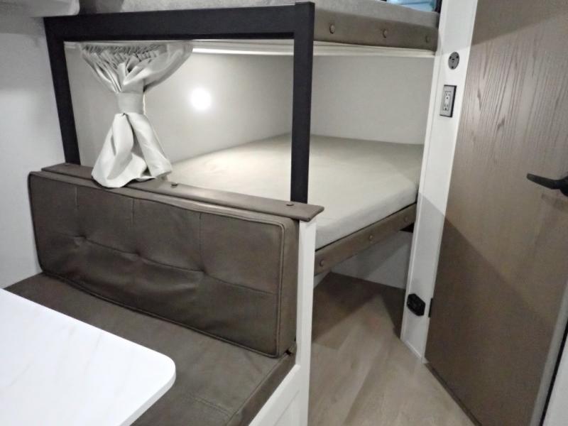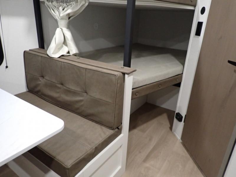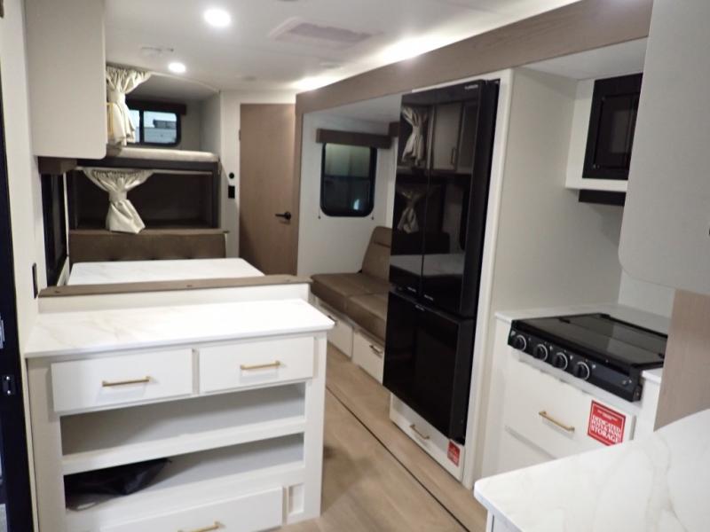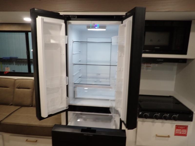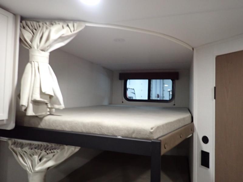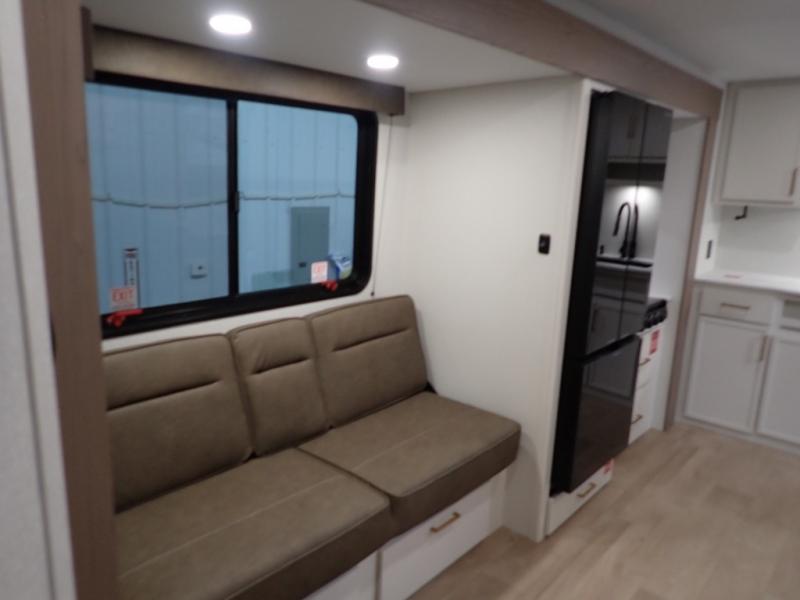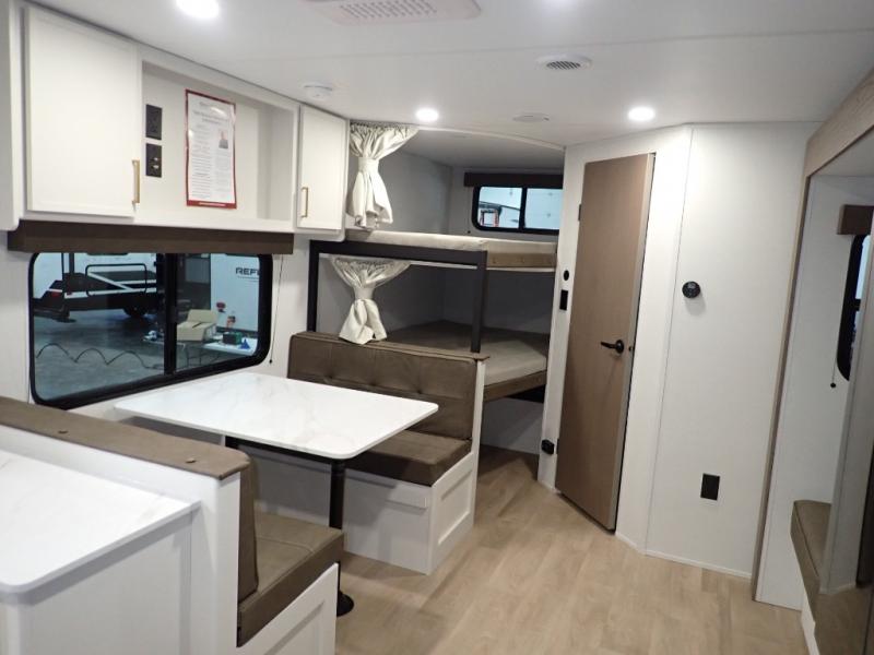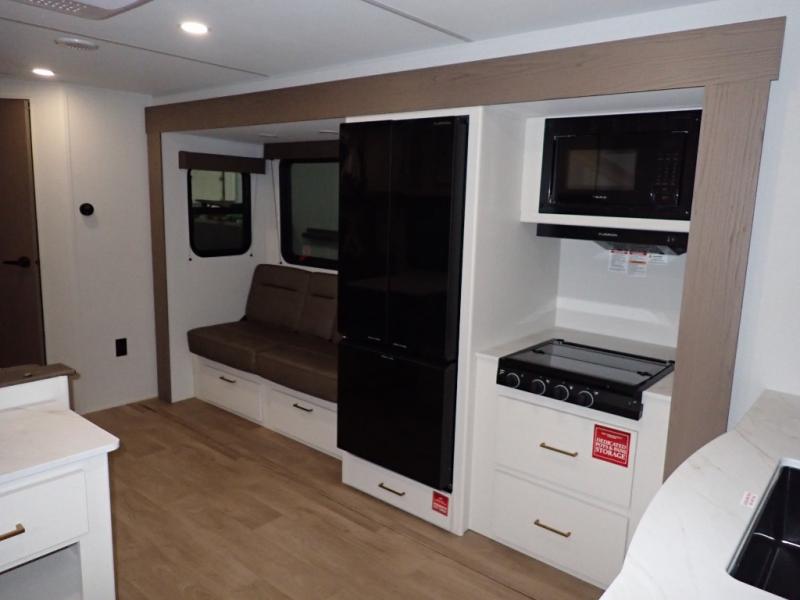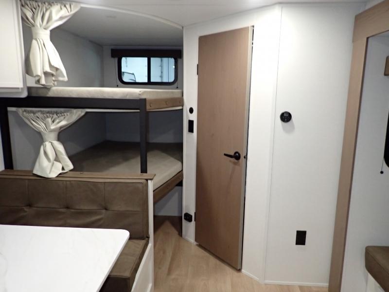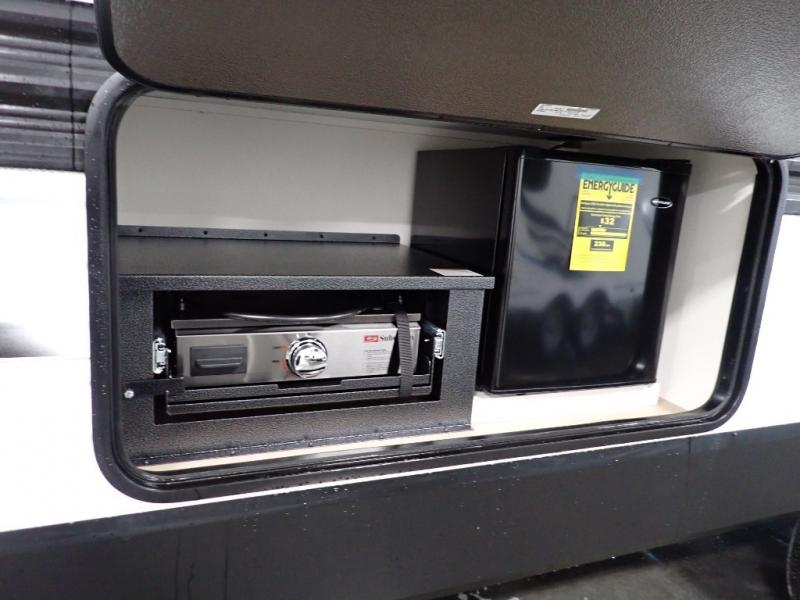 Camping with your larger family or when you want to take along a few extra friends is easy with this trailer. This unit sleeps nine with the double-size bunks in the rear corner, the 60" roll over sofa, and the queen bed in the front semi-private bedroom. The booth dinette can also be used to sleep a guest or two little ones at night once converted. Prepare your meals on the three-burner cooktop indoors, or out on the two-burner cooktop at the outside kitchen! You'll also find a handy exterior spray port and an outdoor refrigerator for cold drinks! It will be so easy to fill the dog's food bowl with the added pet dish under the refrigerator, and the full bath in this model means you don't have to use the camp's facilities. Having a 17' awning outside along with a large unobstructed pass-through compartment allows you extended living outdoors and plenty of space for all of your gear!