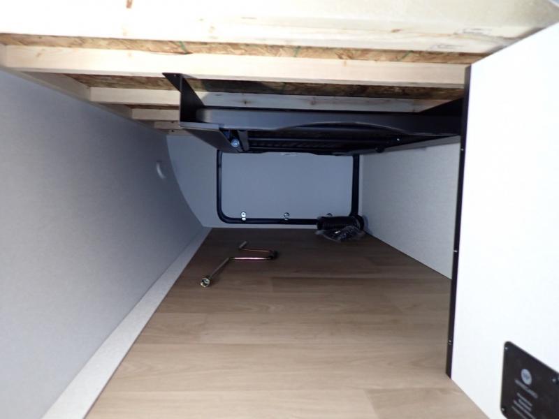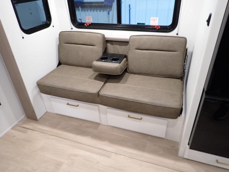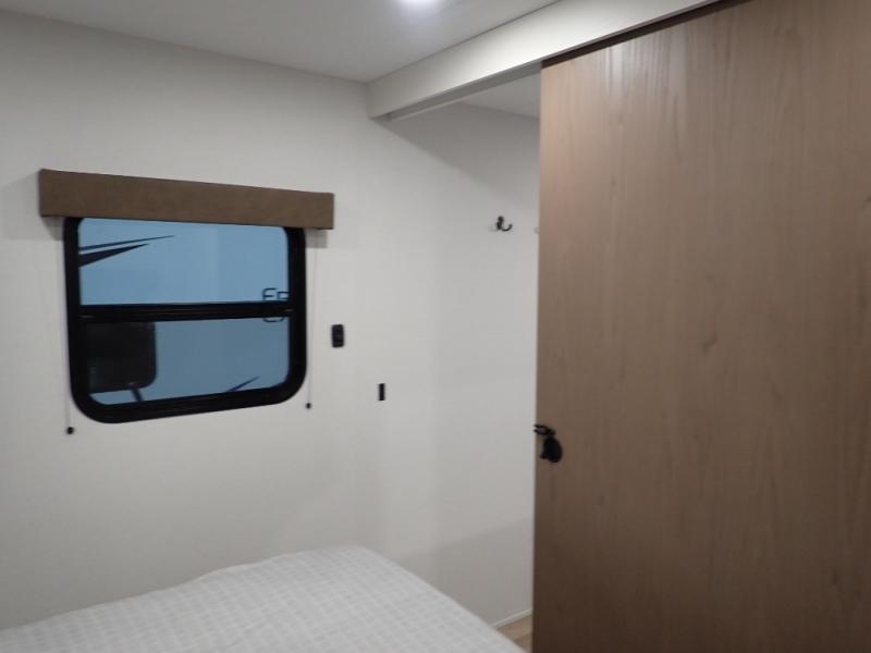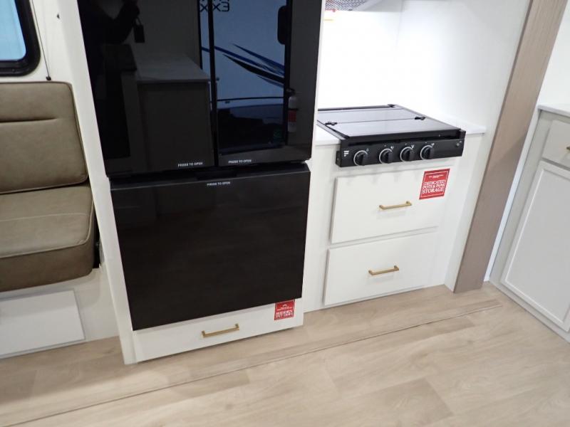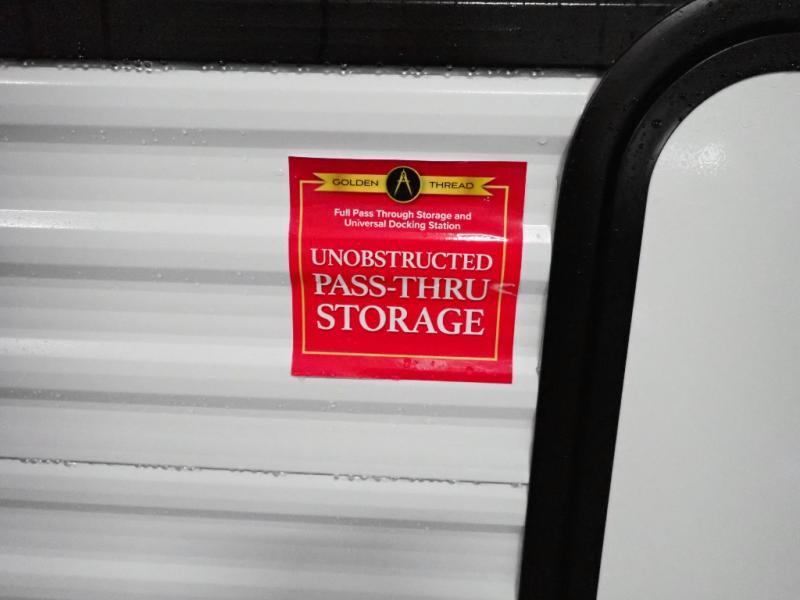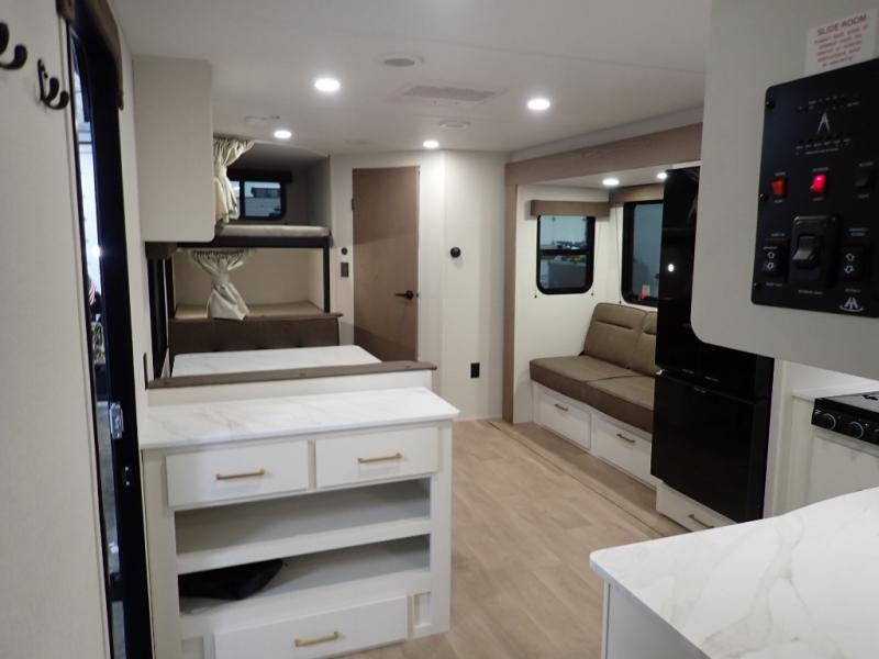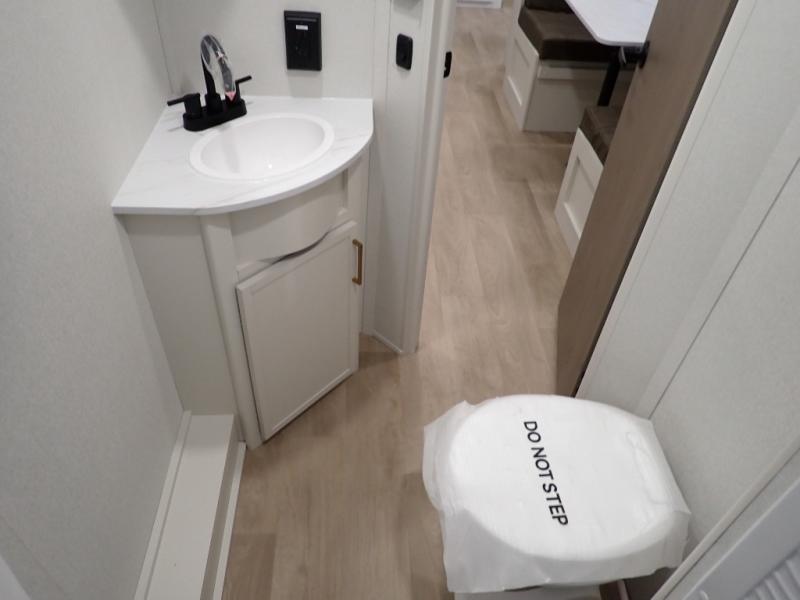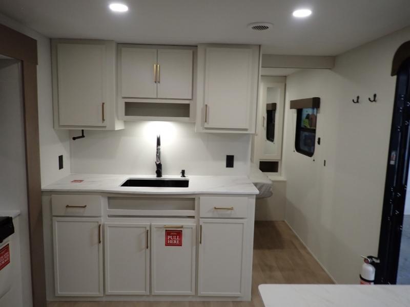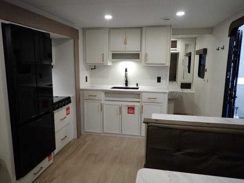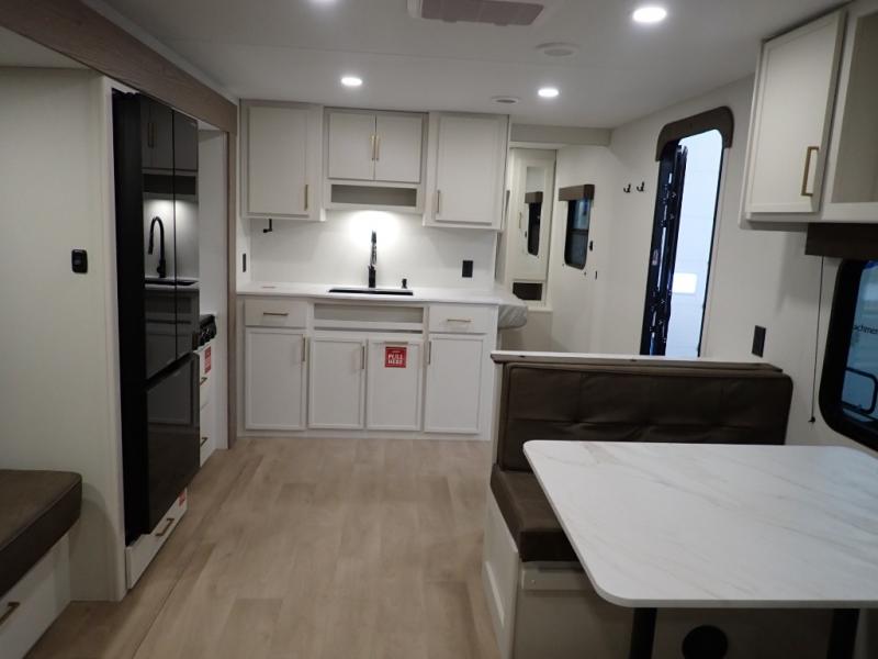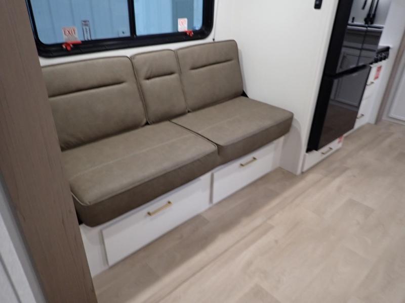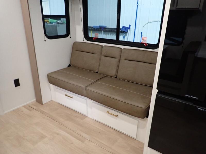 Camping with your larger family or when you want to take along a few extra friends is easy with this trailer. This unit sleeps nine with the double-size bunks in the rear corner, the 60" roll over sofa, and the queen bed in the front semi-private bedroom. The booth dinette can also be used to sleep a guest or two little ones at night once converted. Prepare your meals on the three-burner cooktop indoors, or out on the two-burner cooktop at the outside kitchen! You'll also find a handy exterior spray port and an outdoor refrigerator for cold drinks! It will be so easy to fill the dog's food bowl with the added pet dish under the refrigerator, and the full bath in this model means you don't have to use the camp's facilities. Having a 17' awning outside along with a large unobstructed pass-through compartment allows you extended living outdoors and plenty of space for all of your gear!