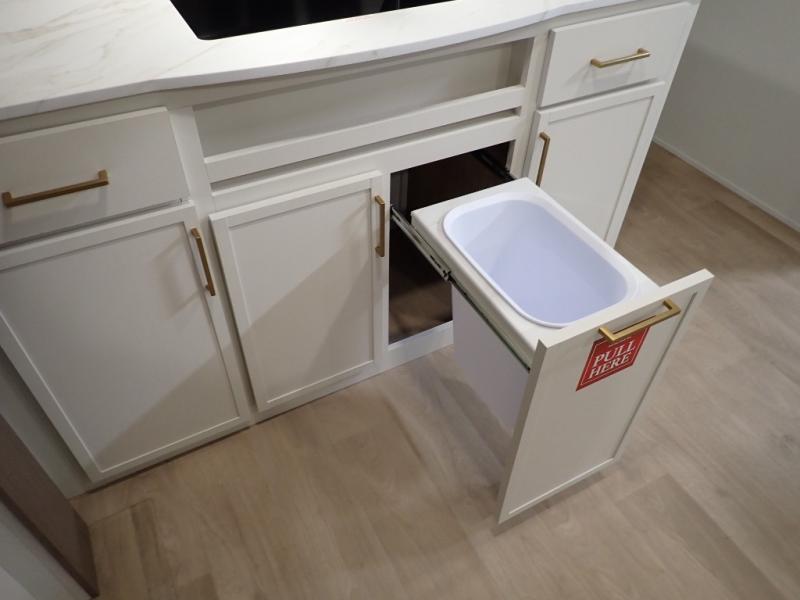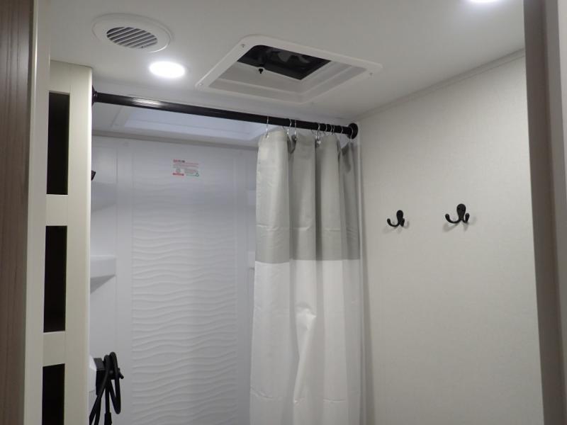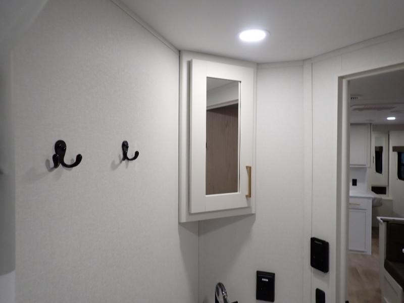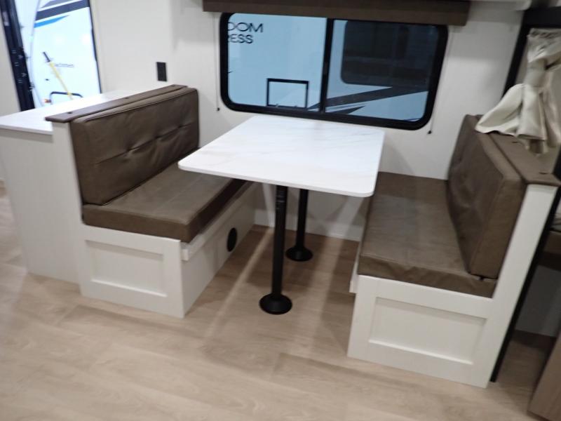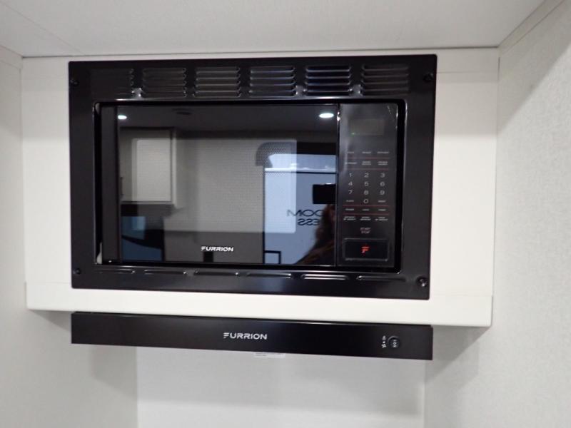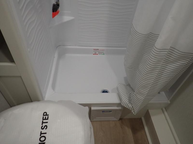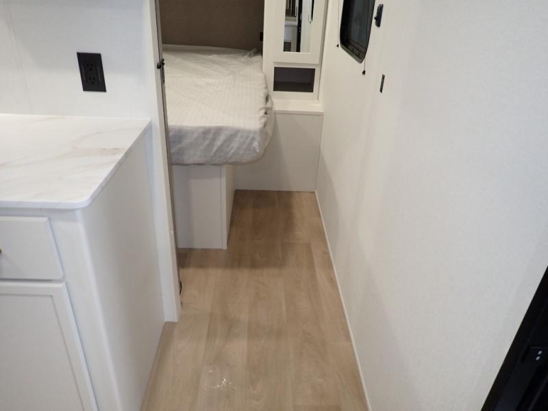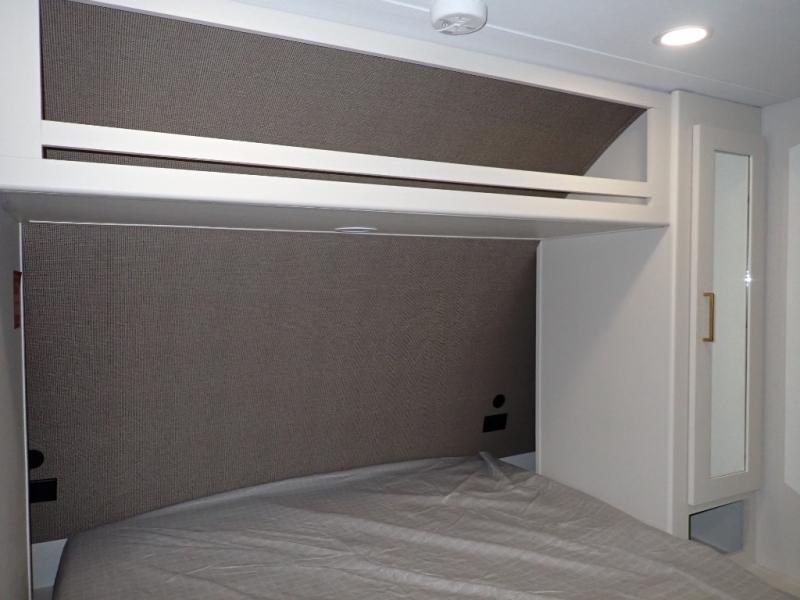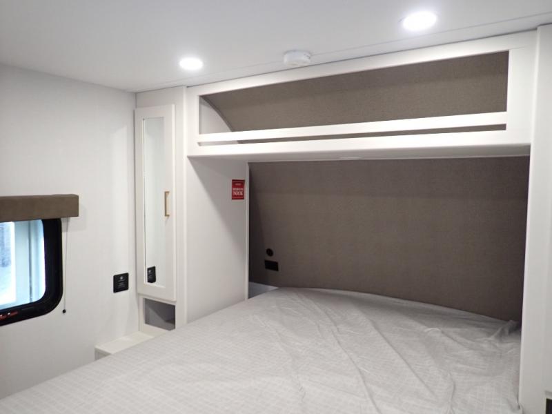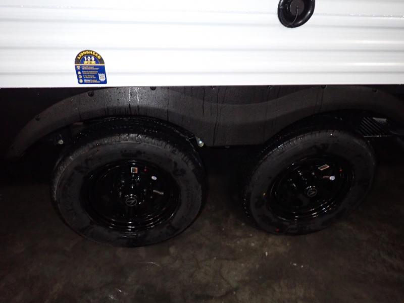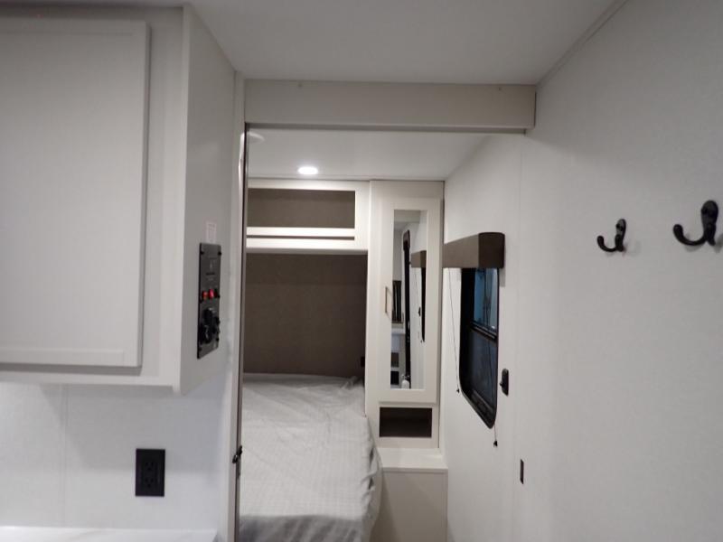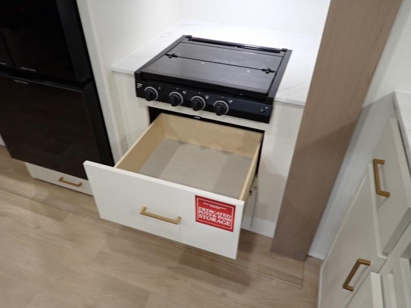 Camping with your larger family or when you want to take along a few extra friends is easy with this trailer. This unit sleeps nine with the double-size bunks in the rear corner, the 60" roll over sofa, and the queen bed in the front semi-private bedroom. The booth dinette can also be used to sleep a guest or two little ones at night once converted. Prepare your meals on the three-burner cooktop indoors, or out on the two-burner cooktop at the outside kitchen! You'll also find a handy exterior spray port and an outdoor refrigerator for cold drinks! It will be so easy to fill the dog's food bowl with the added pet dish under the refrigerator, and the full bath in this model means you don't have to use the camp's facilities. Having a 17' awning outside along with a large unobstructed pass-through compartment allows you extended living outdoors and plenty of space for all of your gear!