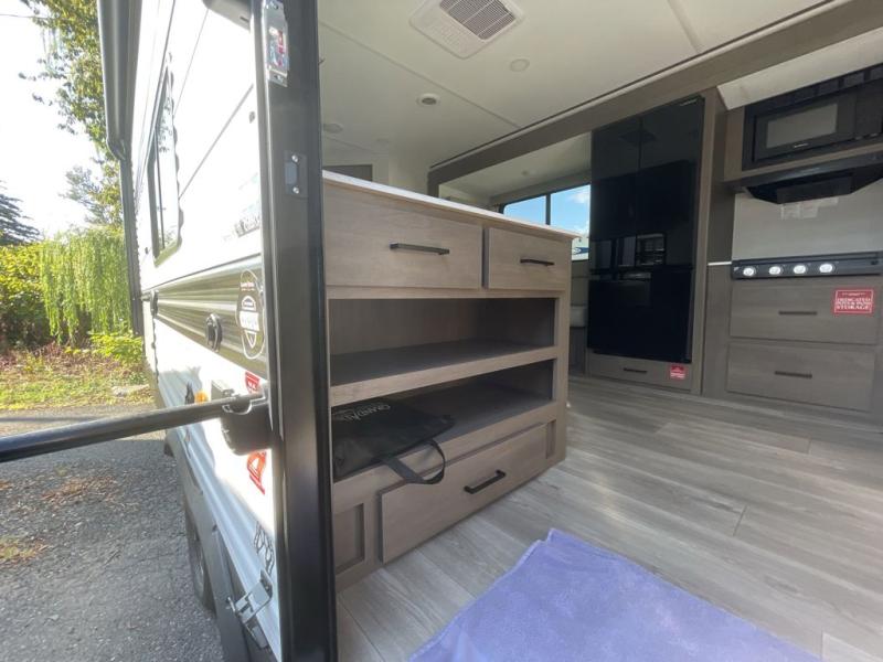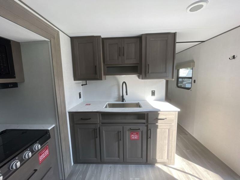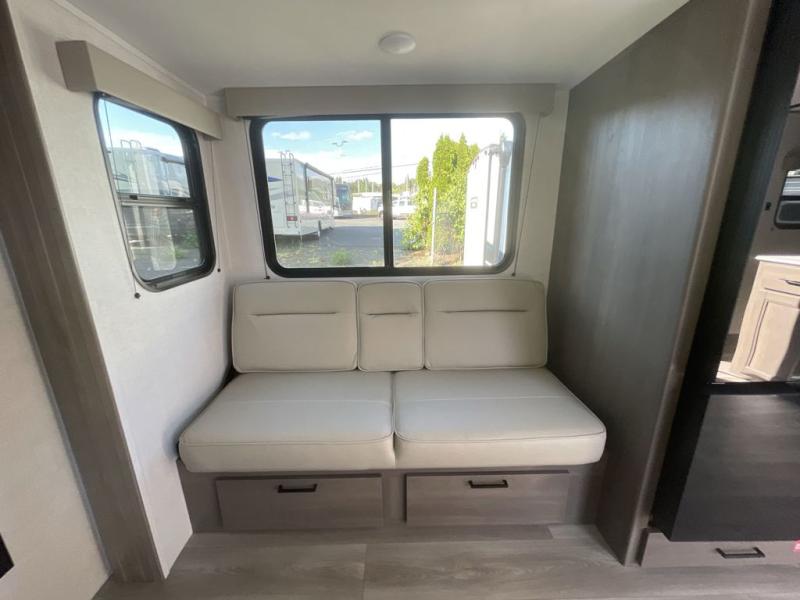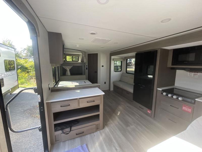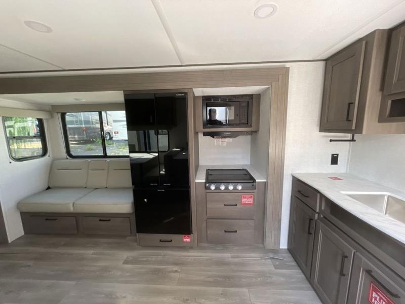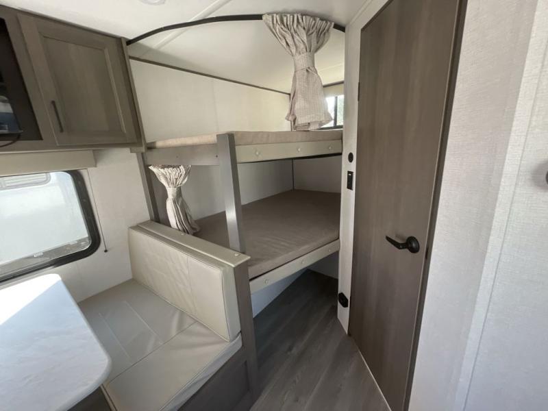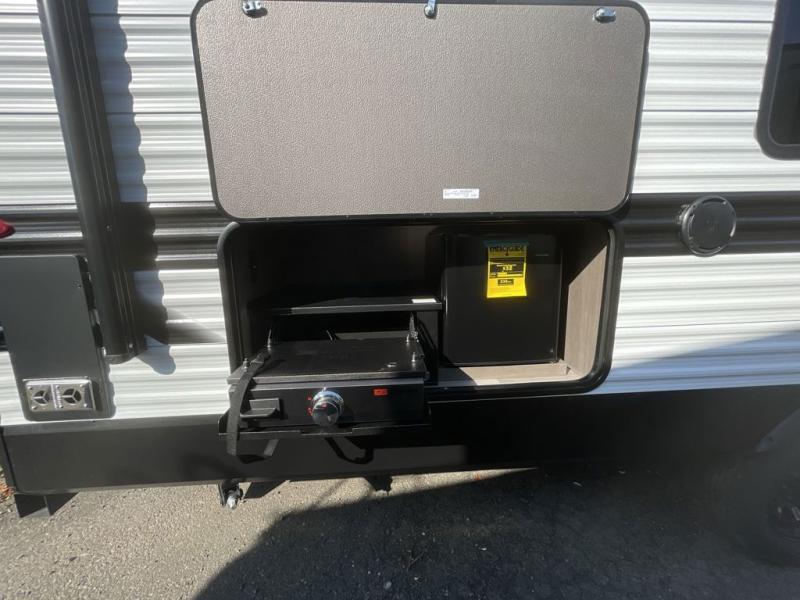 Camping with your larger family or when you want to take along a few extra friends is easy with this trailer. This unit sleeps nine with the double-size bunks in the rear corner, the 60" roll over sofa, and the queen bed in the front semi-private bedroom. The booth dinette can also be used to sleep a guest or two little ones at night once converted. Prepare your meals on the three-burner cooktop indoors, or out on the two-burner cooktop at the outside kitchen! You'll also find a handy exterior spray port and an outdoor refrigerator for cold drinks! It will be so easy to fill the dog's food bowl with the added pet dish under the refrigerator, and the full bath in this model means you don't have to use the camp's facilities. Having a 17' awning outside along with a large unobstructed pass-through compartment allows you extended living outdoors and plenty of space for all of your gear!