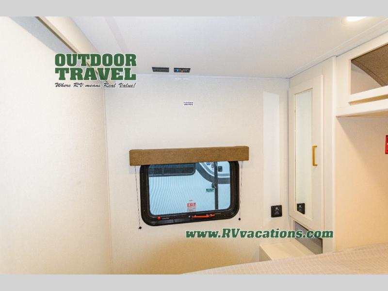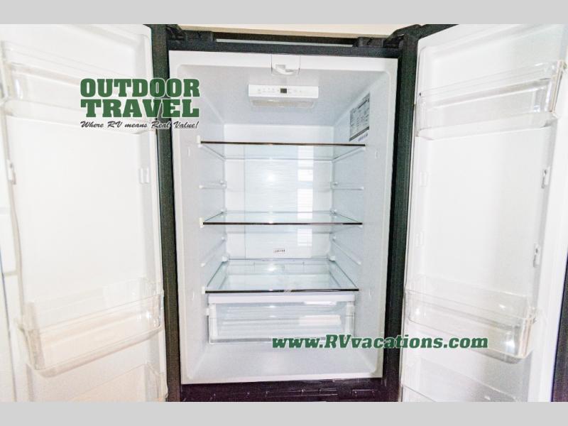 Camping with your larger family or when you want to take along a few extra friends is easy with this trailer. This unit sleeps nine with the double-size bunks in the rear corner, the 60" roll over sofa, and the queen bed in the front semi-private bedroom. The booth dinette can also be used to sleep a guest or two little ones at night once converted. Prepare your meals on the three-burner cooktop indoors, or out on the two-burner cooktop at the outside kitchen! You'll also find a handy exterior spray port and an outdoor refrigerator for cold drinks! It will be so easy to fill the dog's food bowl with the added pet dish under the refrigerator, and the full bath in this model means you don't have to use the camp's facilities. Having a 17' awning outside along with a large unobstructed pass-through compartment allows you extended living outdoors and plenty of space for all of your gear!