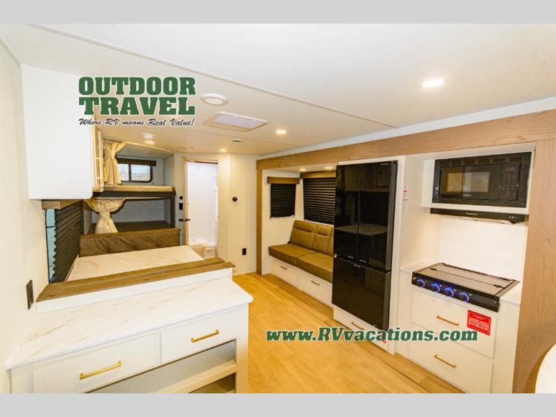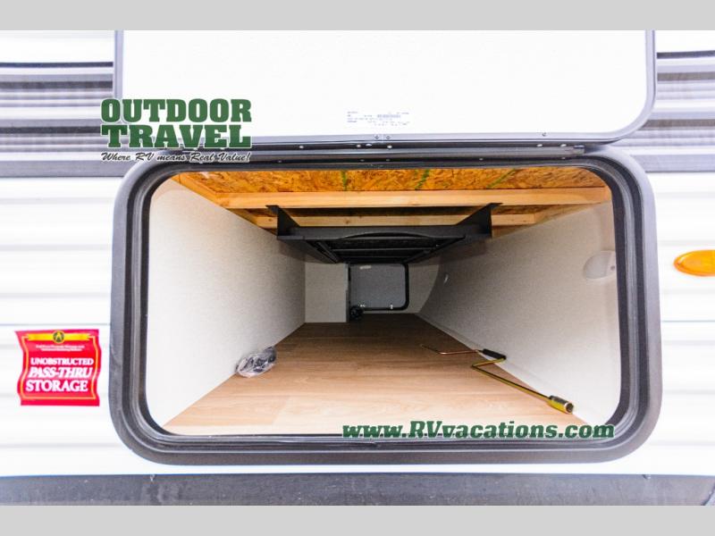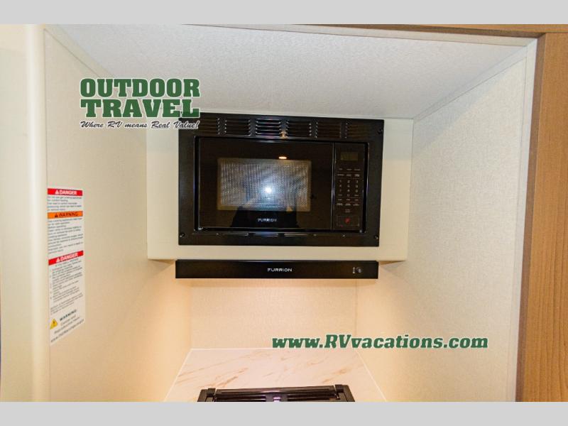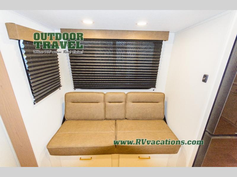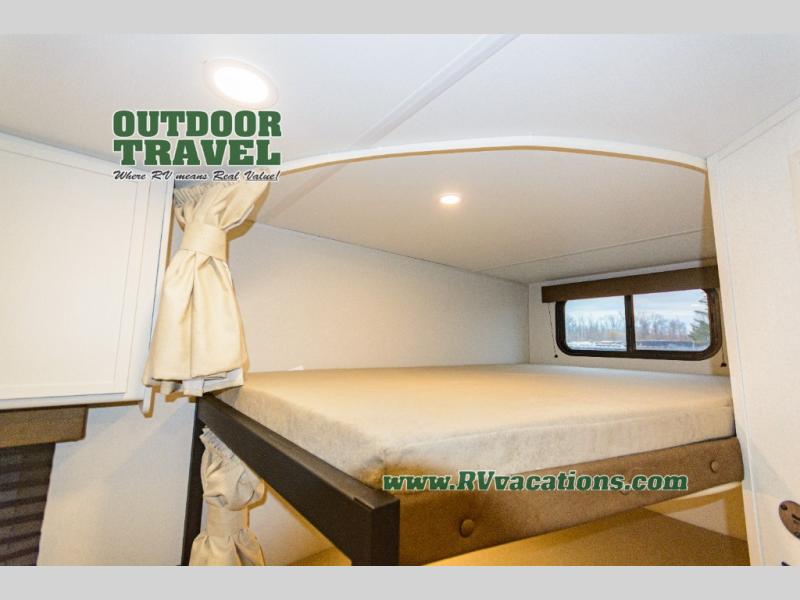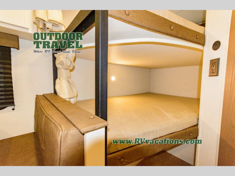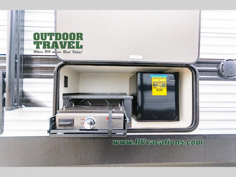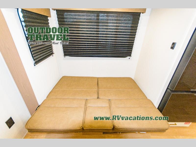 Camping with your larger family or when you want to take along a few extra friends is easy with this trailer. This unit sleeps nine with the double-size bunks in the rear corner, the 60" roll over sofa, and the queen bed in the front semi-private bedroom. The booth dinette can also be used to sleep a guest or two little ones at night once converted. Prepare your meals on the three-burner cooktop indoors, or out on the two-burner cooktop at the outside kitchen! You'll also find a handy exterior spray port and an outdoor refrigerator for cold drinks! It will be so easy to fill the dog's food bowl with the added pet dish under the refrigerator, and the full bath in this model means you don't have to use the camp's facilities. Having a 17' awning outside along with a large unobstructed pass-through compartment allows you extended living outdoors and plenty of space for all of your gear!