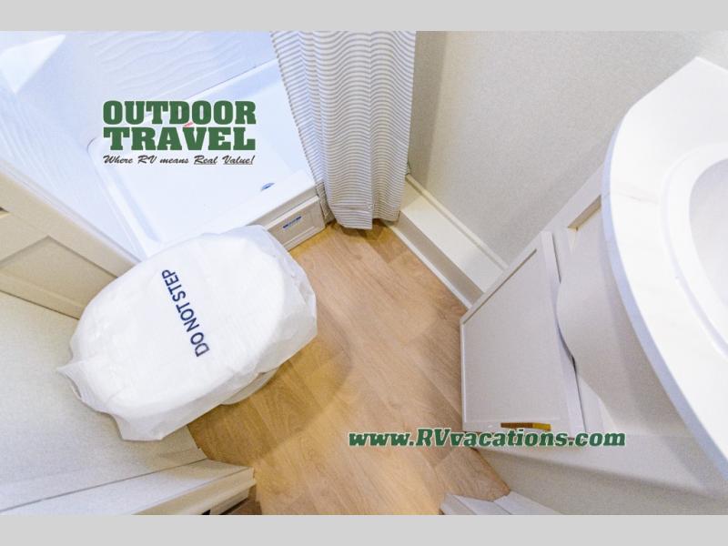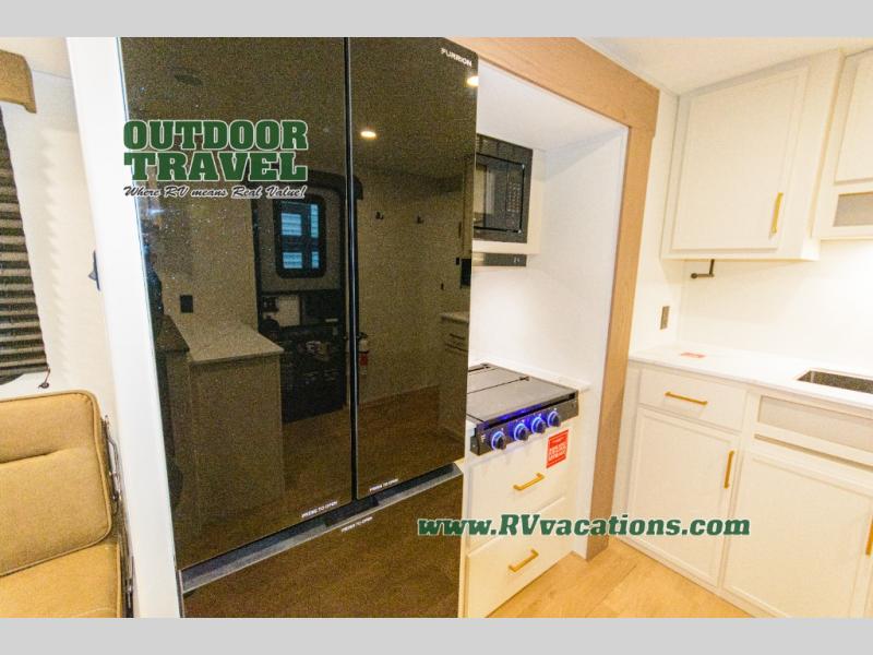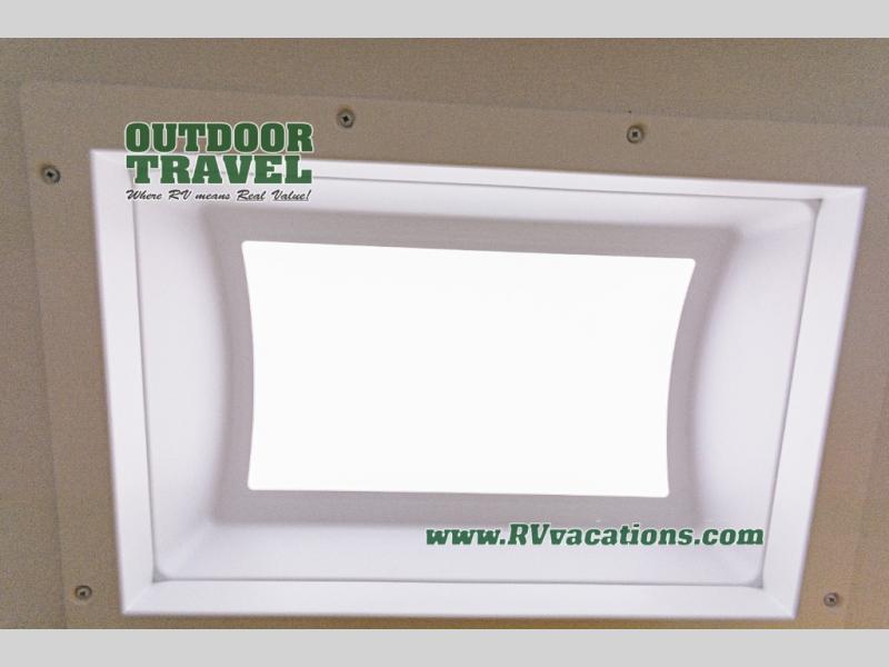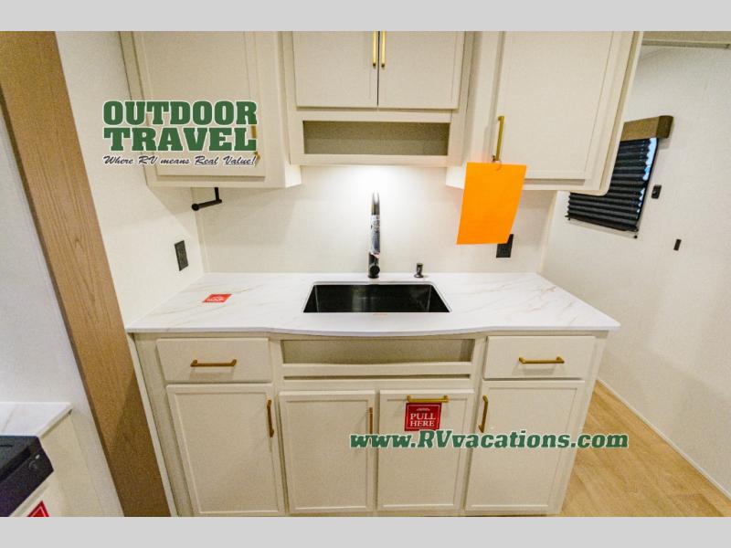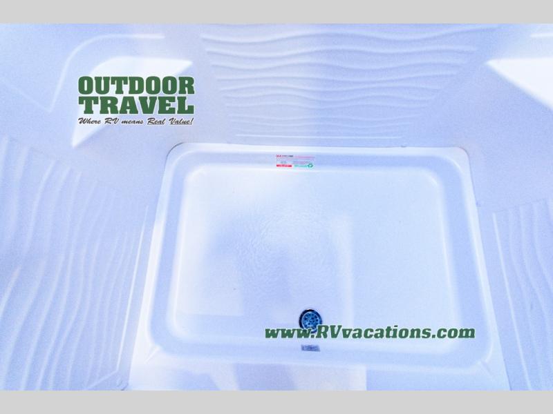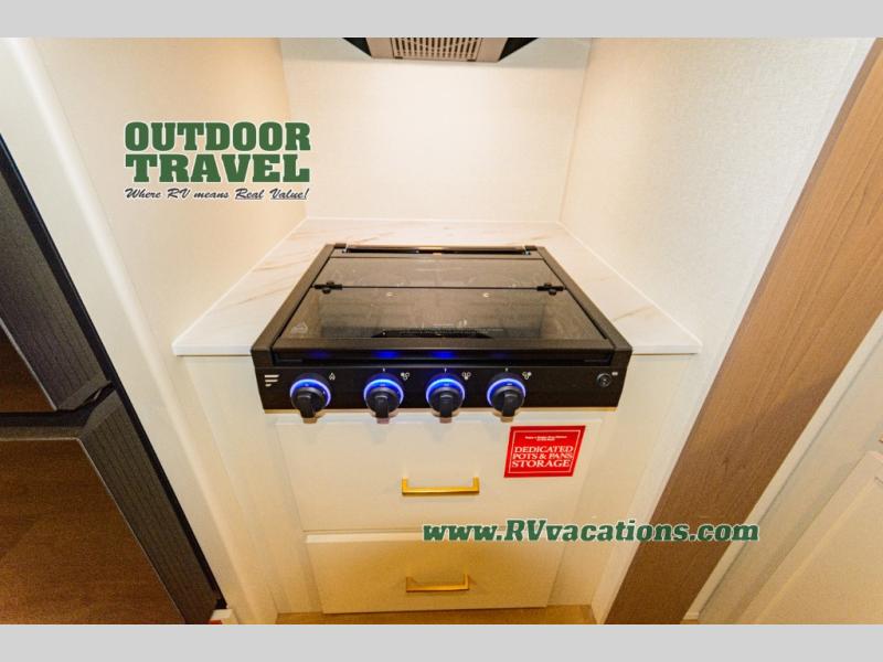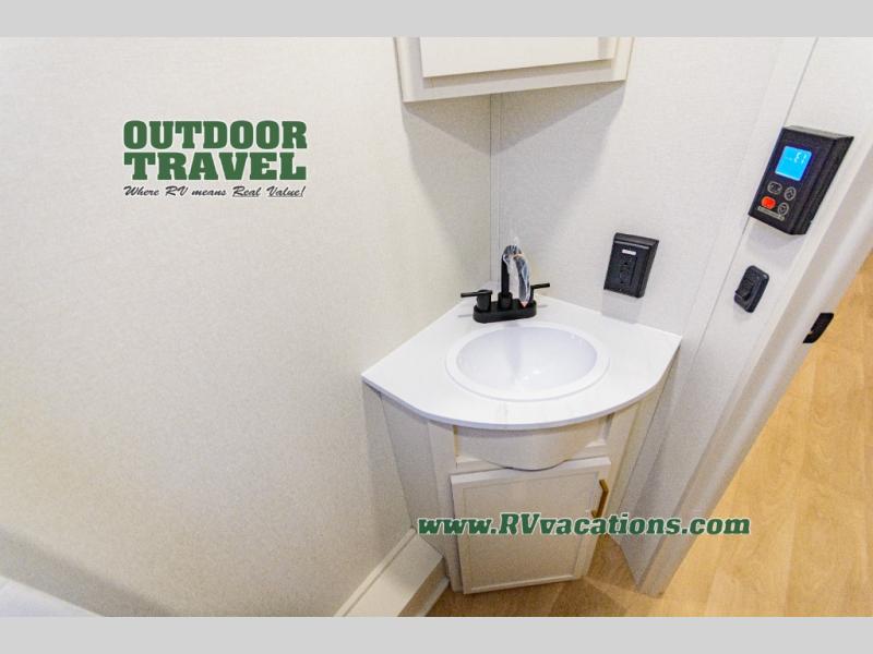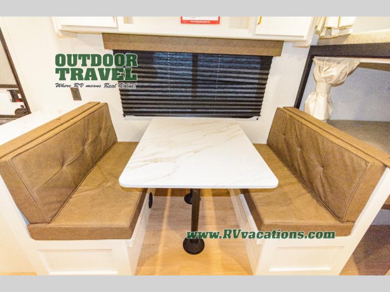 Camping with your larger family or when you want to take along a few extra friends is easy with this trailer. This unit sleeps nine with the double-size bunks in the rear corner, the 60" roll over sofa, and the queen bed in the front semi-private bedroom. The booth dinette can also be used to sleep a guest or two little ones at night once converted. Prepare your meals on the three-burner cooktop indoors, or out on the two-burner cooktop at the outside kitchen! You'll also find a handy exterior spray port and an outdoor refrigerator for cold drinks! It will be so easy to fill the dog's food bowl with the added pet dish under the refrigerator, and the full bath in this model means you don't have to use the camp's facilities. Having a 17' awning outside along with a large unobstructed pass-through compartment allows you extended living outdoors and plenty of space for all of your gear!