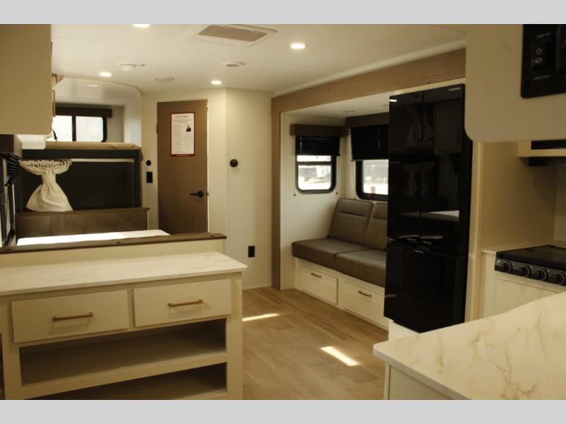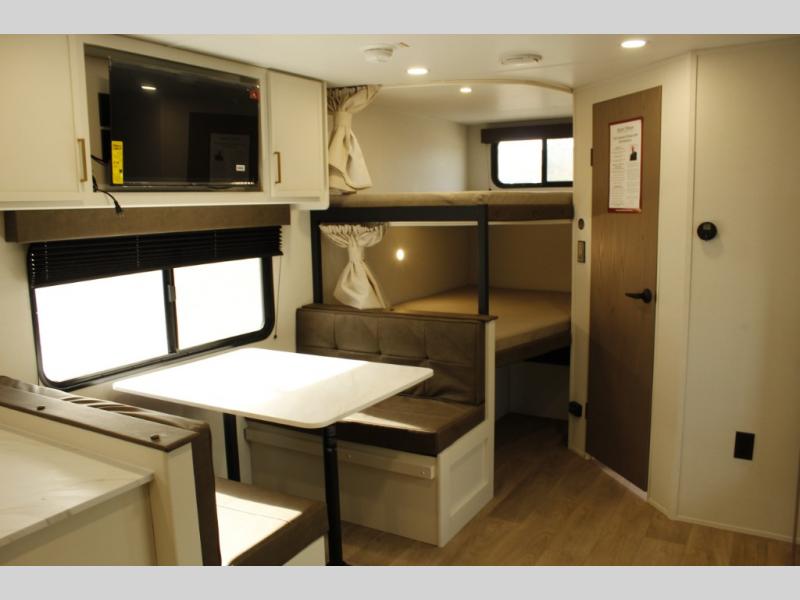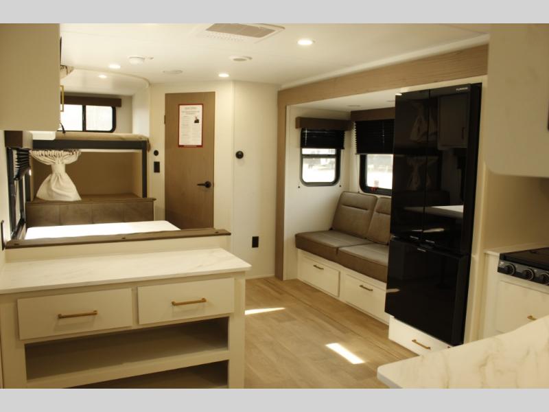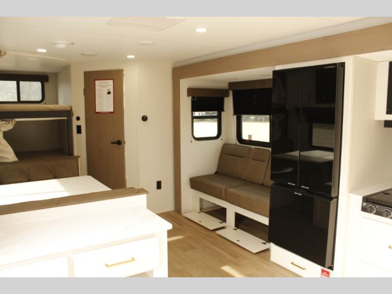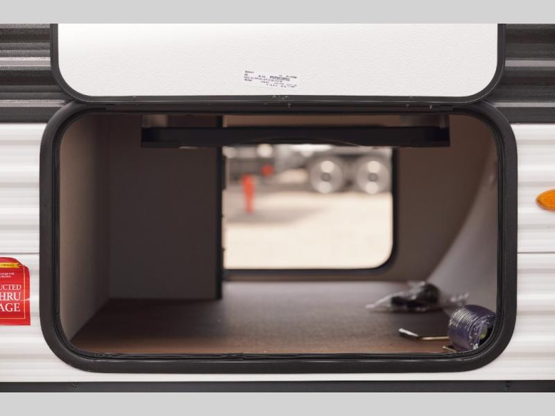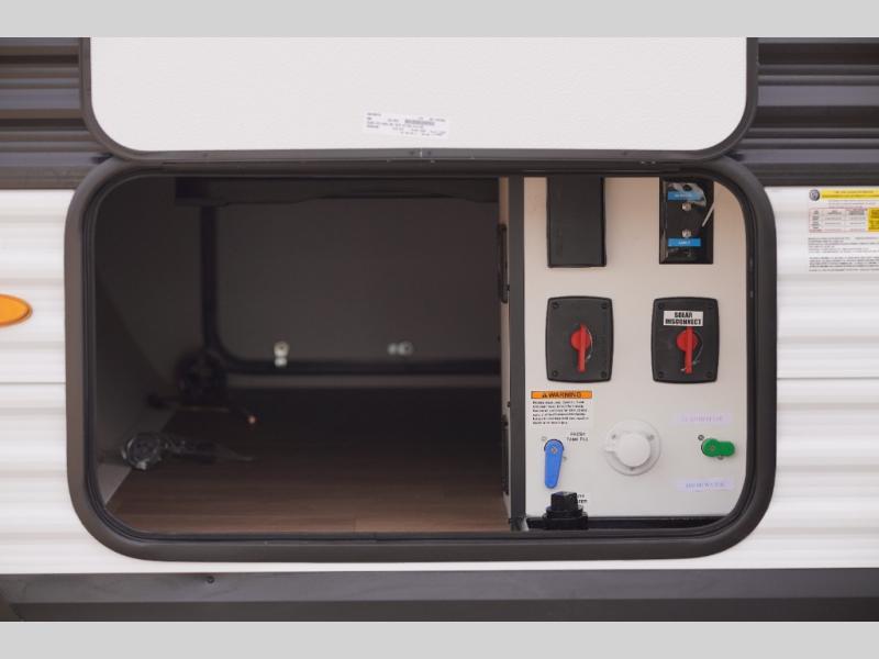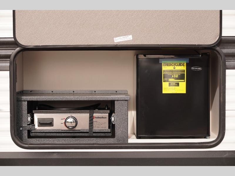 Camping with your larger family or when you want to take along a few extra friends is easy with this trailer. This unit sleeps nine with the double-size bunks in the rear corner, the 60" roll over sofa, and the queen bed in the front semi-private bedroom. The booth dinette can also be used to sleep a guest or two little ones at night once converted. Prepare your meals on the three-burner cooktop indoors, or out on the two-burner cooktop at the outside kitchen! You'll also find a handy exterior spray port and an outdoor refrigerator for cold drinks! It will be so easy to fill the dog's food bowl with the added pet dish under the refrigerator, and the full bath in this model means you don't have to use the camp's facilities. Having a 17' awning outside along with a large unobstructed pass-through compartment allows you extended living outdoors and plenty of space for all of your gear!