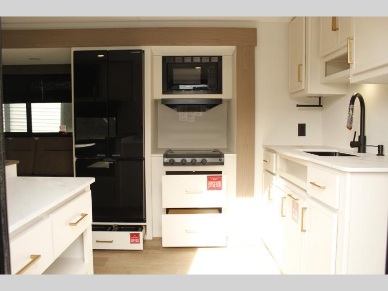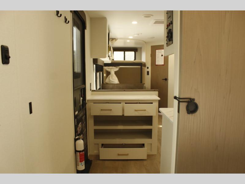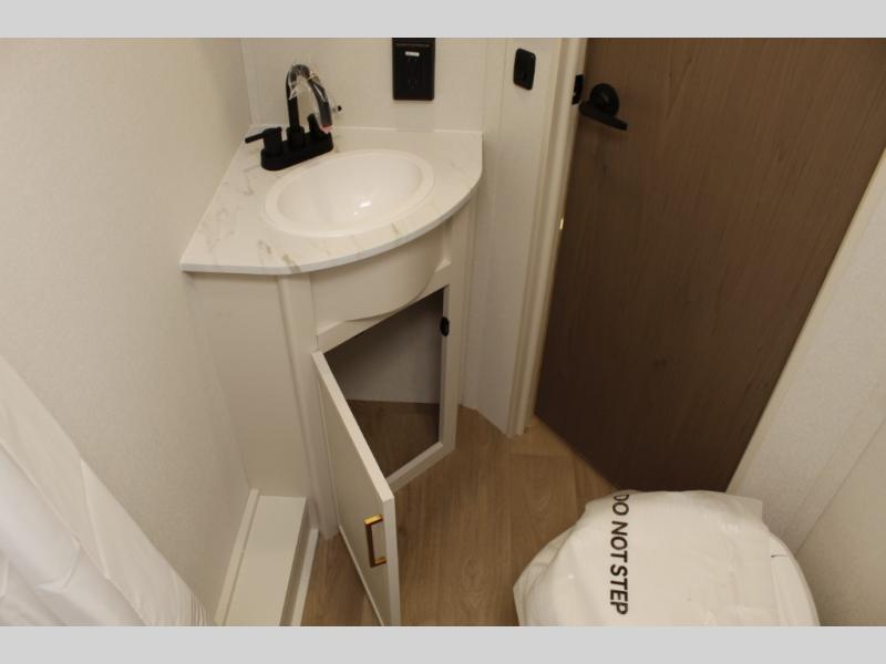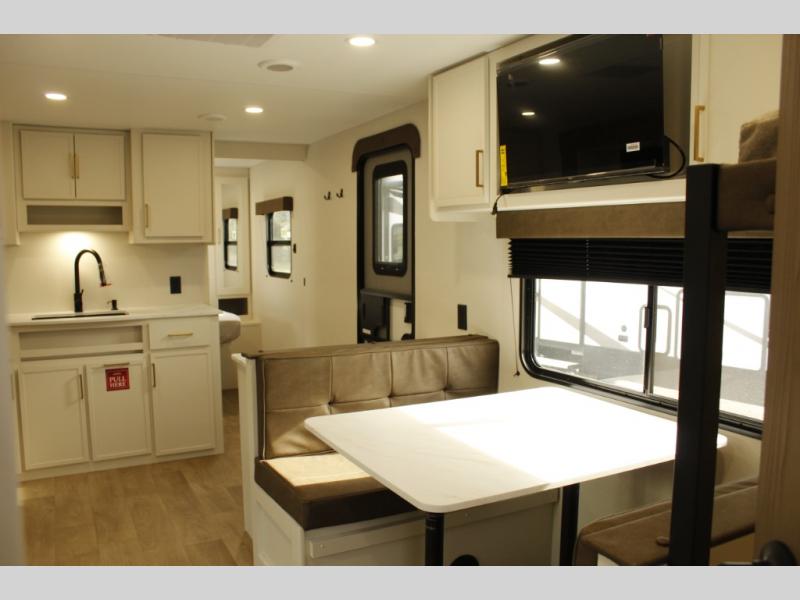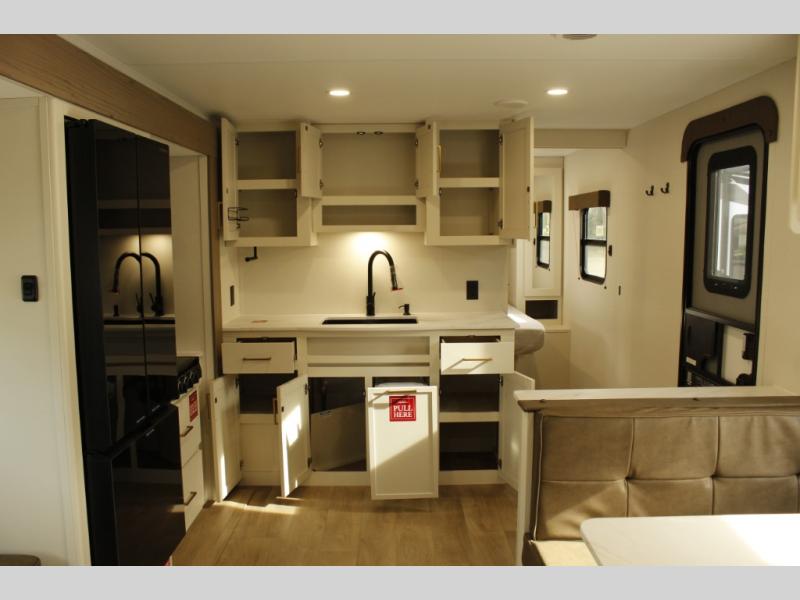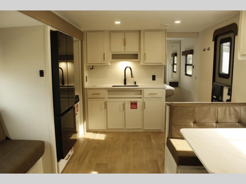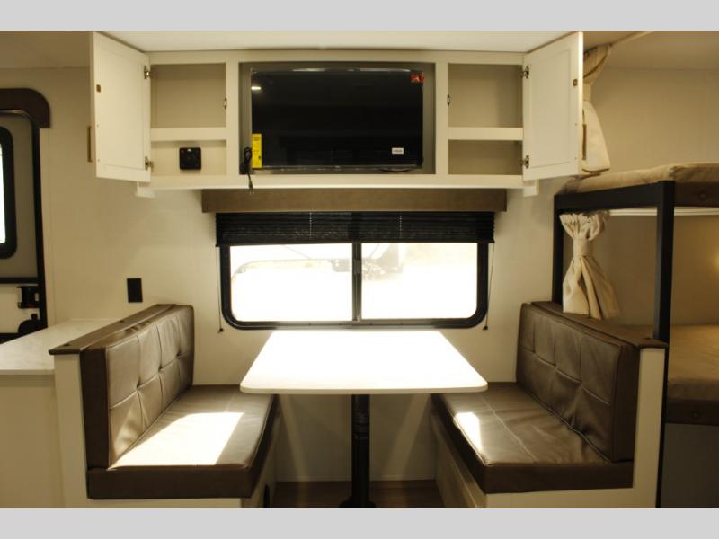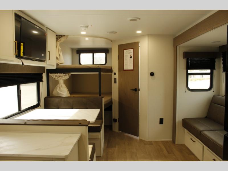 Camping with your larger family or when you want to take along a few extra friends is easy with this trailer. This unit sleeps nine with the double-size bunks in the rear corner, the 60" roll over sofa, and the queen bed in the front semi-private bedroom. The booth dinette can also be used to sleep a guest or two little ones at night once converted. Prepare your meals on the three-burner cooktop indoors, or out on the two-burner cooktop at the outside kitchen! You'll also find a handy exterior spray port and an outdoor refrigerator for cold drinks! It will be so easy to fill the dog's food bowl with the added pet dish under the refrigerator, and the full bath in this model means you don't have to use the camp's facilities. Having a 17' awning outside along with a large unobstructed pass-through compartment allows you extended living outdoors and plenty of space for all of your gear!
