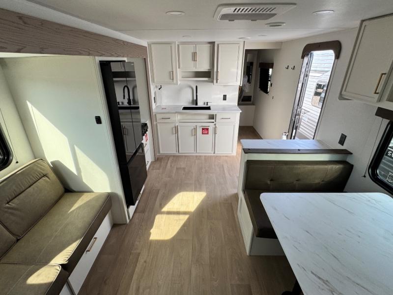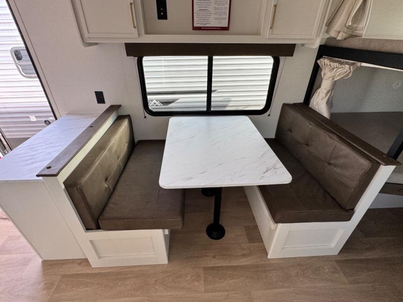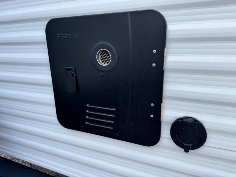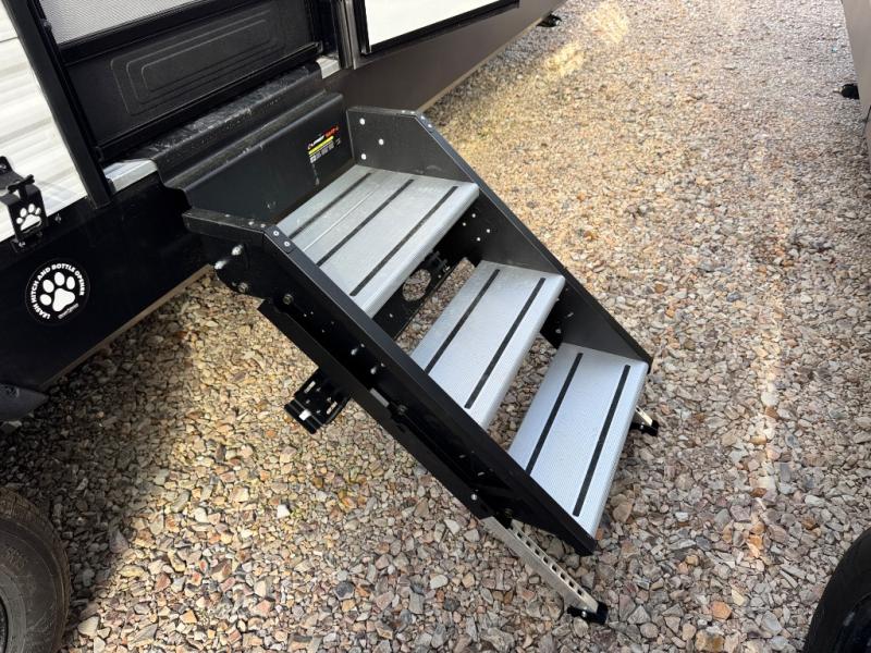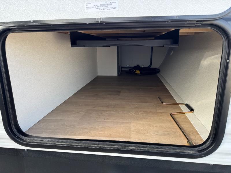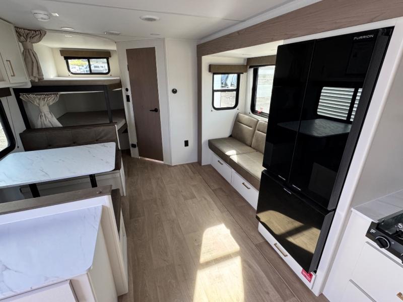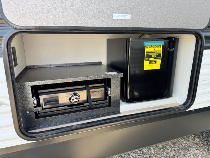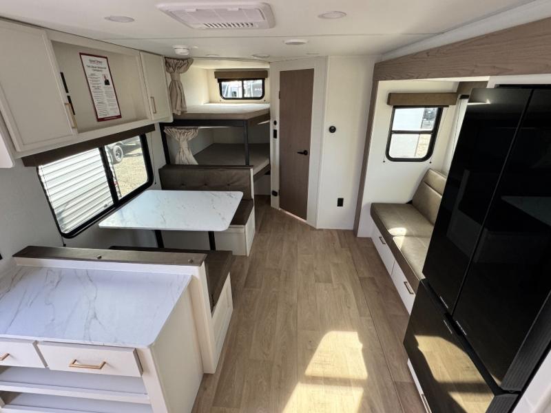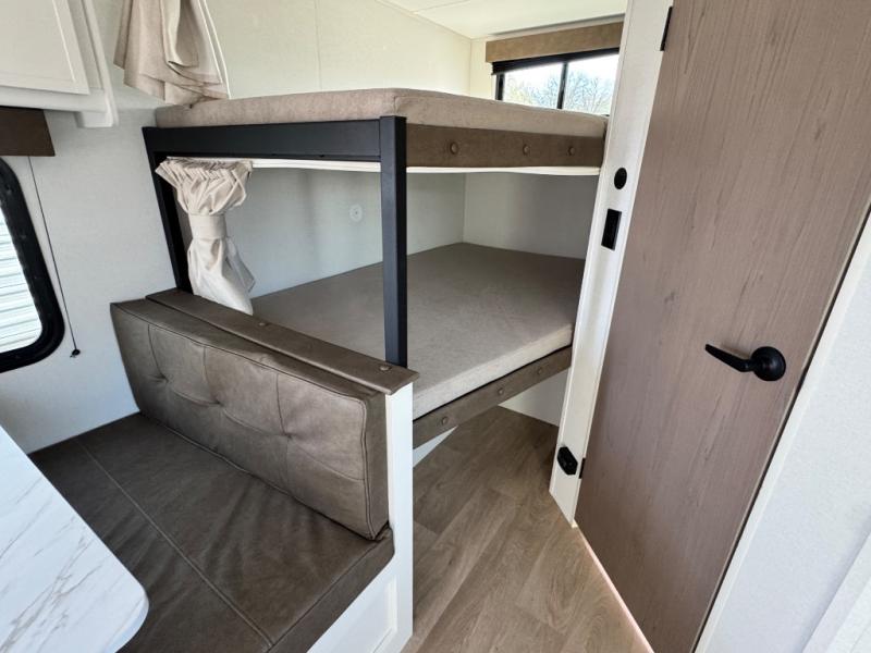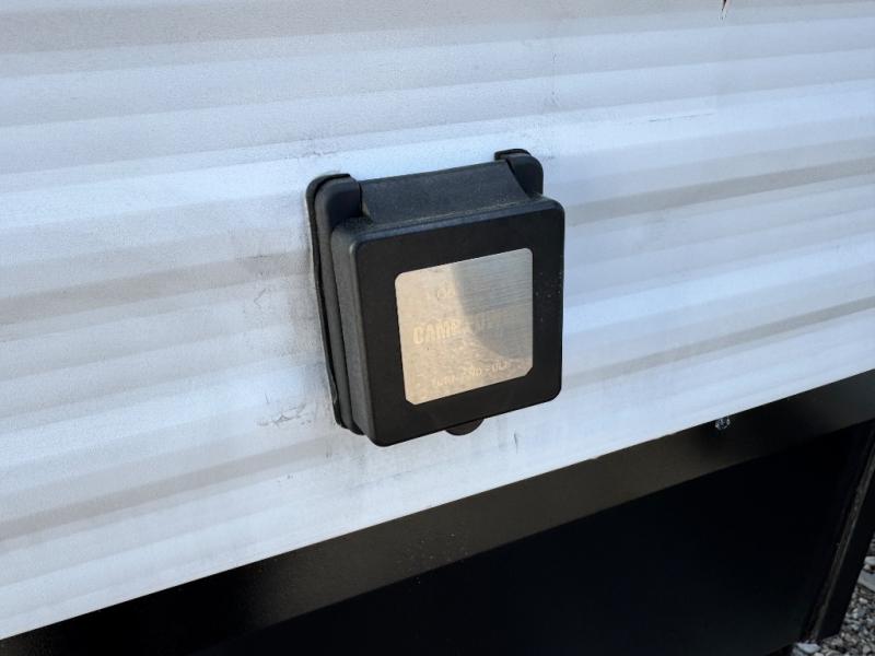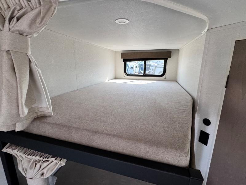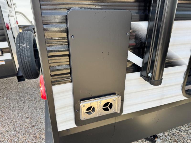 Camping with your larger family or when you want to take along a few extra friends is easy with this trailer. This unit sleeps nine with the double-size bunks in the rear corner, the 60" roll over sofa, and the queen bed in the front semi-private bedroom. The booth dinette can also be used to sleep a guest or two little ones at night once converted. Prepare your meals on the three-burner cooktop indoors, or out on the two-burner cooktop at the outside kitchen! You'll also find a handy exterior spray port and an outdoor refrigerator for cold drinks! It will be so easy to fill the dog's food bowl with the added pet dish under the refrigerator, and the full bath in this model means you don't have to use the camp's facilities. Having a 17' awning outside along with a large unobstructed pass-through compartment allows you extended living outdoors and plenty of space for all of your gear!