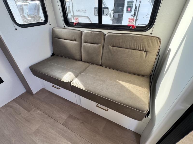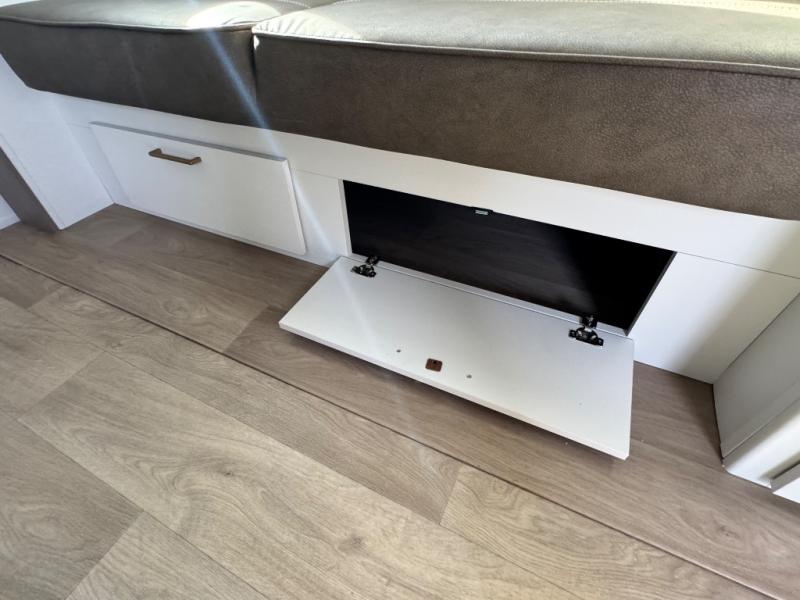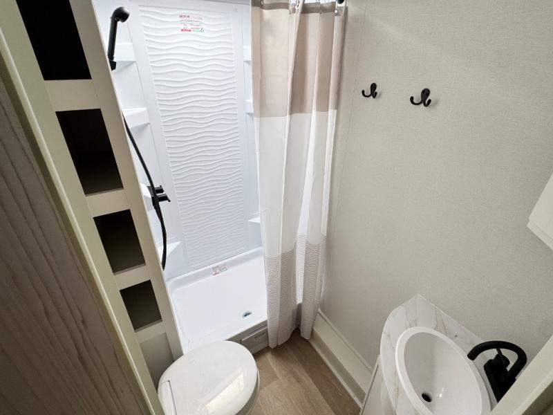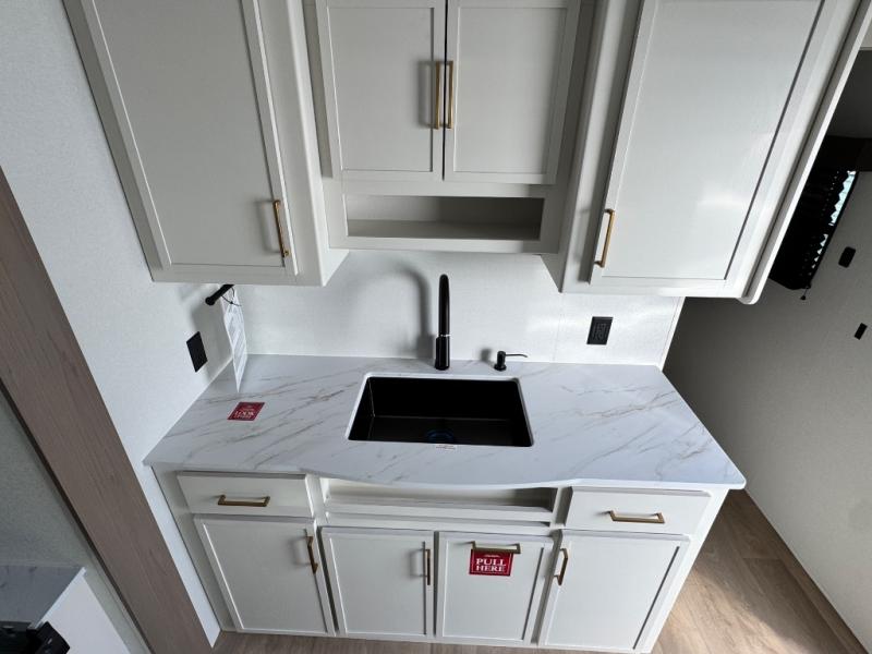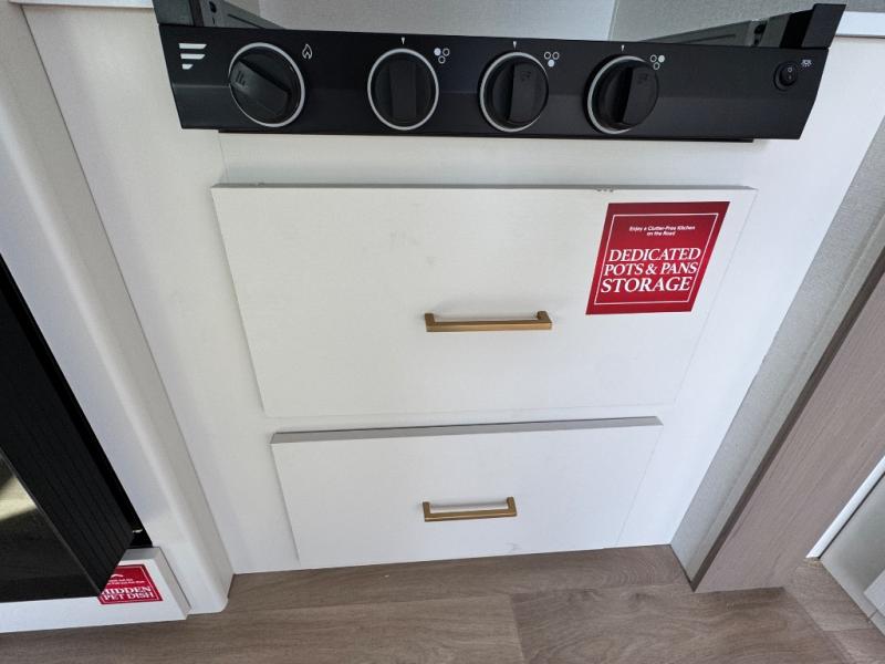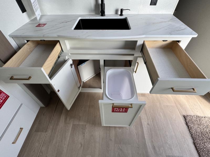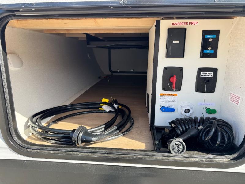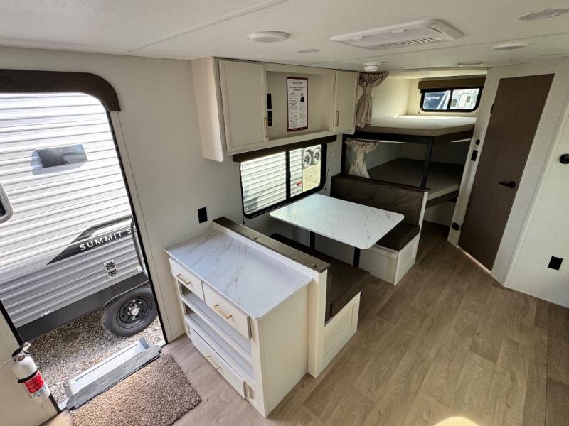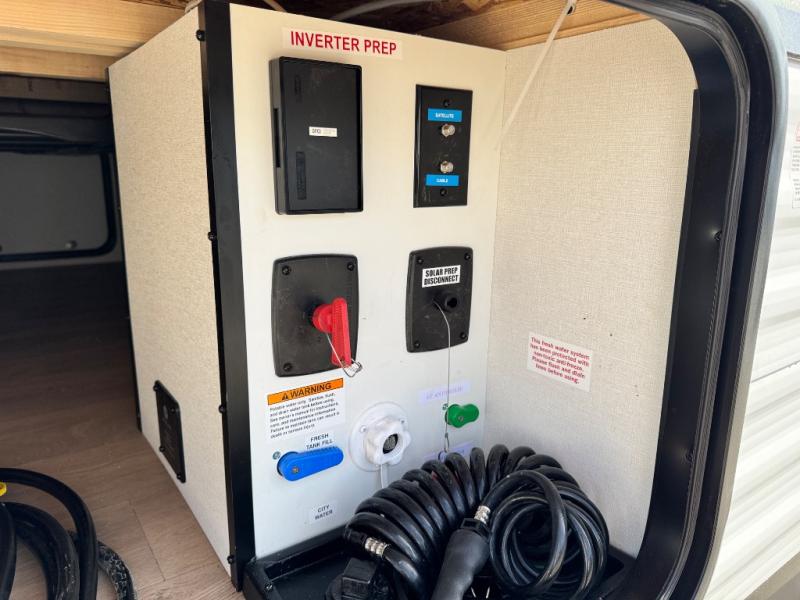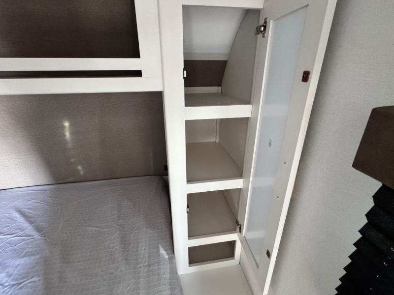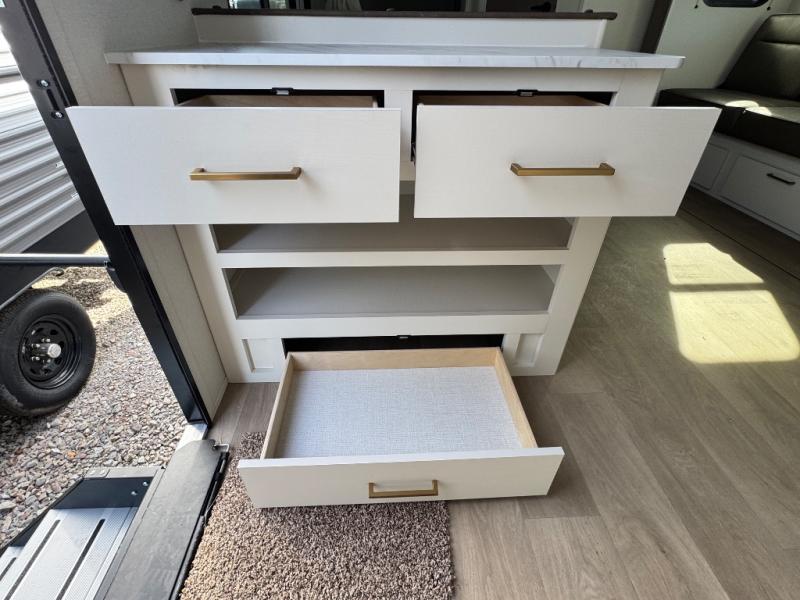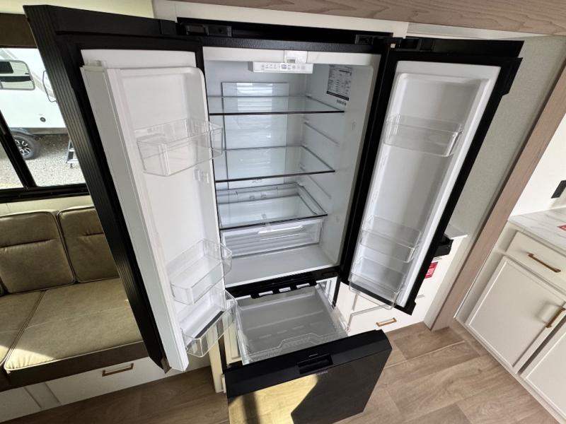 Camping with your larger family or when you want to take along a few extra friends is easy with this trailer. This unit sleeps nine with the double-size bunks in the rear corner, the 60" roll over sofa, and the queen bed in the front semi-private bedroom. The booth dinette can also be used to sleep a guest or two little ones at night once converted. Prepare your meals on the three-burner cooktop indoors, or out on the two-burner cooktop at the outside kitchen! You'll also find a handy exterior spray port and an outdoor refrigerator for cold drinks! It will be so easy to fill the dog's food bowl with the added pet dish under the refrigerator, and the full bath in this model means you don't have to use the camp's facilities. Having a 17' awning outside along with a large unobstructed pass-through compartment allows you extended living outdoors and plenty of space for all of your gear!