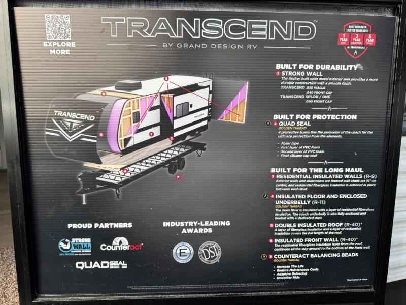 The customer-focused, quality-built Transcend Xplor travel trailers by Grand Design are your ticket to fun and adventure. You will appreciate the power tongue jack when it comes time to set up, as well as the all-in-one utility center and the detachable power cord with an LED light. These models include many outlets throughout, USB ports to charge your gadgets, and a JBL exterior speaker to listen to your favorite tunes. The interior of the Transcend Xplor will have you feeling right at home with upgraded residential furniture, residential countertops, residential cabinet doors, and the list goes on!