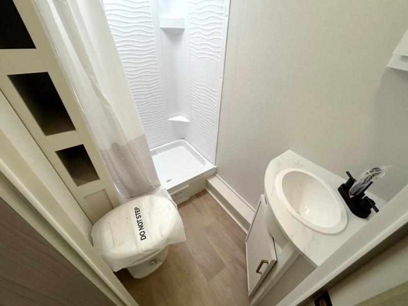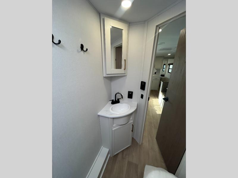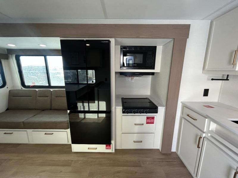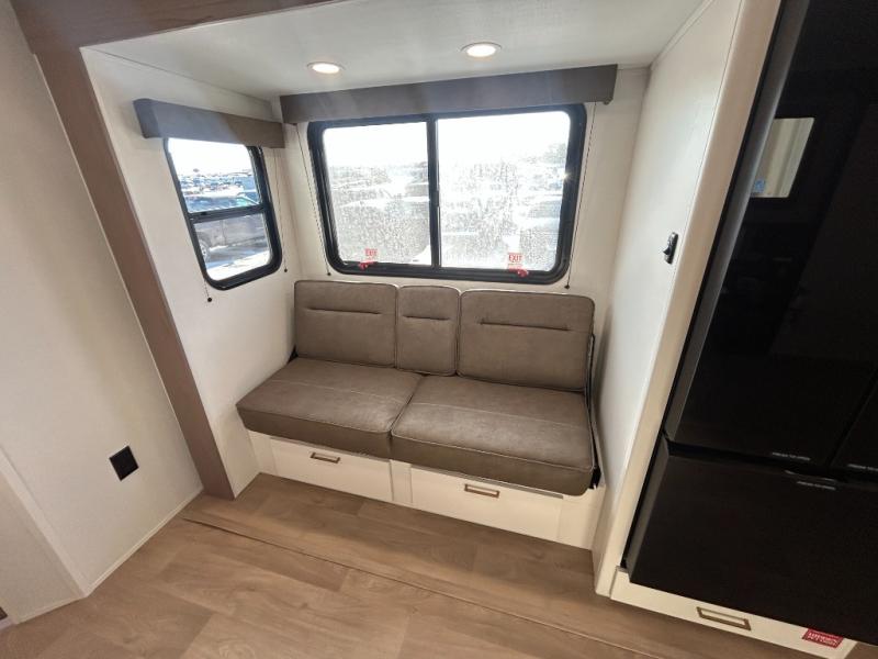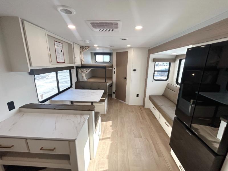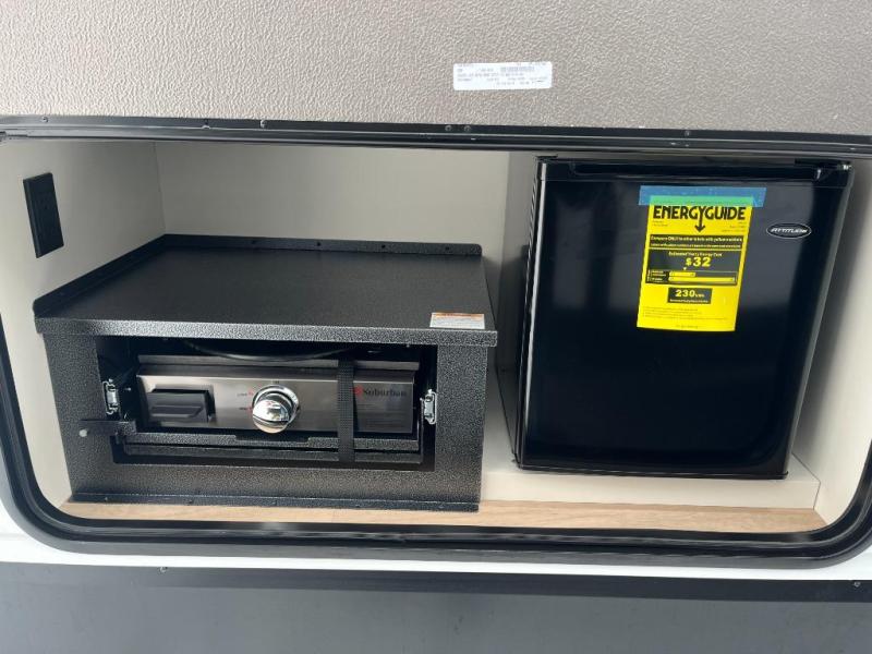 Camping with your larger family or when you want to take along a few extra friends is easy with this trailer. This unit sleeps nine with the double-size bunks in the rear corner, the 60" roll over sofa, and the queen bed in the front semi-private bedroom. The booth dinette can also be used to sleep a guest or two little ones at night once converted. Prepare your meals on the three-burner cooktop indoors, or out on the two-burner cooktop at the outside kitchen! You'll also find a handy exterior spray port and an outdoor refrigerator for cold drinks! It will be so easy to fill the dog's food bowl with the added pet dish under the refrigerator, and the full bath in this model means you don't have to use the camp's facilities. Having a 17' awning outside along with a large unobstructed pass-through compartment allows you extended living outdoors and plenty of space for all of your gear!
