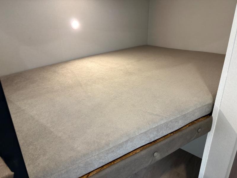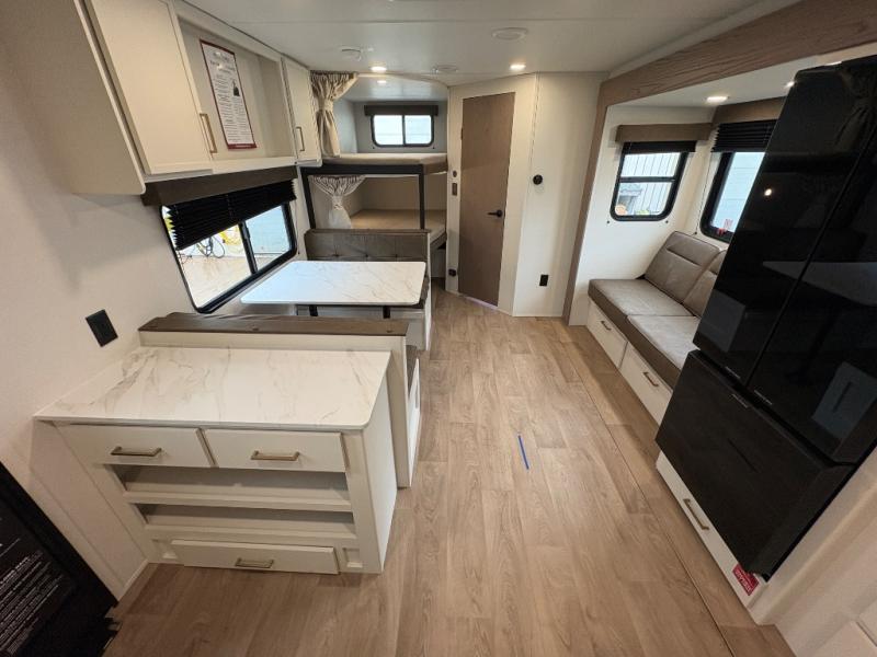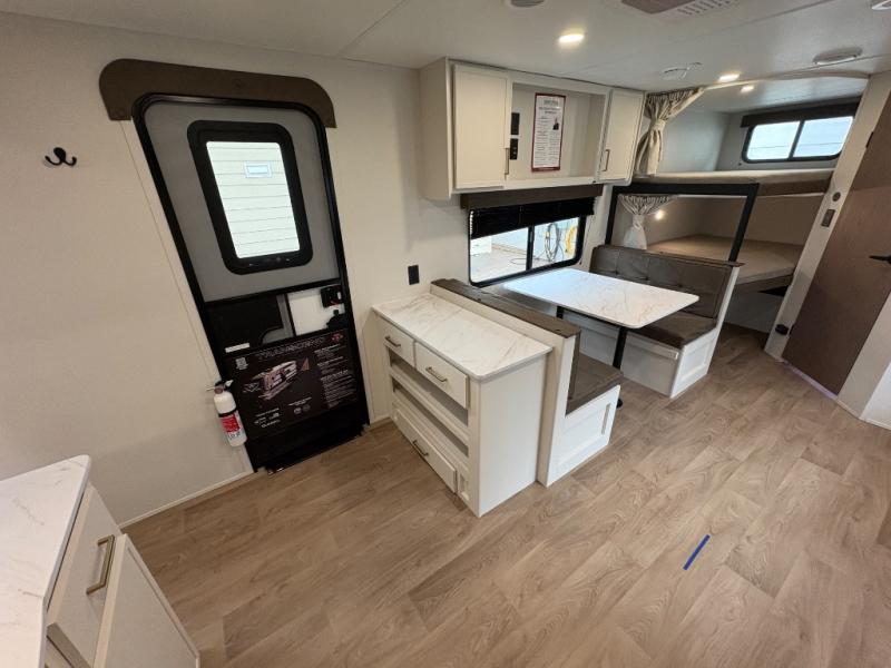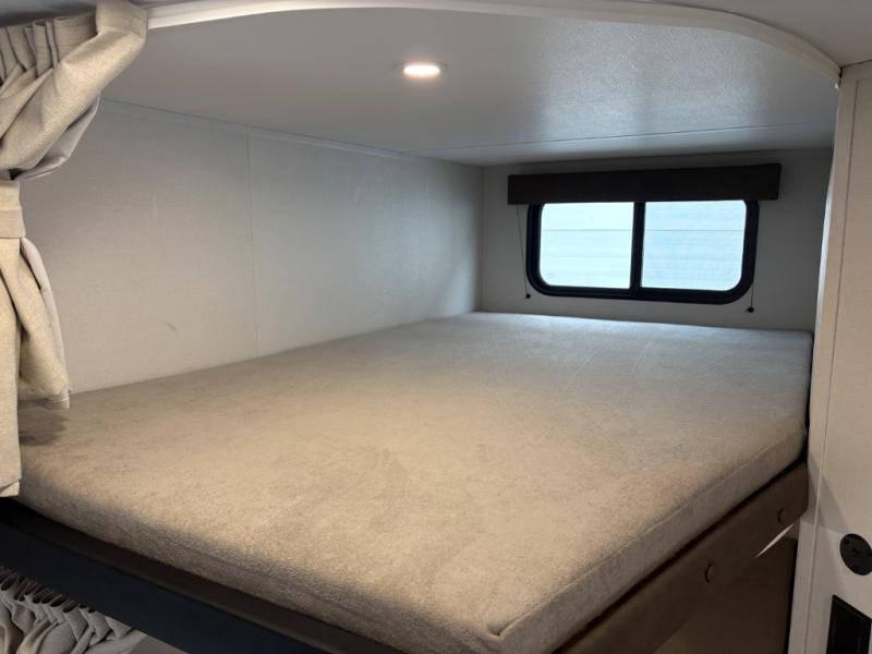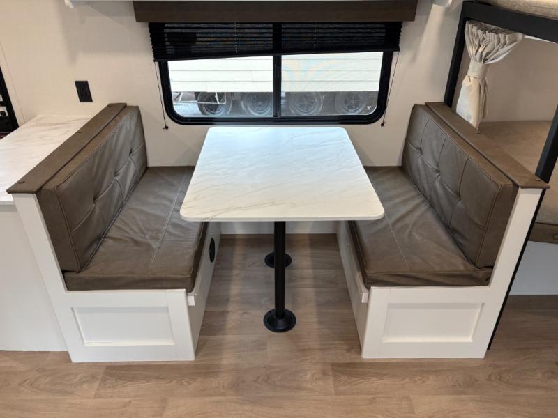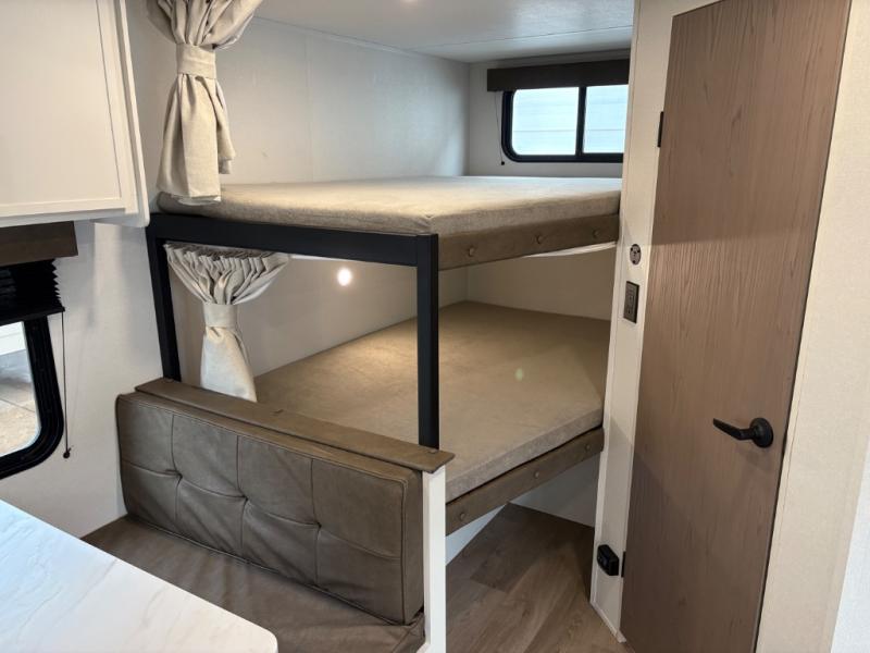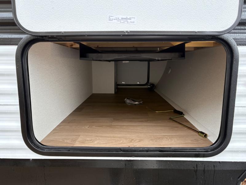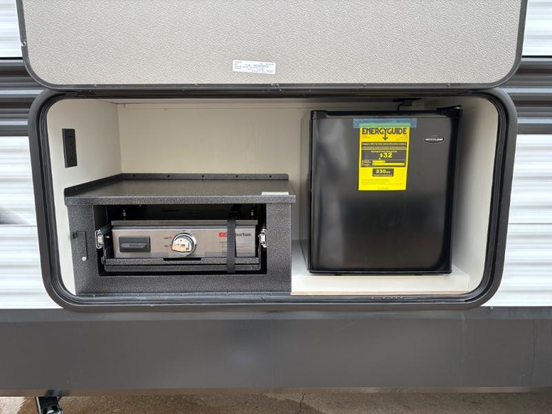 Camping with your larger family or when you want to take along a few extra friends is easy with this trailer. This unit sleeps nine with the double-size bunks in the rear corner, the 60" roll over sofa, and the queen bed in the front semi-private bedroom. The booth dinette can also be used to sleep a guest or two little ones at night once converted. Prepare your meals on the three-burner cooktop indoors, or out on the two-burner cooktop at the outside kitchen! You'll also find a handy exterior spray port and an outdoor refrigerator for cold drinks! It will be so easy to fill the dog's food bowl with the added pet dish under the refrigerator, and the full bath in this model means you don't have to use the camp's facilities. Having a 17' awning outside along with a large unobstructed pass-through compartment allows you extended living outdoors and plenty of space for all of your gear!