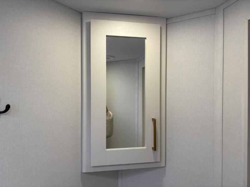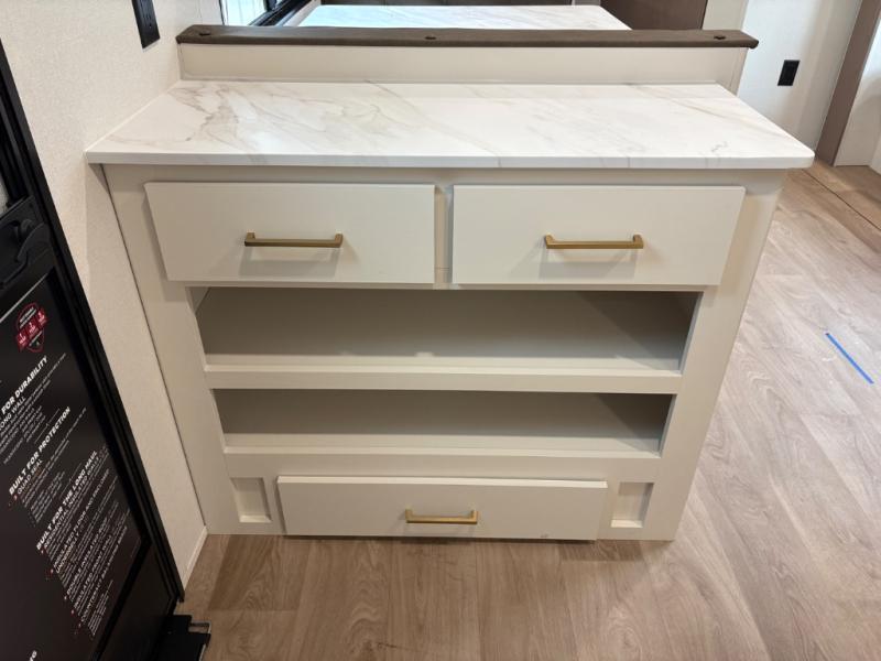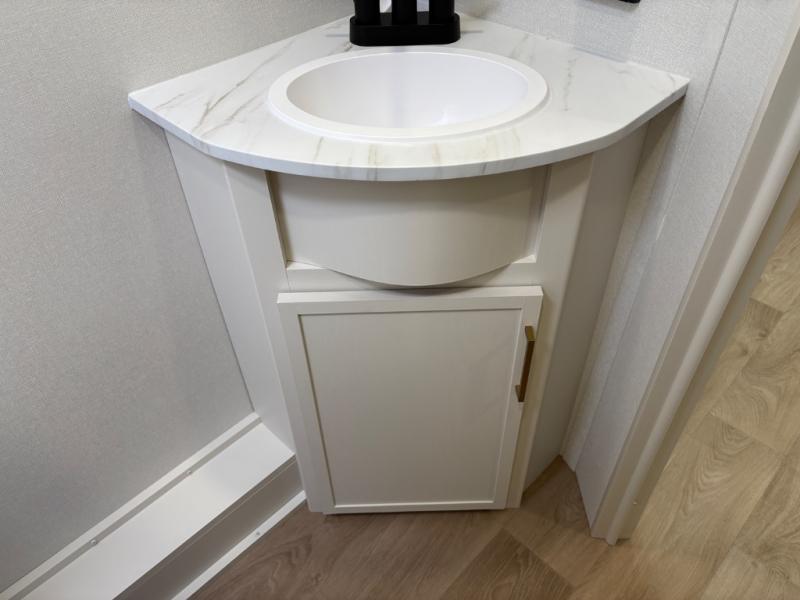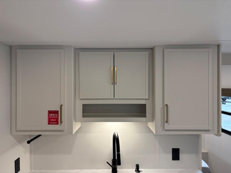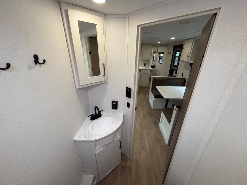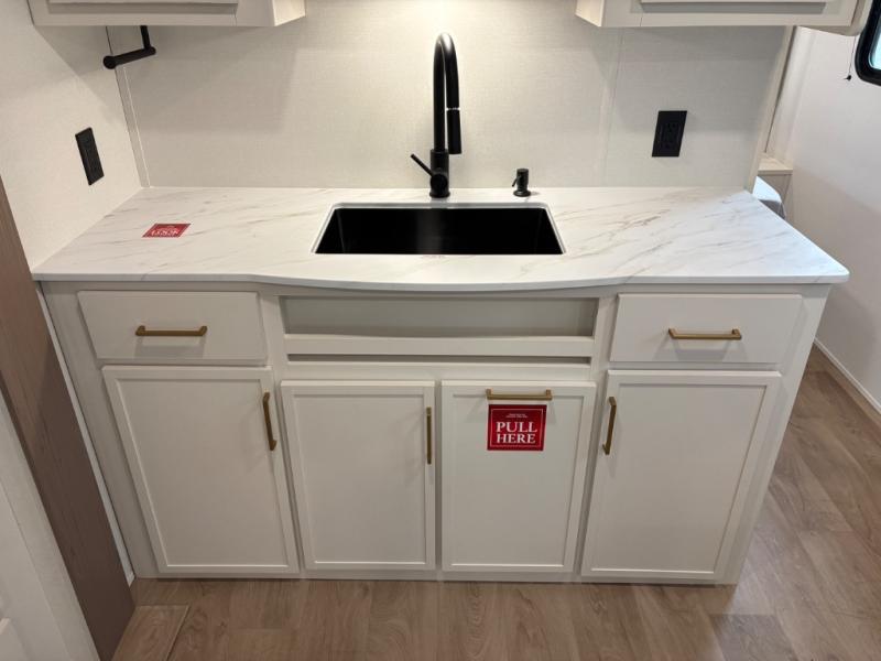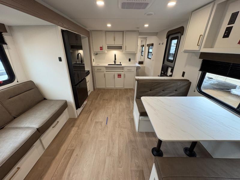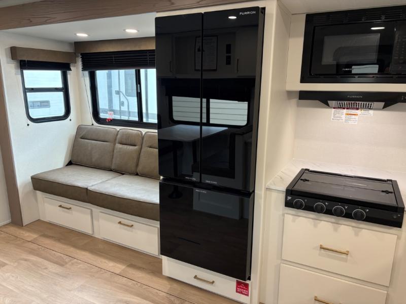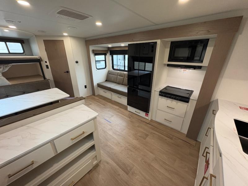 Camping with your larger family or when you want to take along a few extra friends is easy with this trailer. This unit sleeps nine with the double-size bunks in the rear corner, the 60" roll over sofa, and the queen bed in the front semi-private bedroom. The booth dinette can also be used to sleep a guest or two little ones at night once converted. Prepare your meals on the three-burner cooktop indoors, or out on the two-burner cooktop at the outside kitchen! You'll also find a handy exterior spray port and an outdoor refrigerator for cold drinks! It will be so easy to fill the dog's food bowl with the added pet dish under the refrigerator, and the full bath in this model means you don't have to use the camp's facilities. Having a 17' awning outside along with a large unobstructed pass-through compartment allows you extended living outdoors and plenty of space for all of your gear!