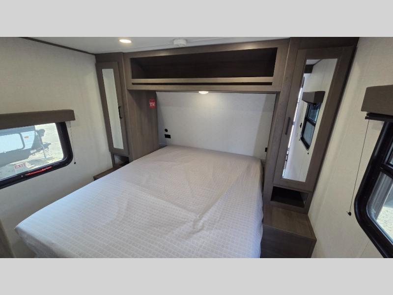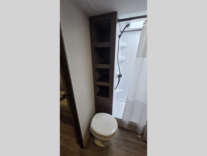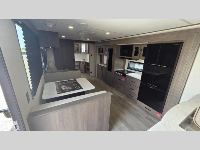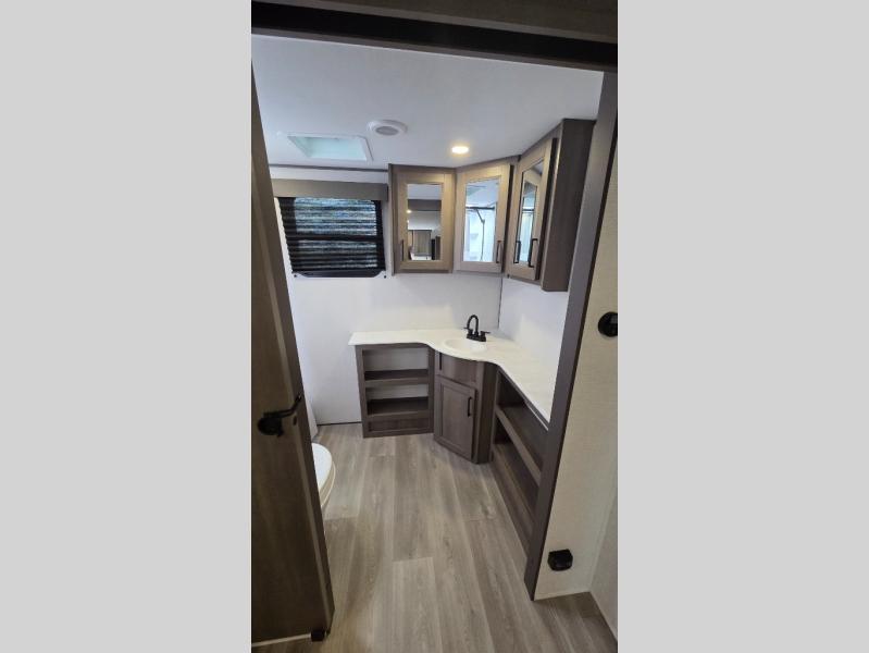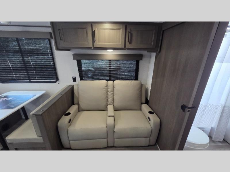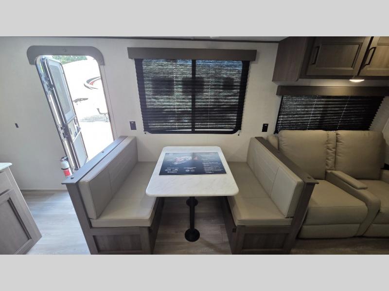 Your search for the perfect couple's trailer is over with this RV in tow! You will enjoy your own private bedroom up front with a queen bed, overhead storage, and TV prep if you choose to bring along your own television. The spacious full rear bath includes a linen closet and a walk-in shower to easily clean up each day. Relax on the 60" sleeper sofa after a long day outdoors, or you can choose the optional theater seating if you don't need additional sleeping space. The booth dinette can also be used for an overnight guest or two little ones. This model also includes plenty of storage space and plenty of counter space to prep and cook at-home meals! Finally relax under the shade of the massive 19' awning.