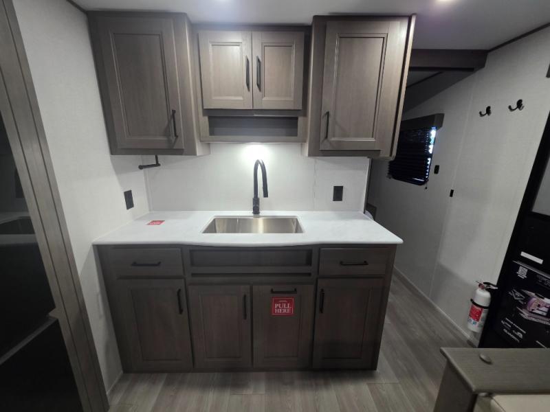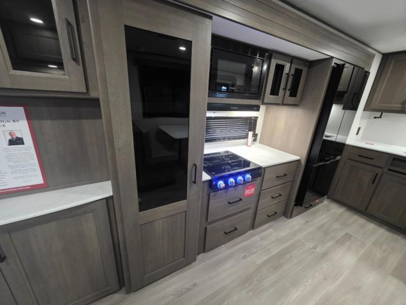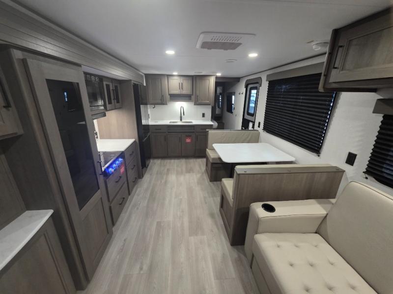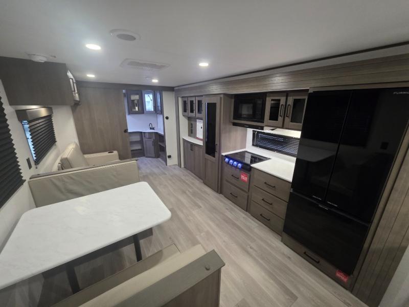 Relax in the heart of the unit, where a spacious slide-out expands your living space to include a 60" sleeper sofa (or optional theater seating) and a roomy booth dinette. Large panoramic windows flood the space with natural light, perfect for enjoying campground views in comfort.