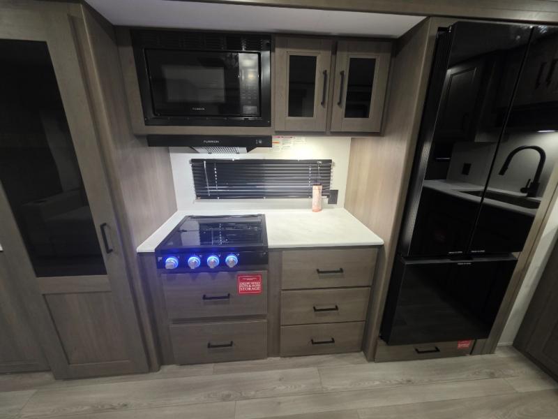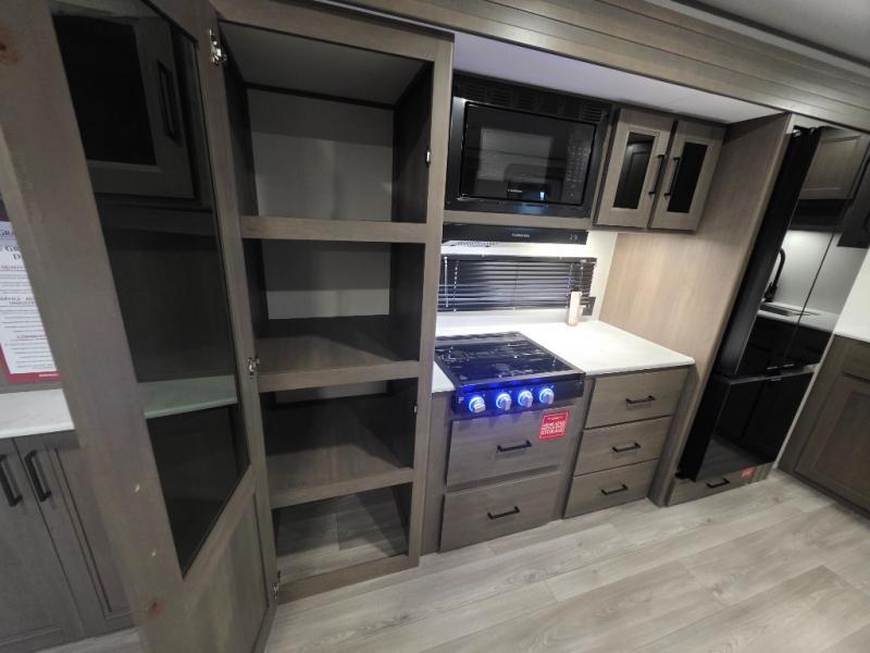 Cook up delicious meals with the three-burner range, microwave, oven, deep farmhouse sink, and 12V refrigerator. Ample upper and lower cabinetry, a pull-out trash bin, and even a designated pet dish area ensure that everything (and everyone) has its place.