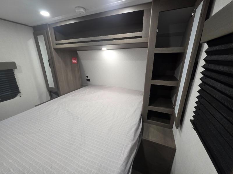 At the front of the trailer, the 60" x 80" queen-size bed is flanked by nightstands and wardrobe closets, plus overhead cabinets for extra storage. TV prep is already installed, and with its own exterior entry door, it's your quiet retreat away from the activity of the main living area.
