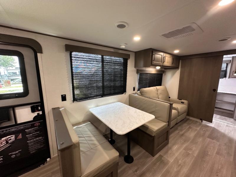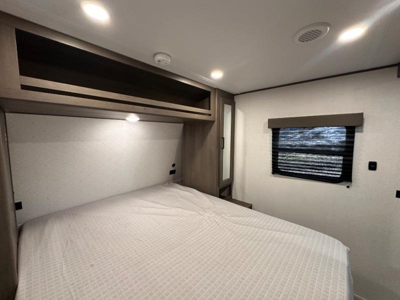 Your search for the perfect couple's trailer is over with this RV in tow! You will enjoy your own private bedroom up front with a queen bed, overhead storage, and TV prep if you choose to bring along your own television. The spacious full rear bath includes a linen closet and a walk-in shower to easily clean up each day. Relax on the 60" sleeper sofa after a long day outdoors, or you can choose the optional theater seating if you don't need additional sleeping space. The booth dinette can also be used for an overnight guest or two little ones. This model also includes plenty of storage space and plenty of counter space to prep and cook at-home meals! Finally relax under the shade of the massive 19' awning.
