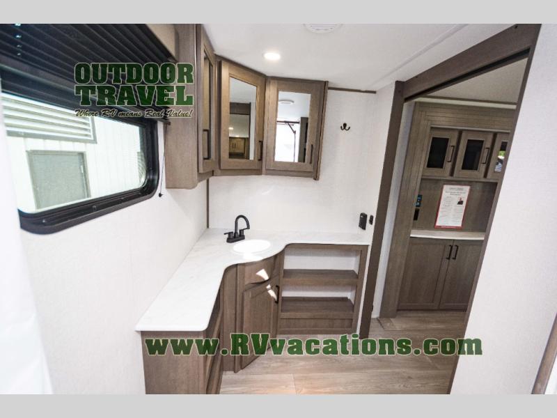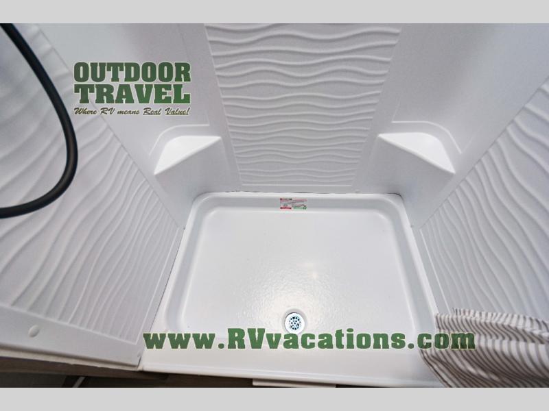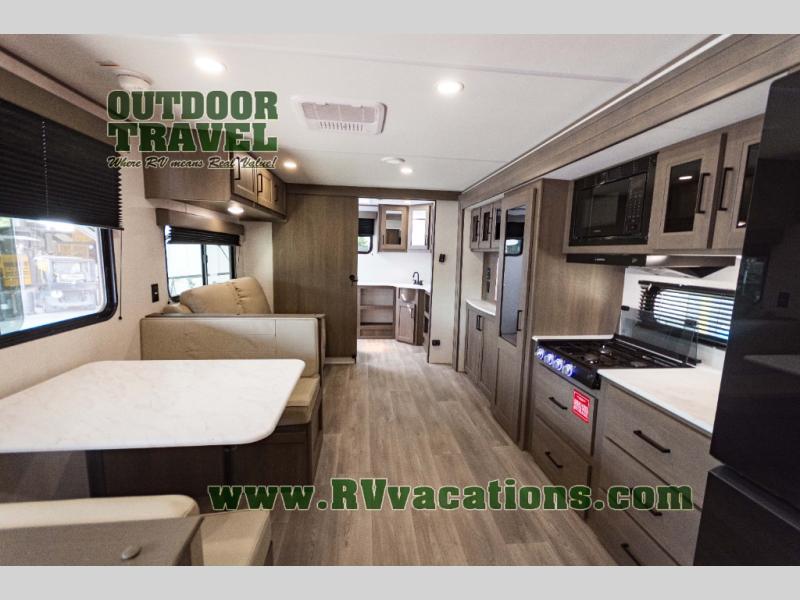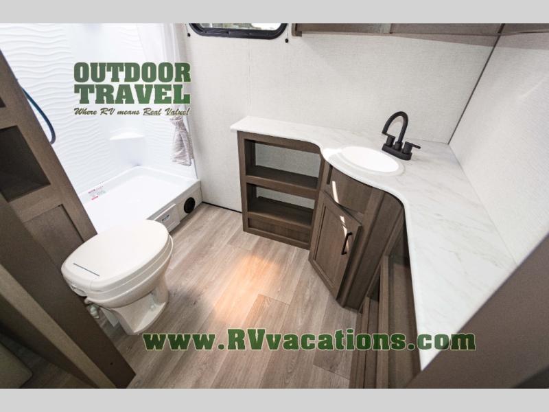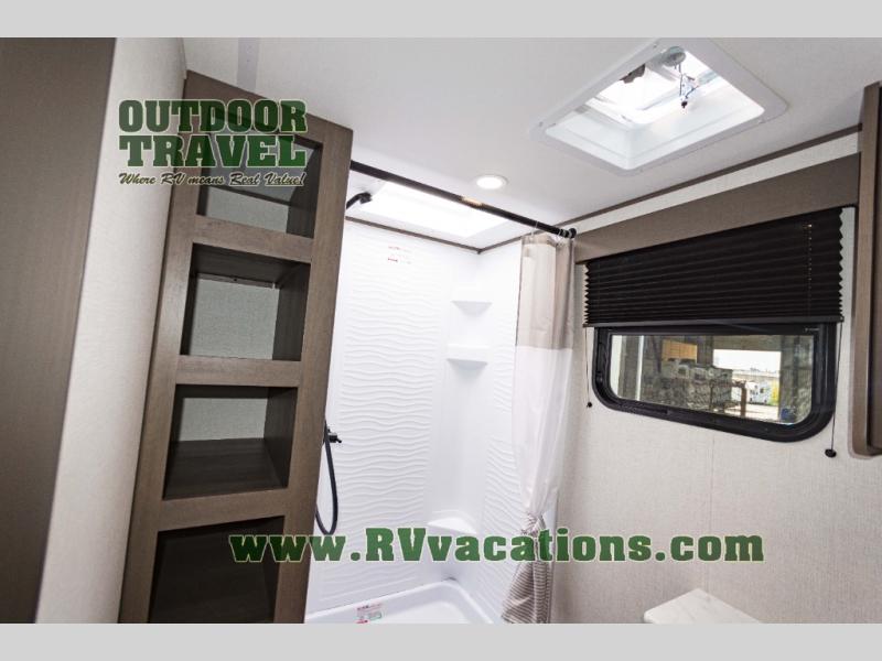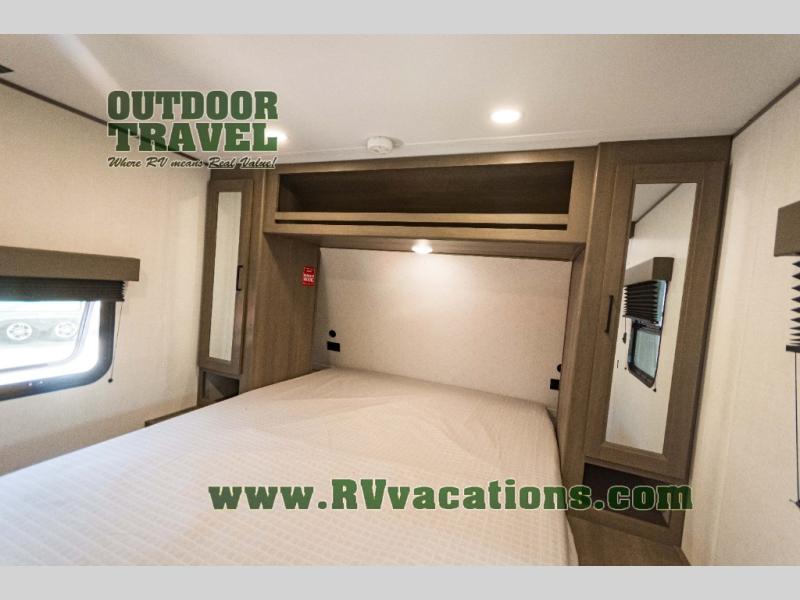 Your search for the perfect couple's trailer is over with this RV in tow! You will enjoy your own private bedroom up front with a queen bed, overhead storage, and TV prep if you choose to bring along your own television. The spacious full rear bath includes a linen closet and a walk-in shower to easily clean up each day. Relax on the 60" sleeper sofa after a long day outdoors, or you can choose the optional theater seating if you don't need additional sleeping space. The booth dinette can also be used for an overnight guest or two little ones. This model also includes plenty of storage space and plenty of counter space to prep and cook at-home meals! Finally relax under the shade of the massive 19' awning.