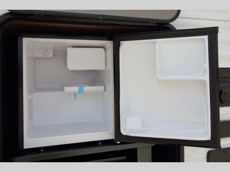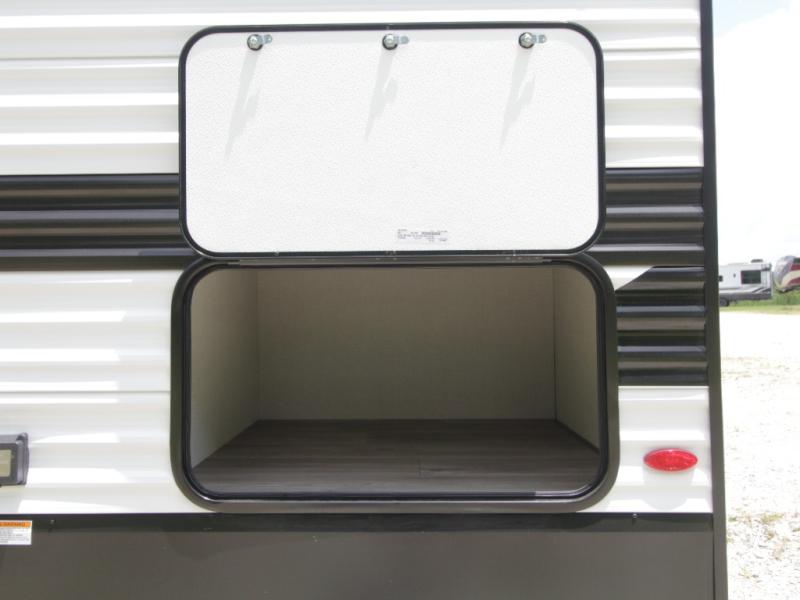 Enjoy the outdoors with an exterior griddle and 1.7 cu. ft. mini fridge, protected by the 19' power awning with LED lighting. Large pass-through storage and two entry/exit doors provide added convenience for gear access and guest flow.